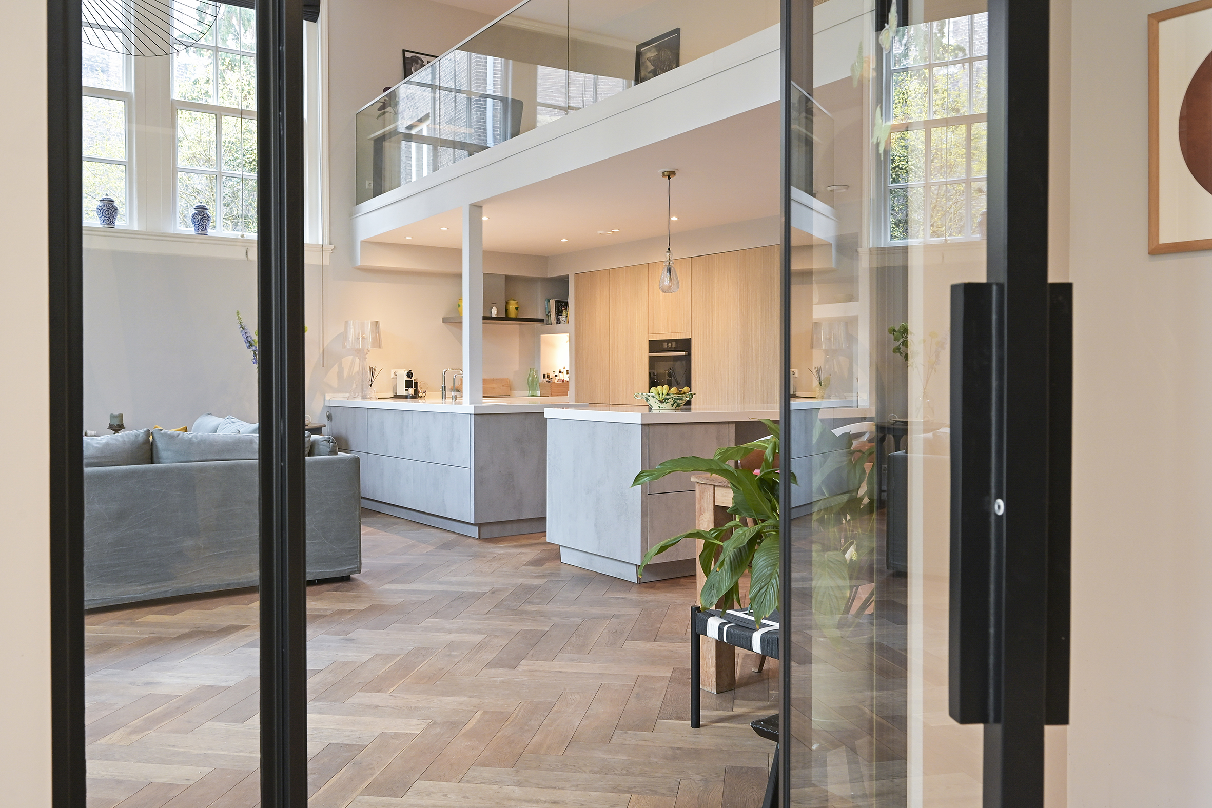 De 1e verdieping bestaat uit een grote L-vormige vide die op verschillende wijze kan worden benut. Thans zijn hier twee heerlijke lichte werkplekken gesitueerd maar mocht men behoefte hebben aan extra slaapkamers dan kunnen deze hier worden gecreëerd.