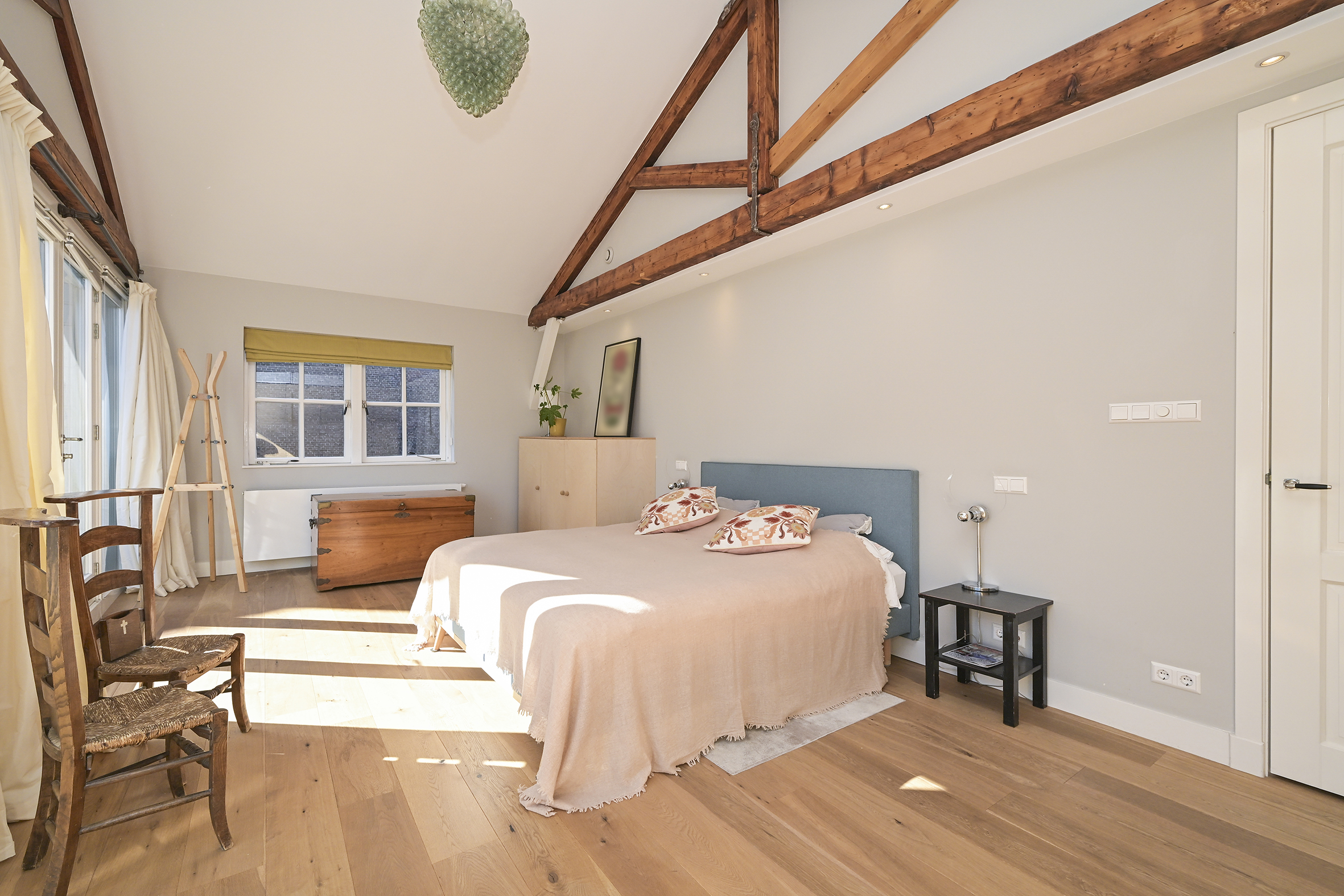 De 2e verdieping telt een drietal slaapkamers, een ruim zonnig balkon en twee moderne badkamers. De hoofdslaapkamer heeft eveneens een loft achtige uitstraling met de spanten in het zicht. Vanuit de gang is er een vliering bereikbaar waar een WTW-systeem staat en er is een vaste trap naar het zonnige dakterras met fraai vrij uitzicht over Den Haag.