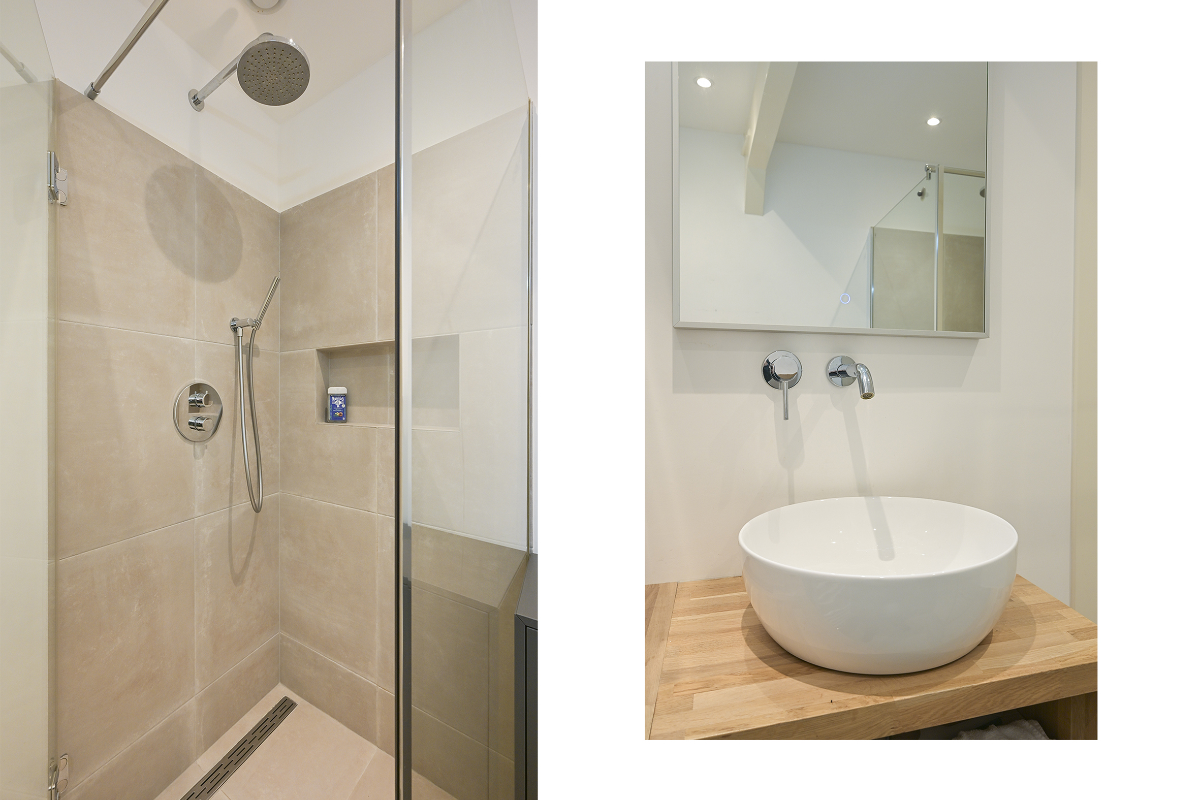 The first floor comprises a large L-shaped loft that can be used in various ways. Currently, two wonderfully bright workspaces are located here, but if additional bedrooms are needed, they can be created.