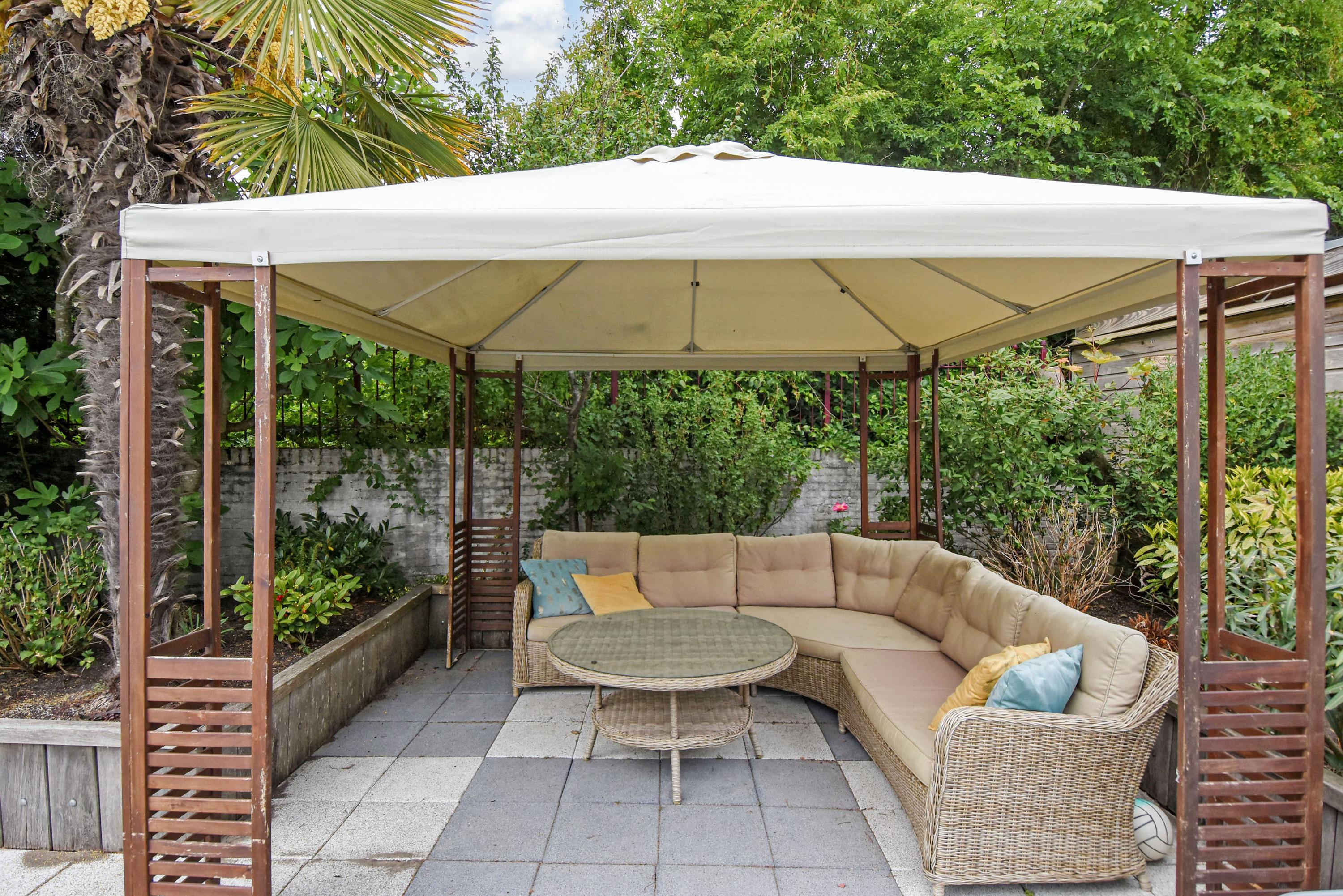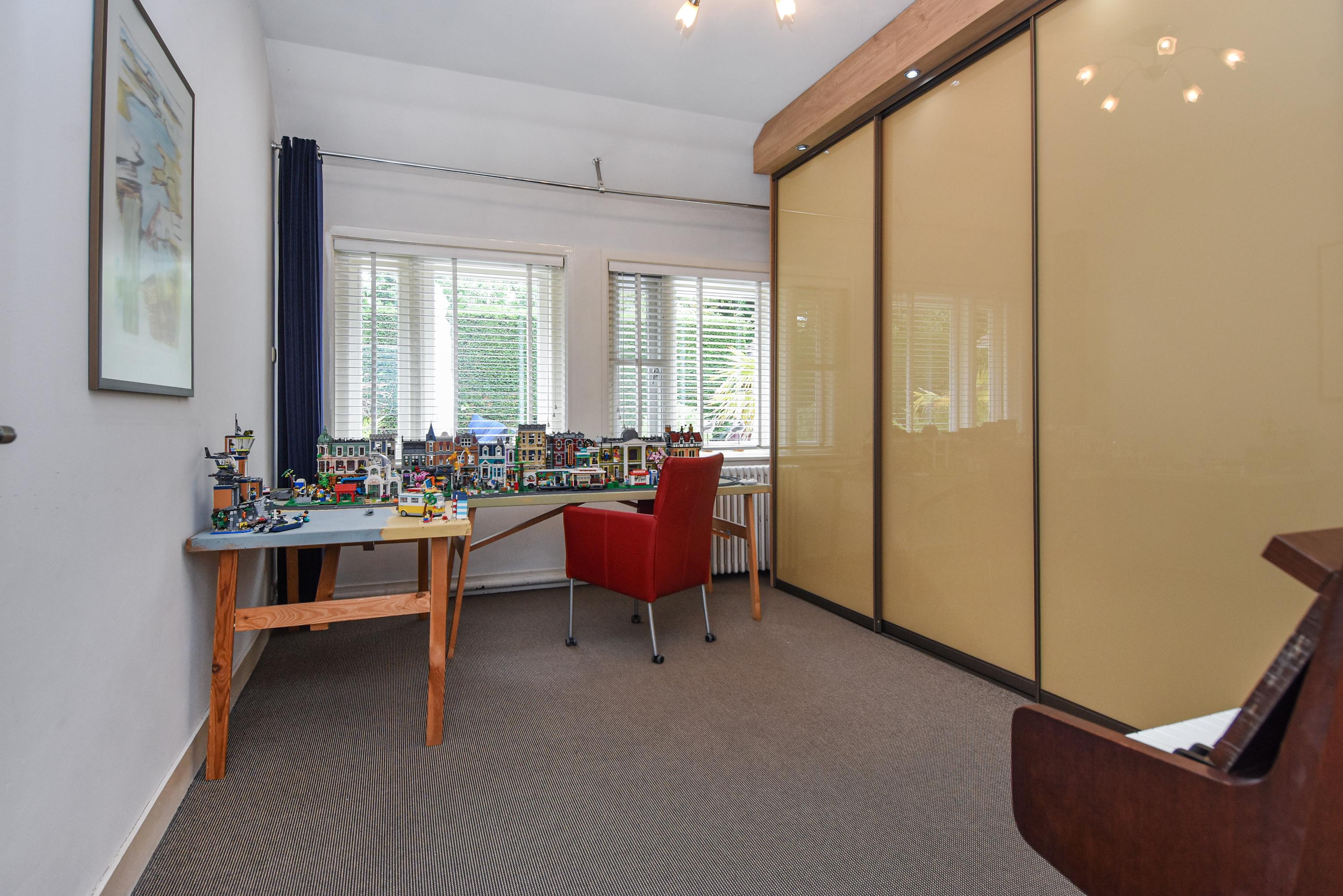 In the front garden is a lawn, an ornamental pond, and a spacious terrace that's ideal for enjoying the morning and afternoon sun; an even larger terrace at the side garden is well-positioned for the afternoon and evening sun — perfect for long summer dinners and relaxing in the sunshine. The beautifully landscaped back garden has several terraces, a swimming pool, and a covered seating area. At the rear of the garden the former garage has been transformed into a multifunctional outbuilding which can serve as guest accommodation or storage. It includes its own bathroom with a shower, washbasin, and toilet.