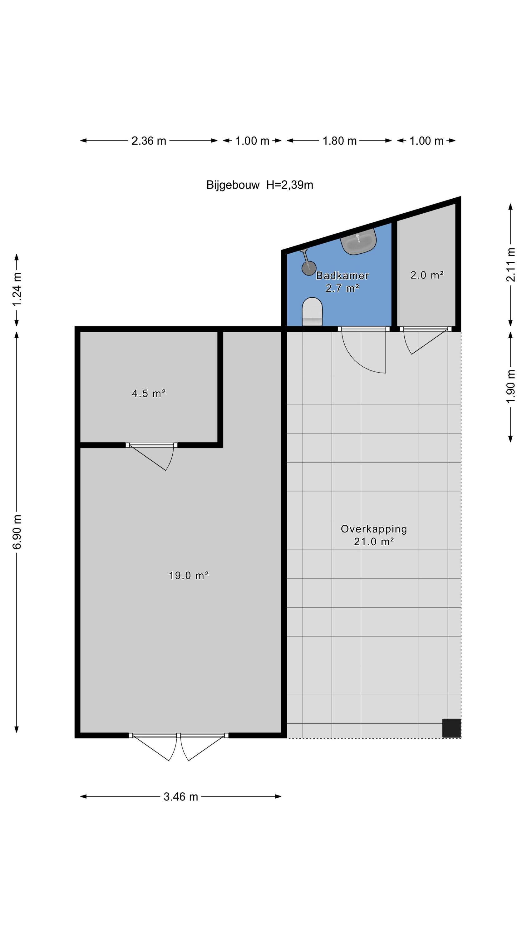 A hallway leads to the three bedrooms with windows to the backgarden. Vestibule with double doors to the back garden. Through a small passage with fitted cupboards and a separate electric boiler is the first bathroom, with a walk-in shower, wide washbasin, and toilet. A second bathroom is similarly outfitted with a shower, washbasin, and toilet.