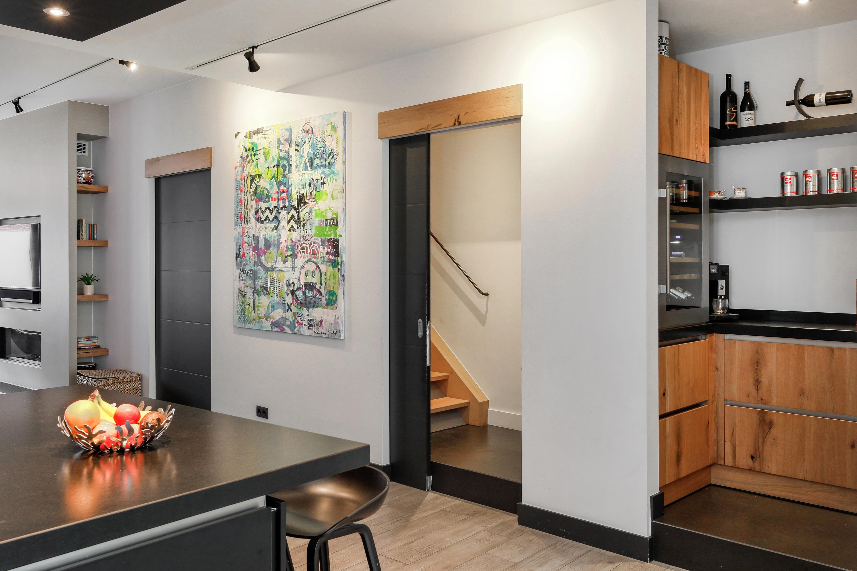 It's especially nice when the sitting area is at the end of the room. Here, you can find peace and quiet in the evenings, without the hustle and bustle. The fireplace is incorporated into a wall, as is the TV. Behind this wall, there's plenty of storage, with shelves providing ample space for displaying beautiful items. Just like the rest of the ground floor, the tiled floor resembles a wooden one. This floor not only creates a warm atmosphere, but thanks to the underfloor heating, it's also very comfortable for bare feet. A large arched window provides ample natural light.
