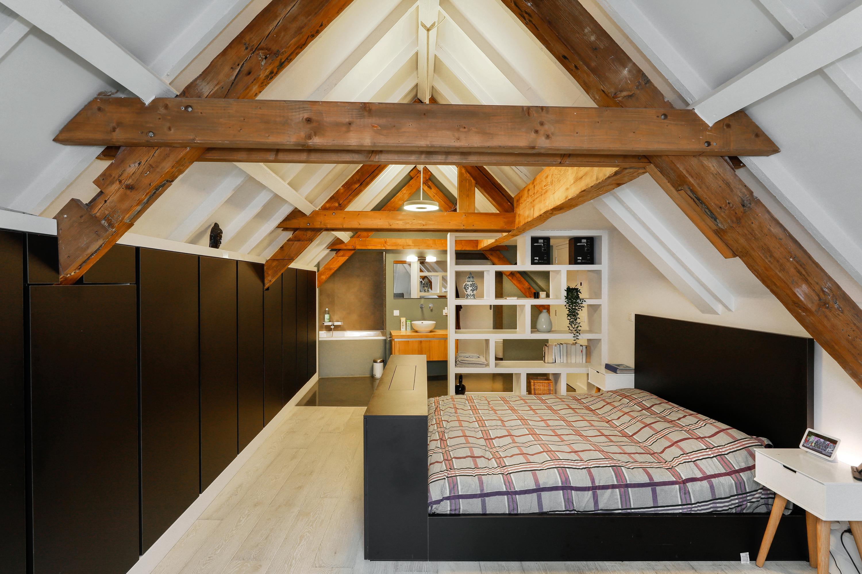 You have the entire second floor to yourself. Under the attractive trusses lies a large bedroom with an en-suite bathroom. The approximately 8-meter-long room has room for a bed, a sitting area by the dormer window, and a long built-in wardrobe under the sloping ceiling. Here too, the same laminated parquet flooring as on the first floor is found. Because the bathroom is exclusively for this room, the sink could be placed on one end. The bathtub is cleverly placed on the sloping ceiling, and the toilet and shower are on the other side of the sink. Behind this bathroom is a surprising storage area for your summer/winter wardrobe.