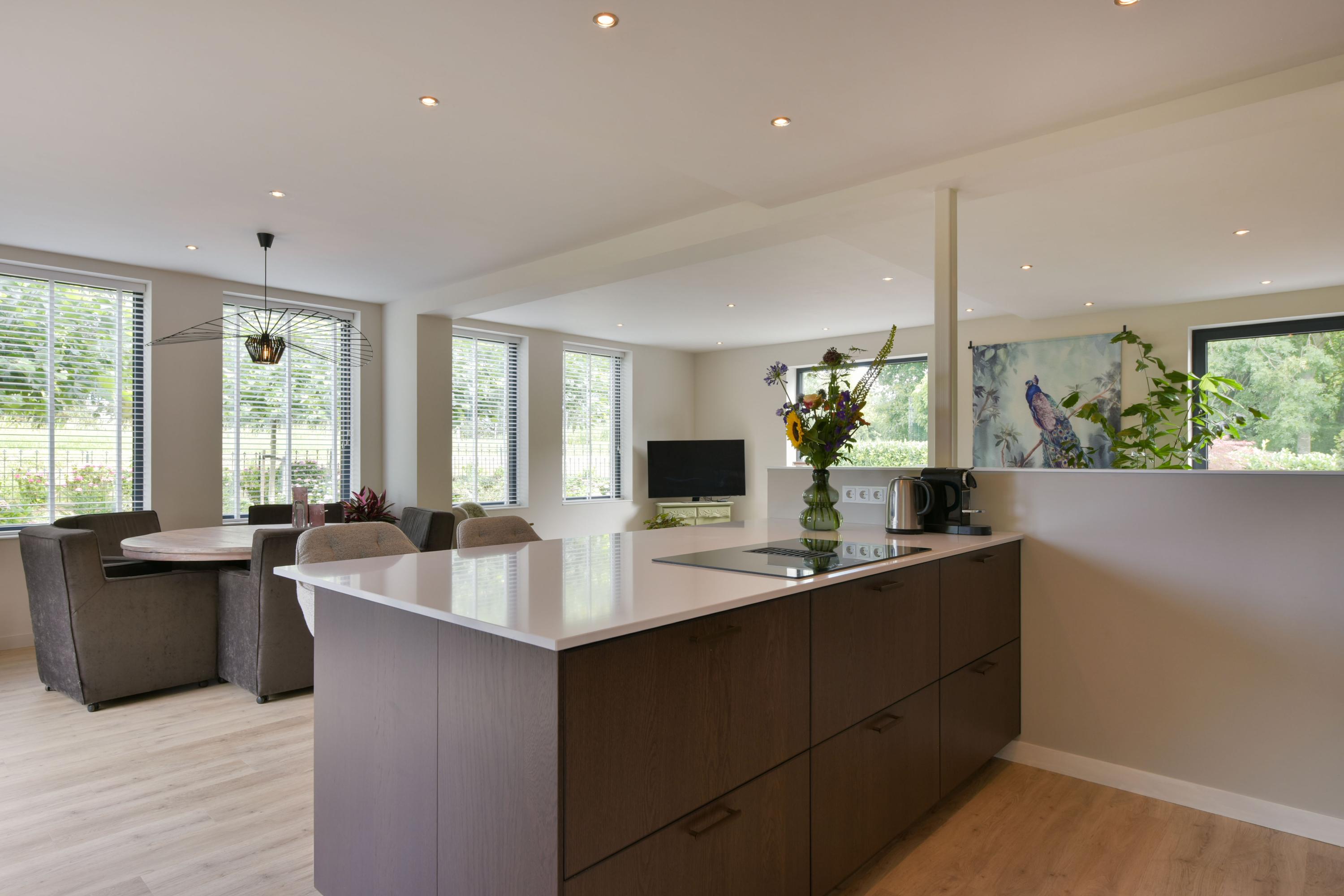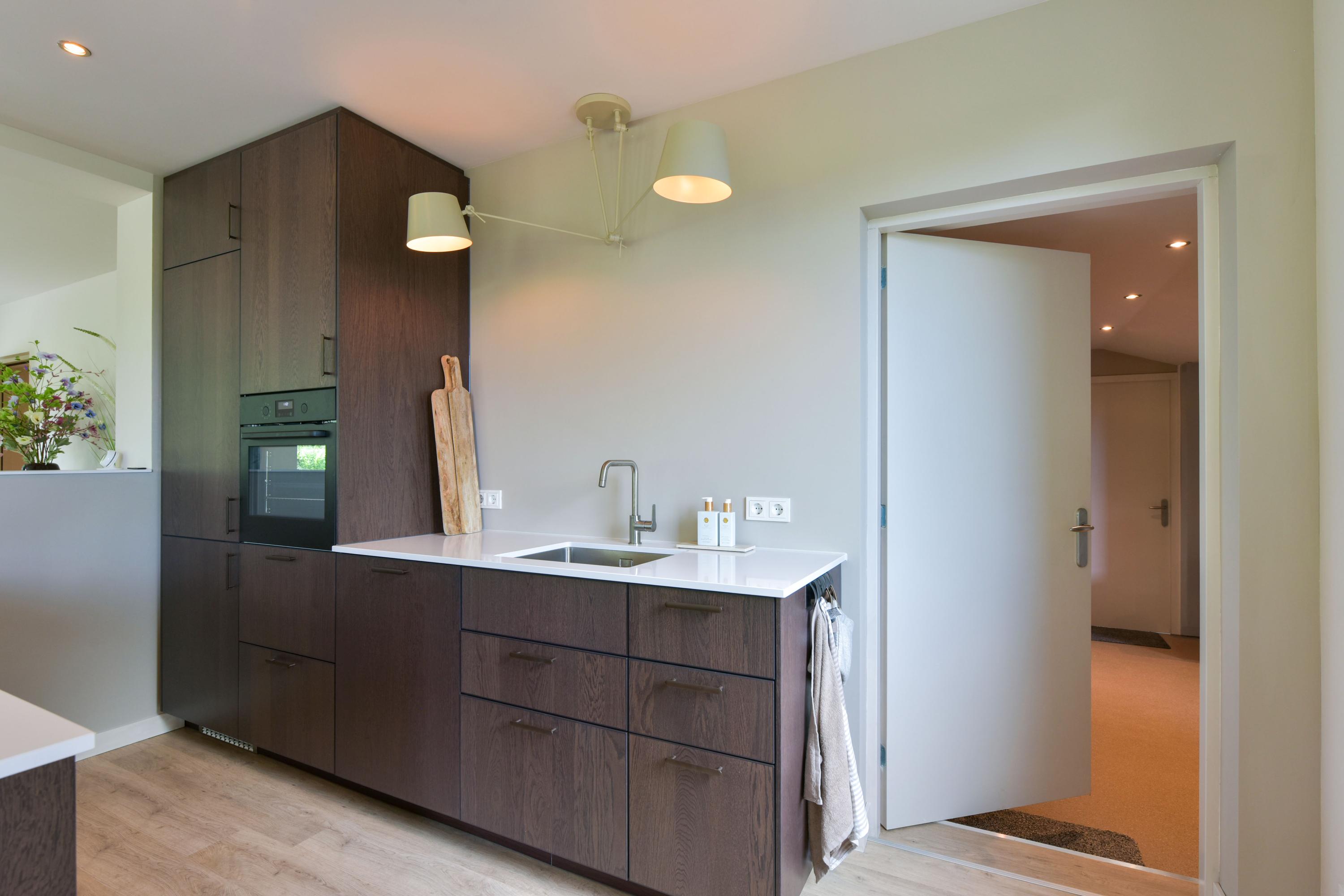 Each unit has its own entrance. You step directly into a bright and cosy living room with space for a sitting area and small dining table. The modern, functional kitchenette includes an induction hob, extractor and fridge — everything needed for independent living. A neat bathroom with a walk-in shower, sleek vanity and toilet is adjacent. The fresh, modern finish gives the space a pleasant, contemporary feel.