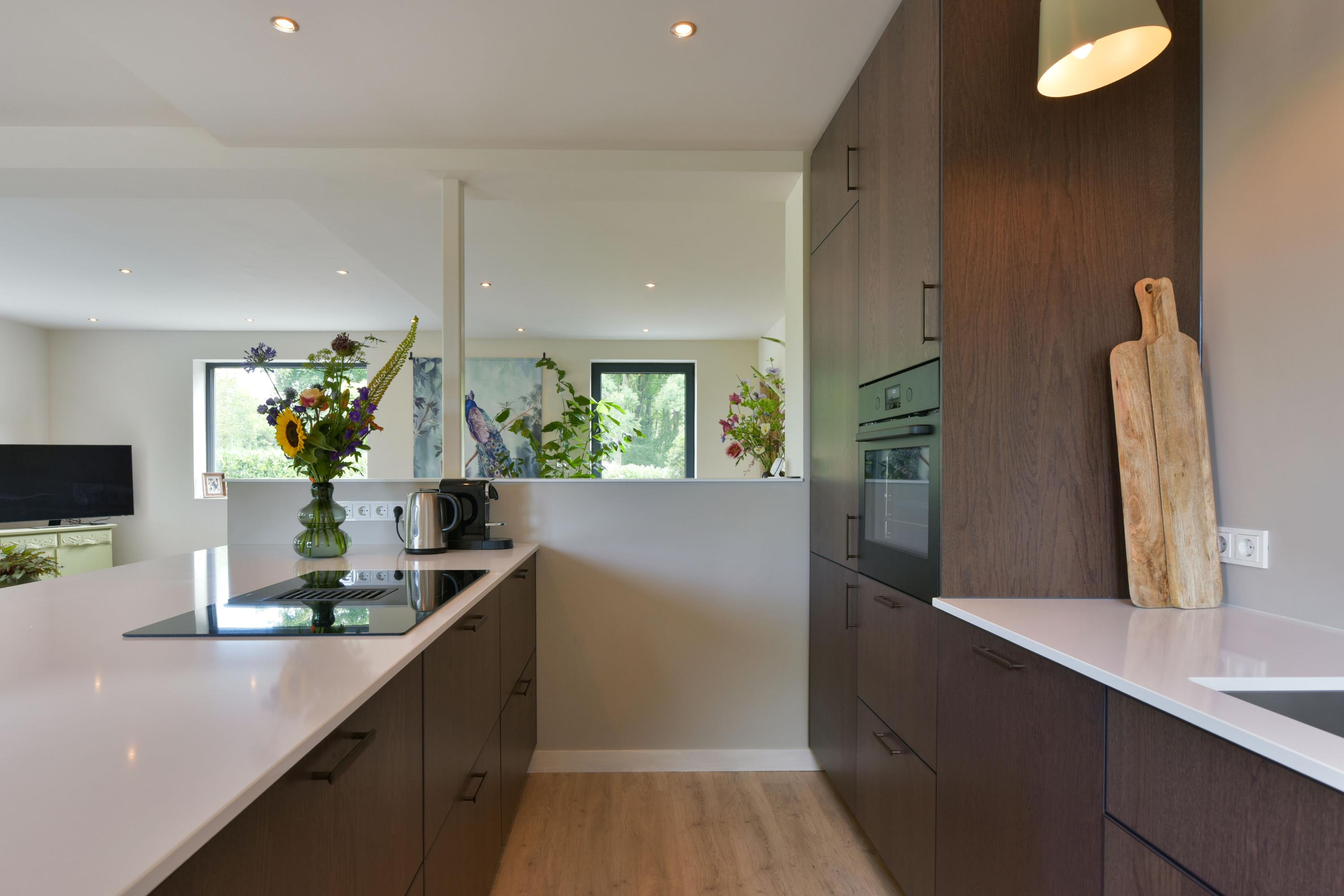 Adjacent to the living room is the brand-new open-plan kitchen (installed in 2025), designed in a stylish and timeless aesthetic. On one side you’ll find a tall cabinet wall with a spacious fridge, modern oven, and ample storage. The wide worktop with integrated sink offers plenty of space, with deep drawers underneath for convenience. On the other side stands the kitchen island — the heart of the room — featuring an induction hob with a sleek integrated extractor. Surrounding the island are extra cabinets and a comfortable bar area, perfect for casual dining, drinks or chatting while cooking.