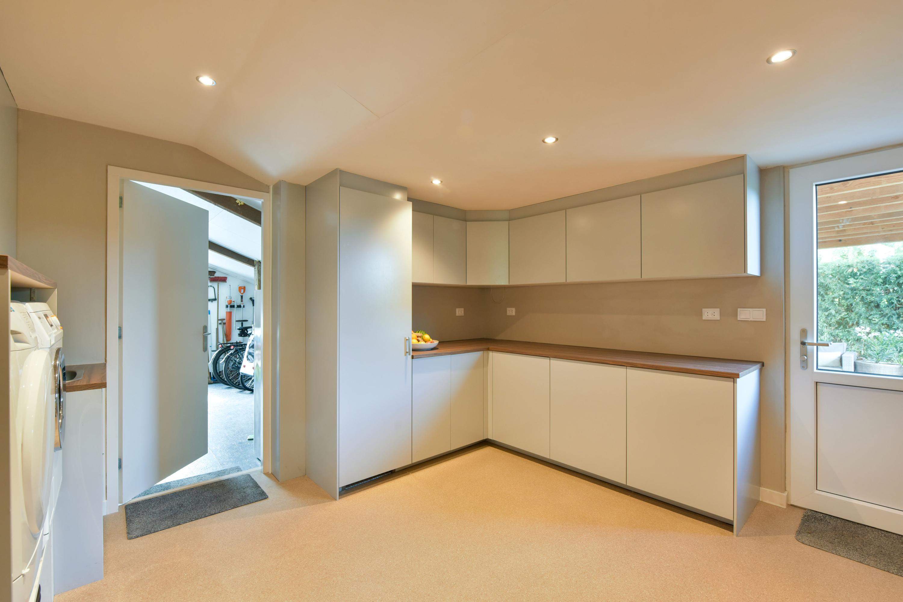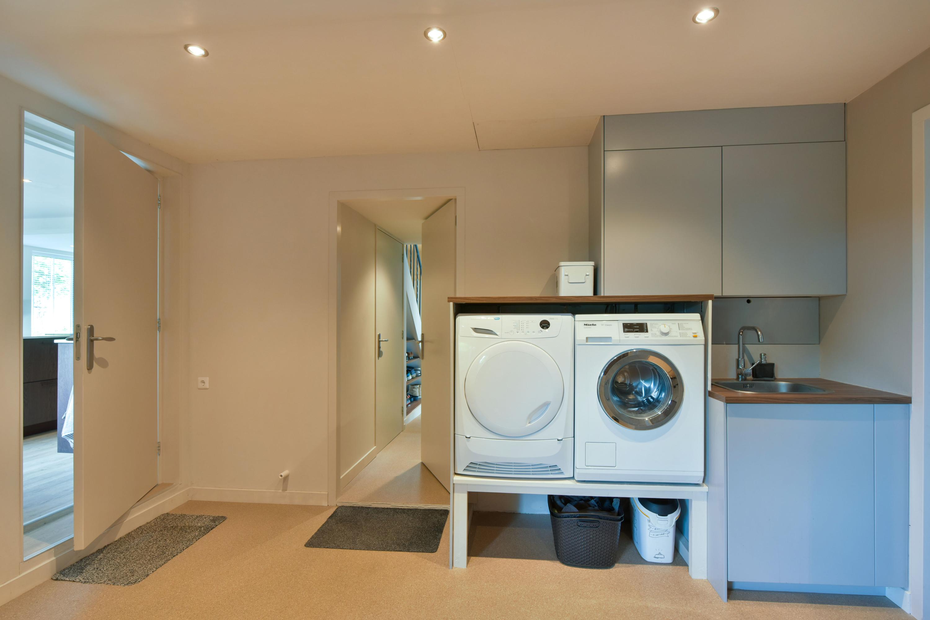 From both the second hallway and the kitchen, you can access the utility room — offering space for a washer and dryer, plus a full kitchen unit with upper and lower cabinets and a large freezer. A door leads to the cosy veranda — perfect for long summer evenings or a morning coffee in the sun. An adjacent separate storage room, also accessible via a terrace door, provides ample space for tools, garden furniture or sports equipment.