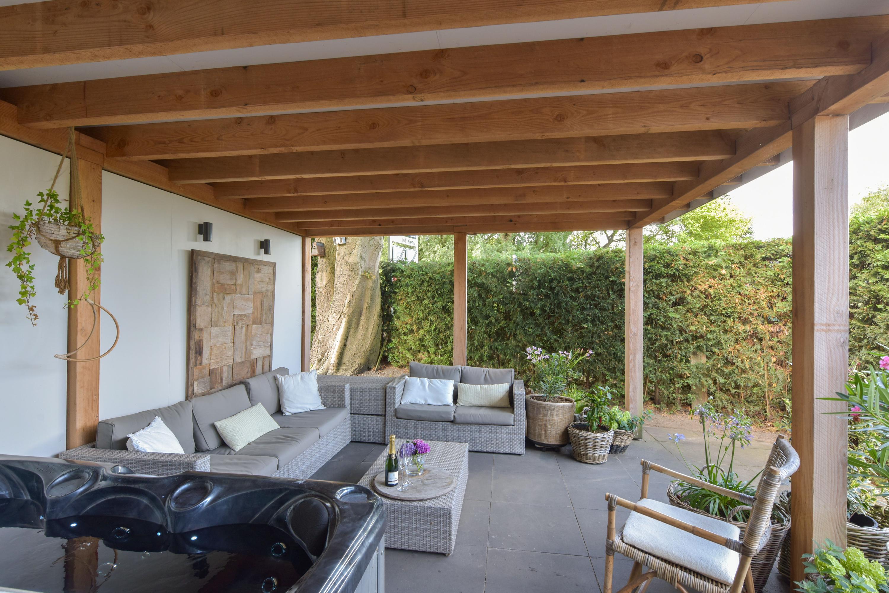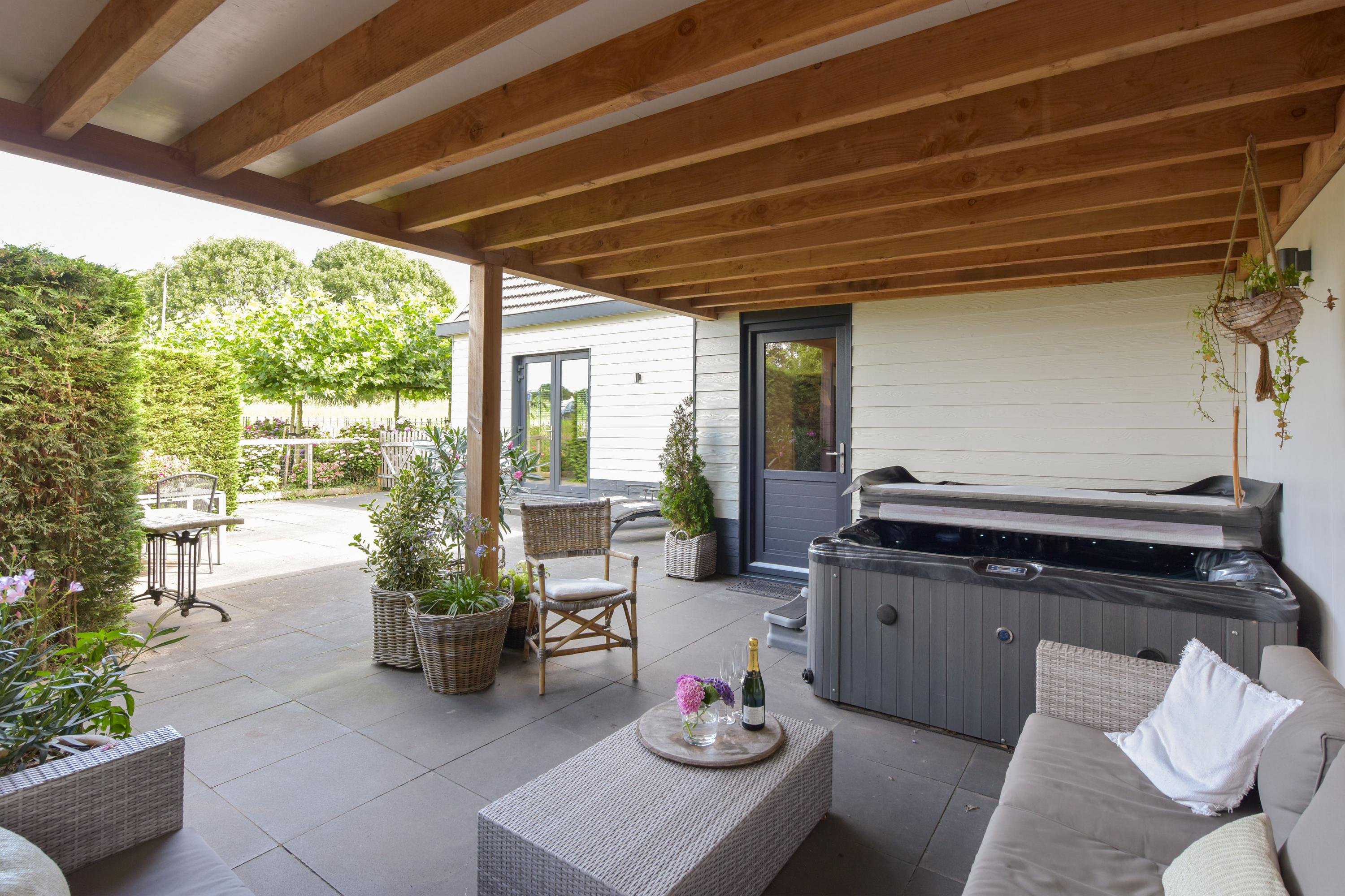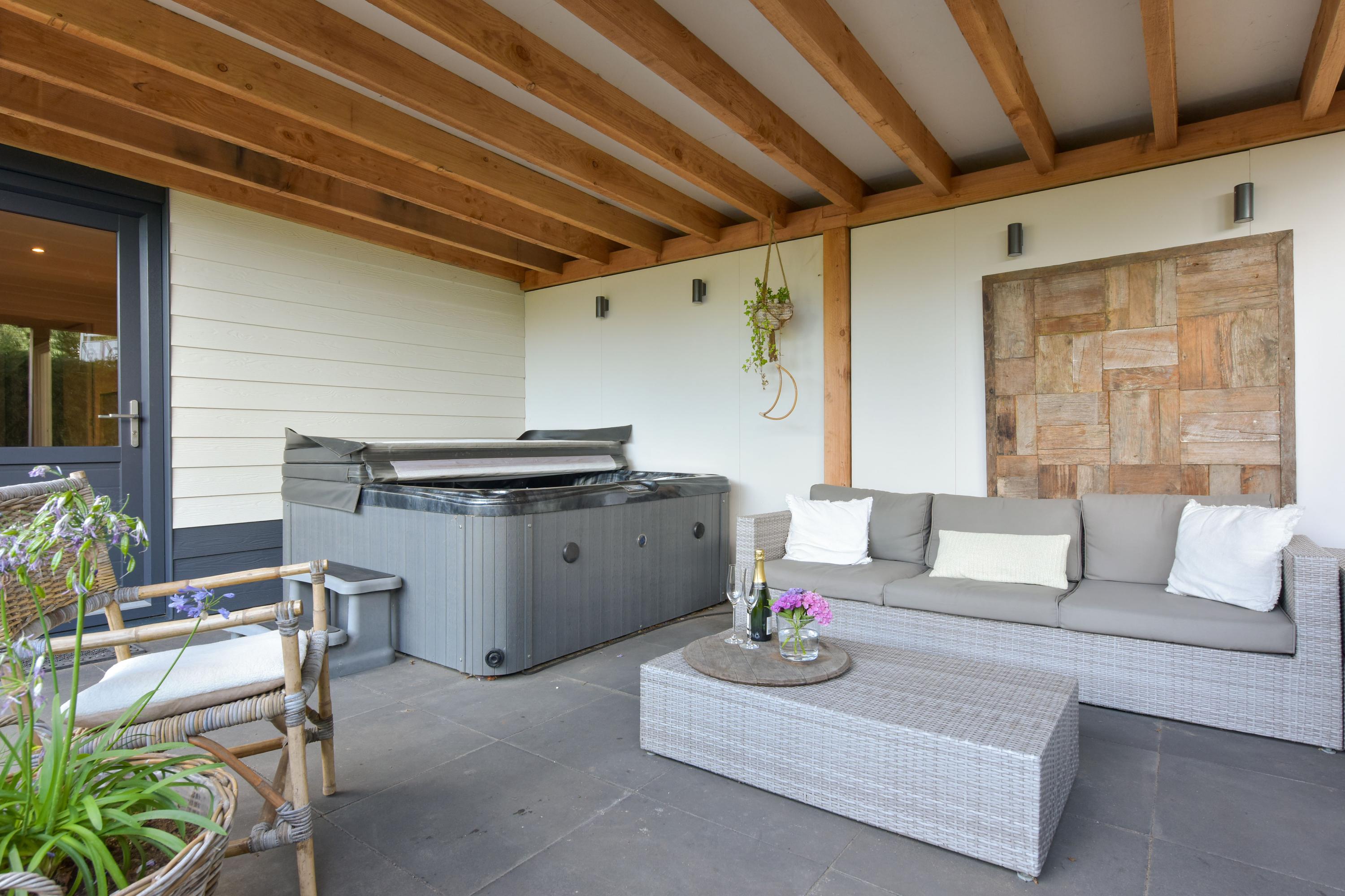 A spacious tiled terrace lies adjacent to the living room, with ample space for a large dining table, lounge set or multiple seating areas. Thanks to its position and openness, you enjoy both sun and privacy — ideal for long summer evenings or quiet mornings with coffee and a view of the greenery. Next to the terrace is a stylish veranda, furnished as a comfortable lounge corner. Even in less favourable weather, this space is a joy: covered, sheltered, fitted with electricity and atmospheric lighting. A dedicated jacuzzi connection (jacuzzi optionally available) turns this into a private spa in your own backyard — luxury and relaxation at your fingertips.