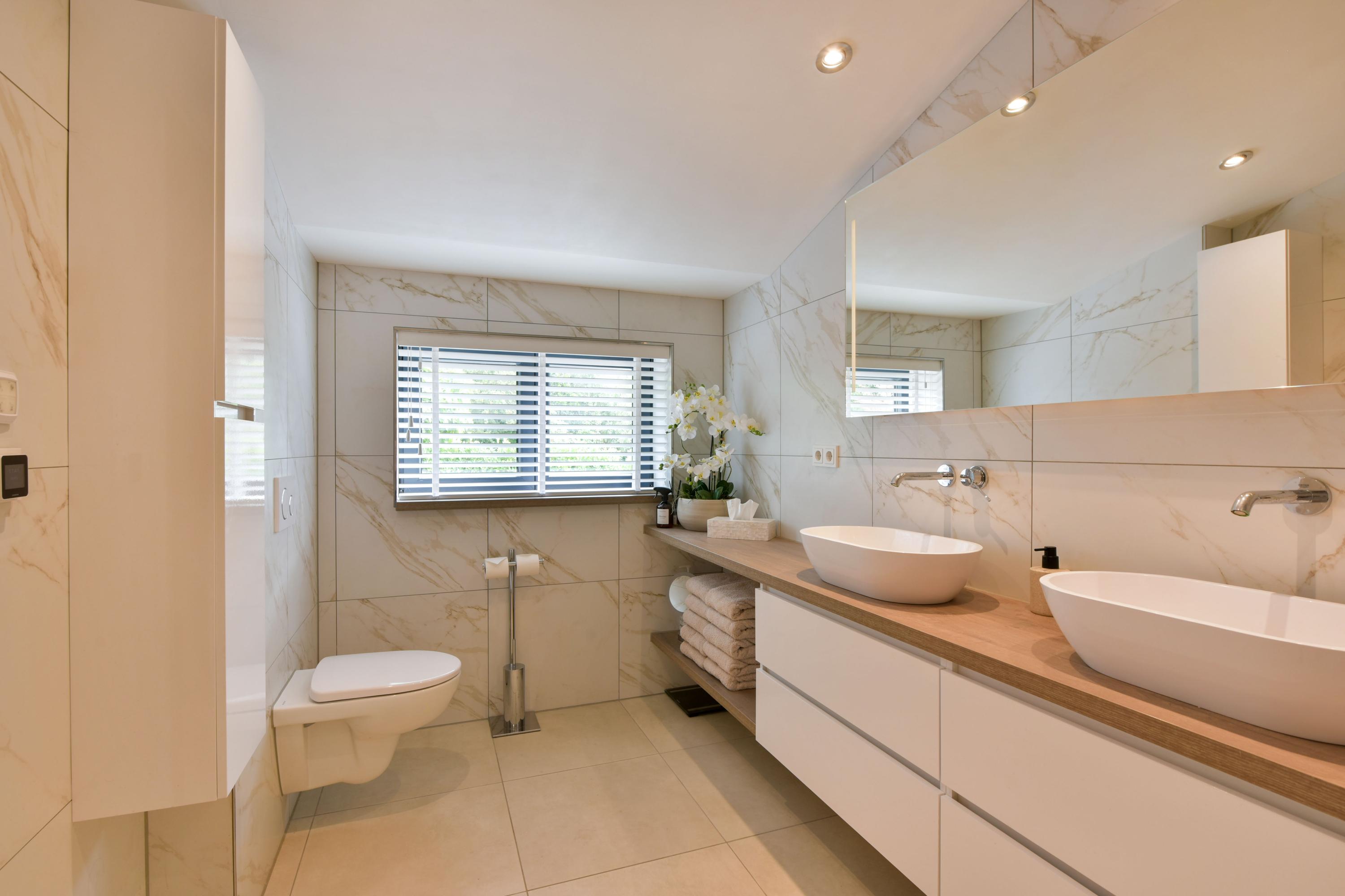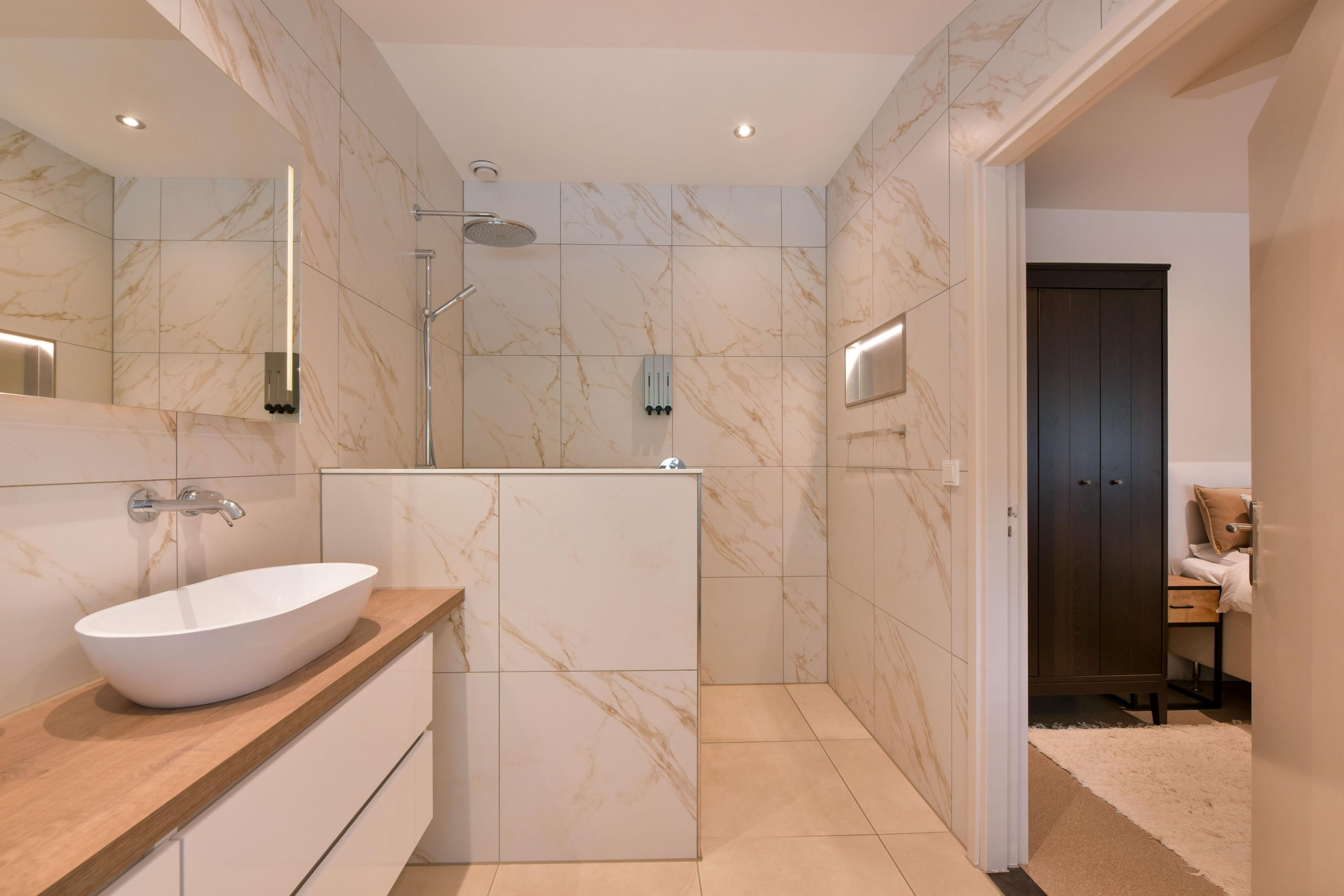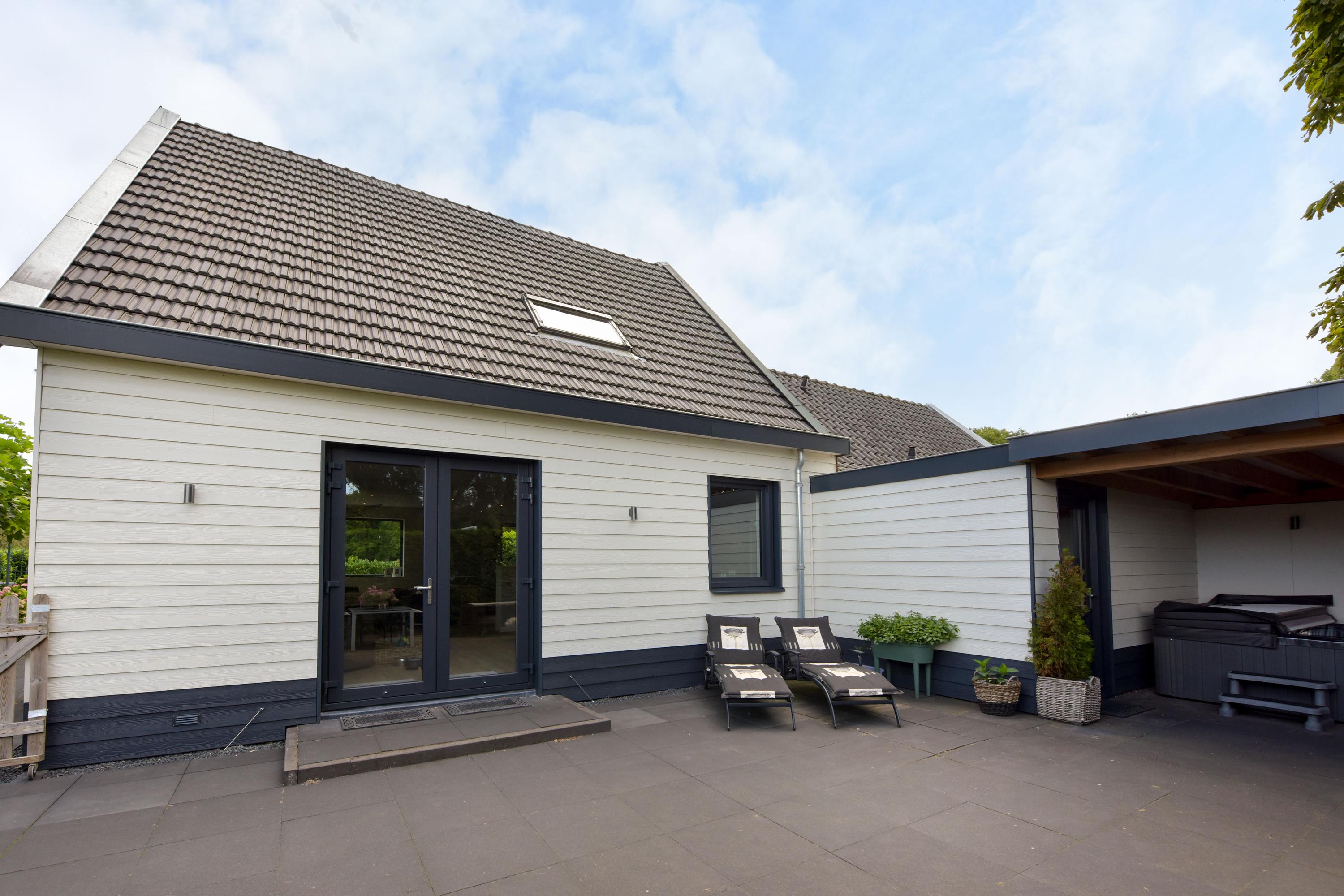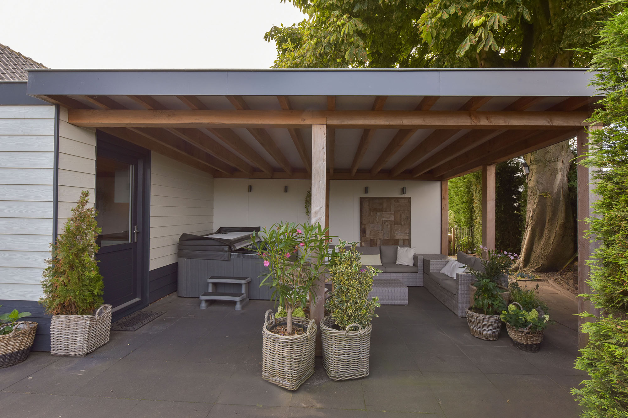 A spacious tiled terrace lies adjacent to the living room, with ample space for a large dining table, lounge set or multiple seating areas. Thanks to its position and openness, you enjoy both sun and privacy — ideal for long summer evenings or quiet mornings with coffee and a view of the greenery. Next to the terrace is a stylish veranda, furnished as a comfortable lounge corner. Even in less favourable weather, this space is a joy: covered, sheltered, fitted with electricity and atmospheric lighting. A dedicated jacuzzi connection (jacuzzi optionally available) turns this into a private spa in your own backyard — luxury and relaxation at your fingertips.