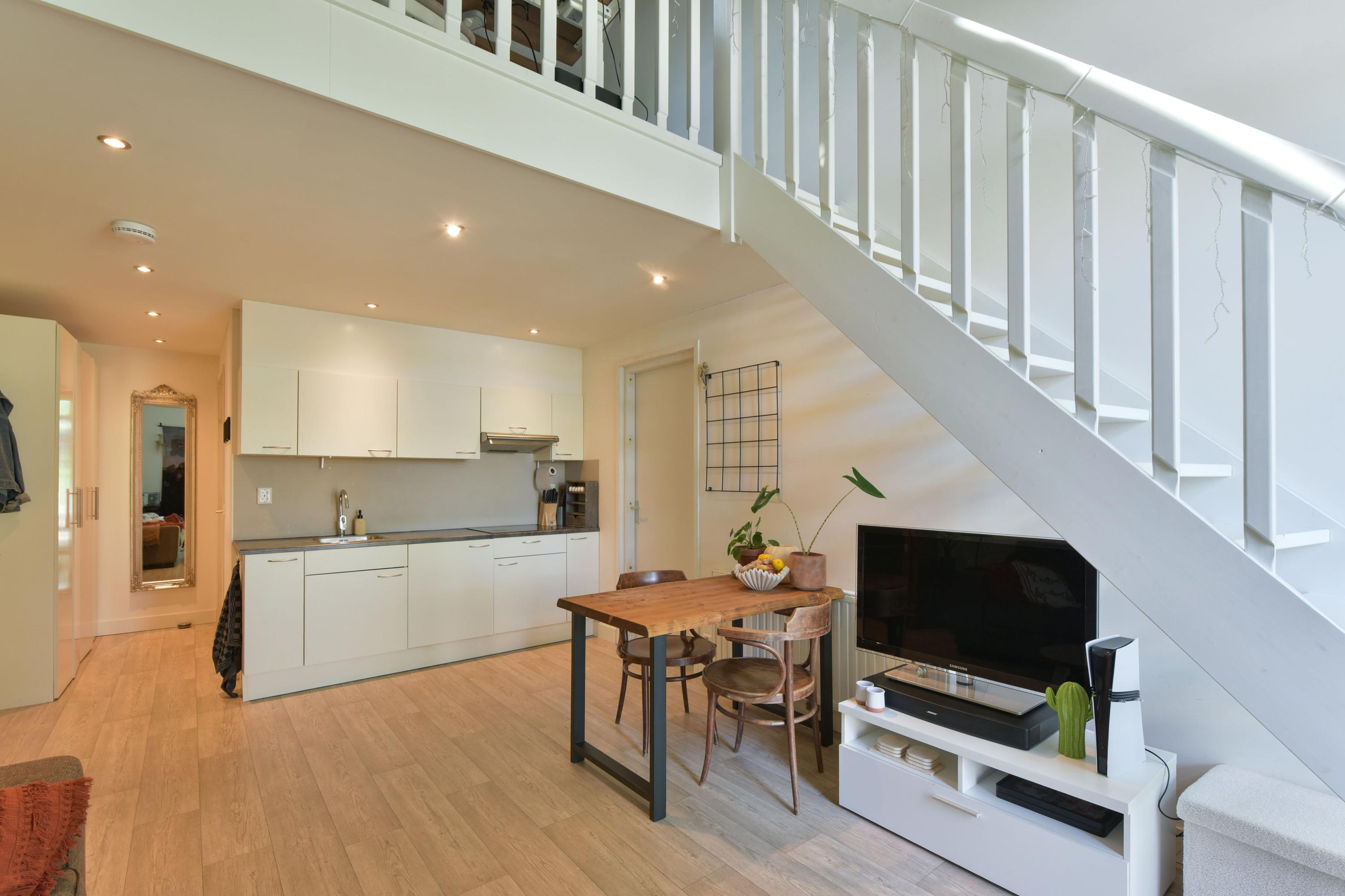 Inside the studio is a fixed staircase leading to a mezzanine — a half-level perfect for extra storage, a workspace or even a cosy lounge. The generous ceiling height retains the feeling of space while offering added functionality.