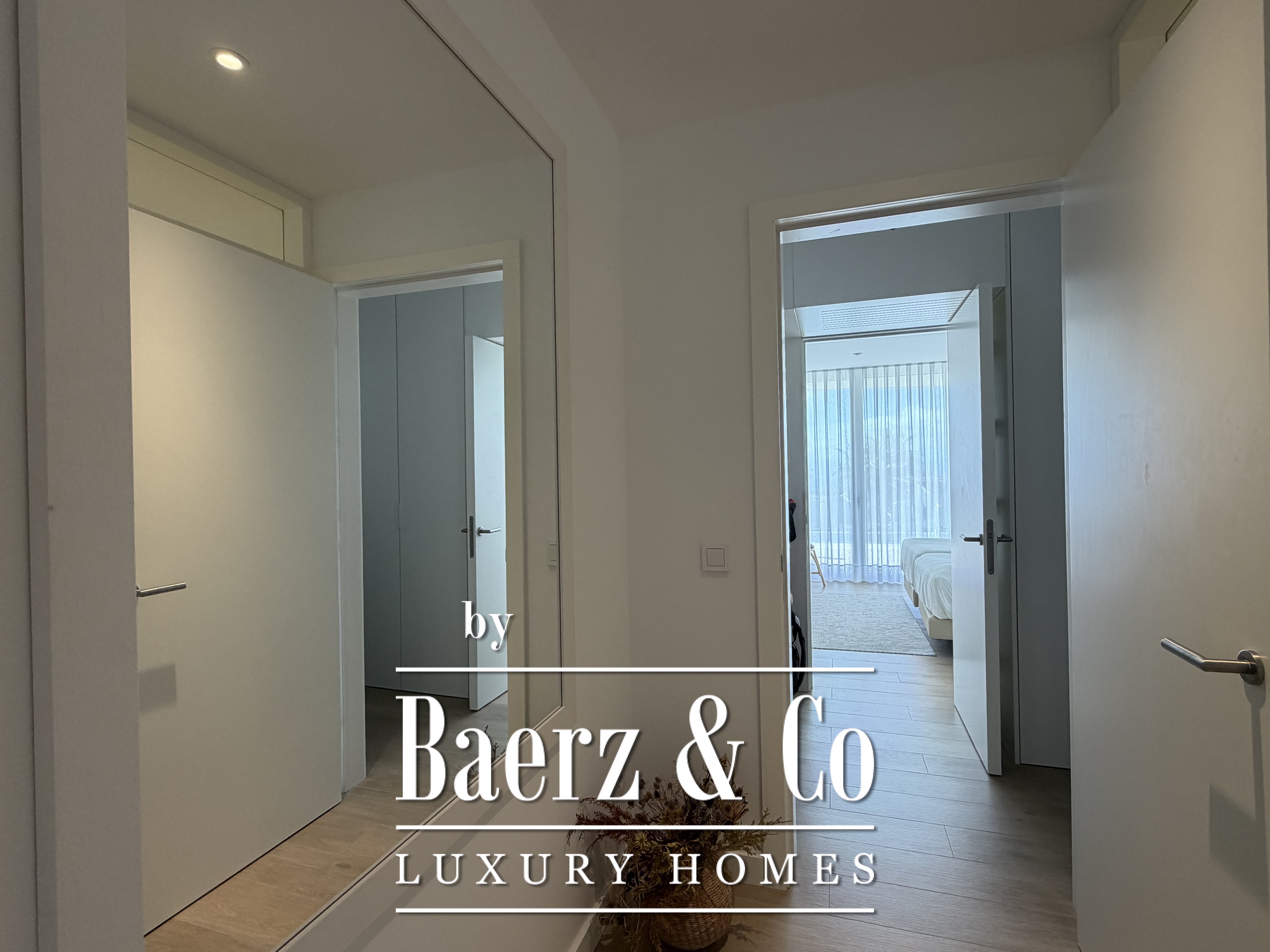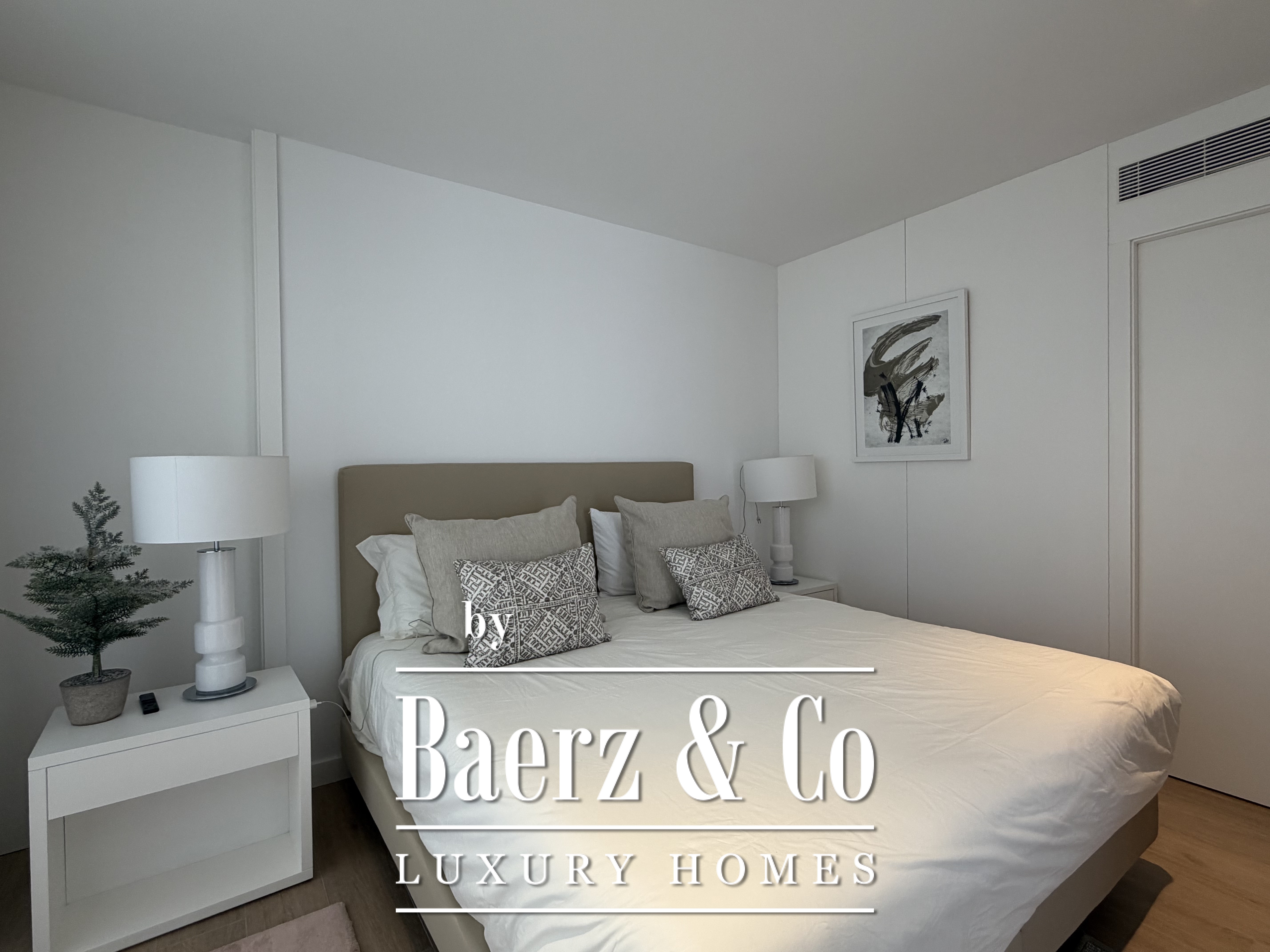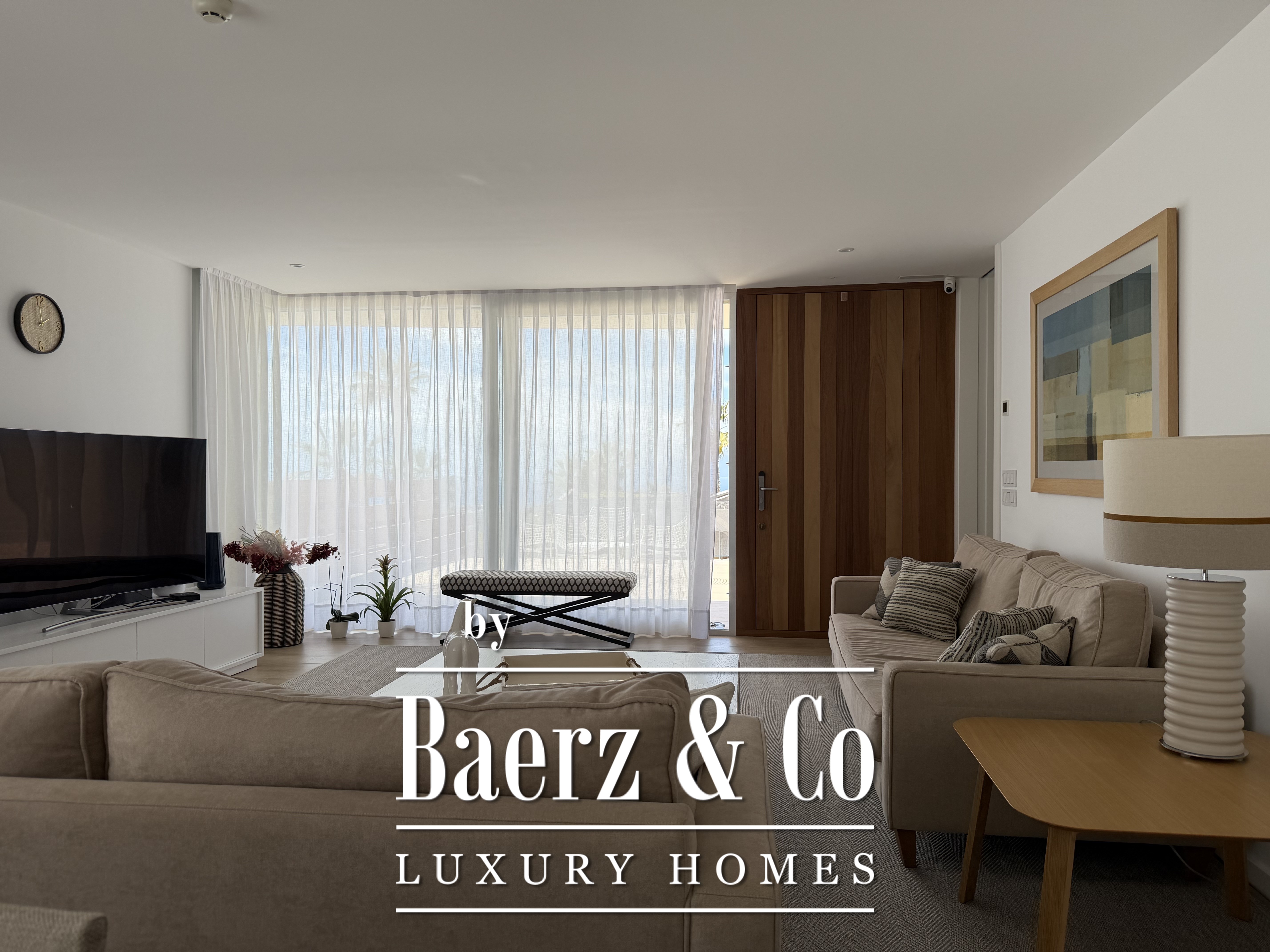 Natural light fills the interiors through expansive windows, framing the horizon and creating seamless access to the terrace and landscaped garden. Three bedrooms offer dressing rooms, while two bathrooms feature modern showers, underscoring the emphasis on refined functionality. The bright living room invites relaxation, whether enjoying a quiet moment or sharing the space with guests.