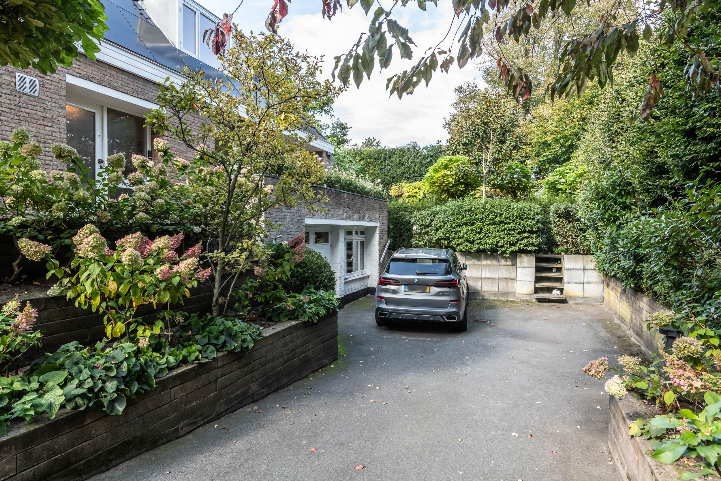 This semi-detached villa, with the feel of detached living, is easily accessible via the driveway. The grounds are enclosed by an electric gate. The driveway has space for several cars, features a charging station and provides access to the indoor garage.