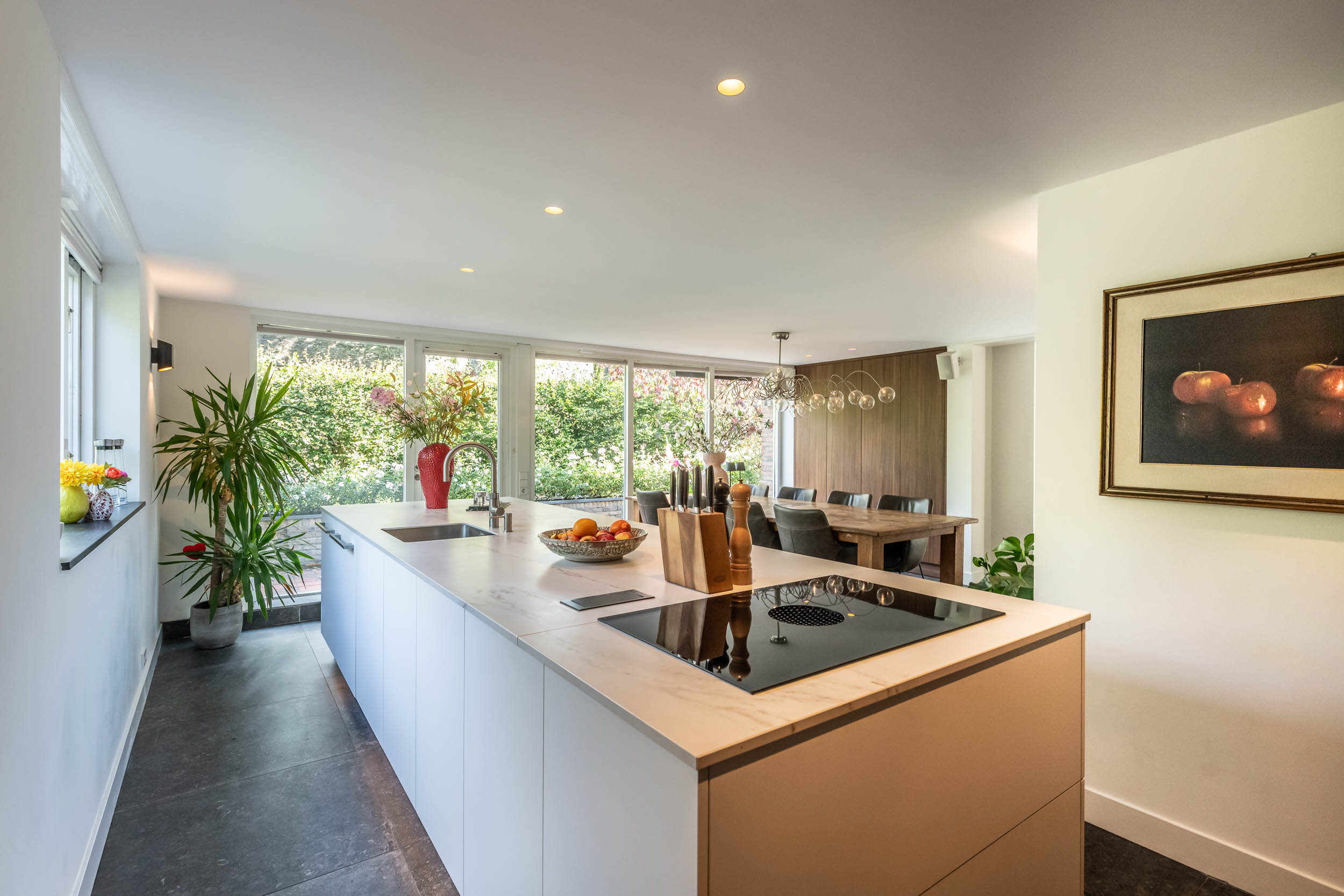 Entrance hall, spacious hallway with toilet and urinal, bright and spacious living room with fireplace, oak flooring and doors to the front terrace. A double door connects to the second living room/TV room with large windows and a view of the back garden. Luxurious, tailor-made kitchen-diner (’t Spant in Heemstede, 2022) featuring underfloor heating, a sink/kitchen island and various built-in appliances: wine climate cabinet, ovens, Quooker with sparkling water feature, coffee machine, Bora electric hob with flex zones and dishwasher. Door to the side garden.