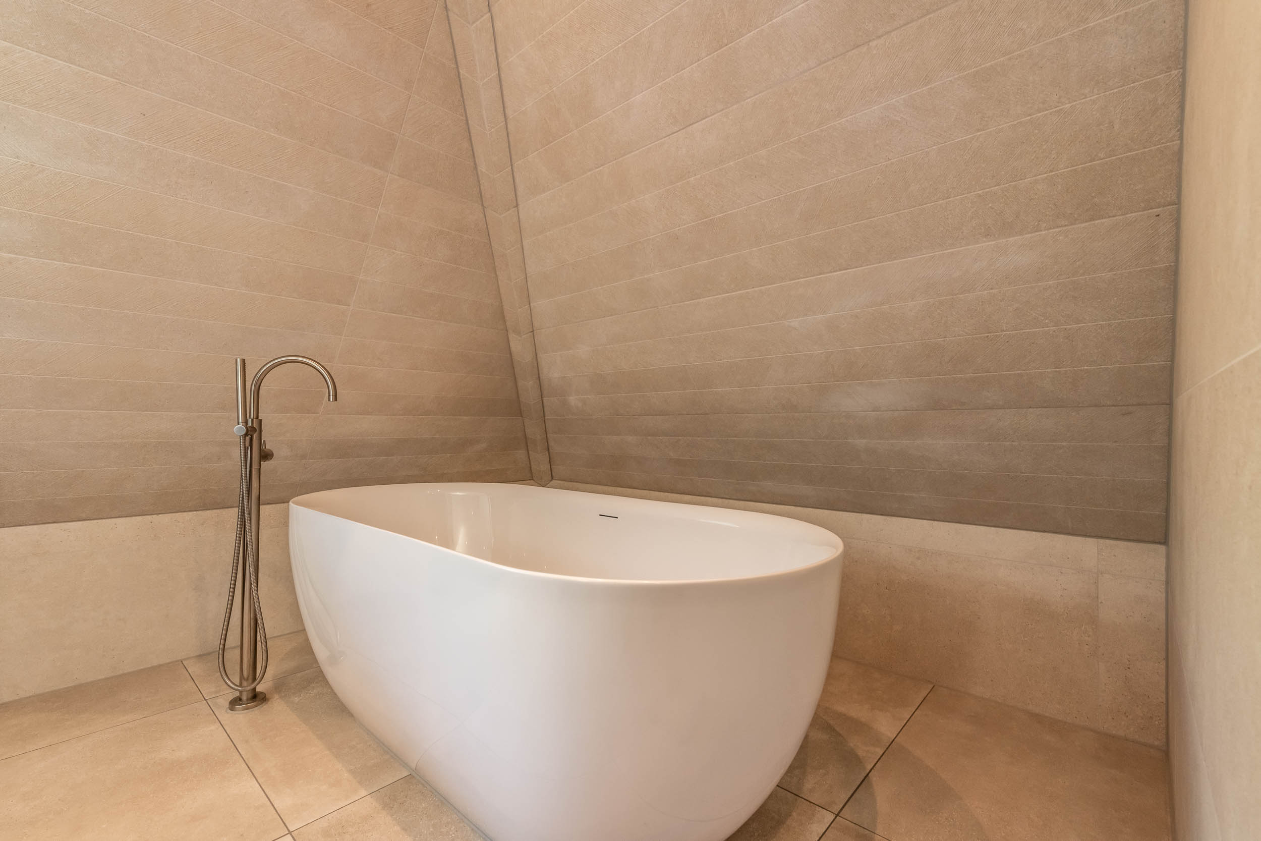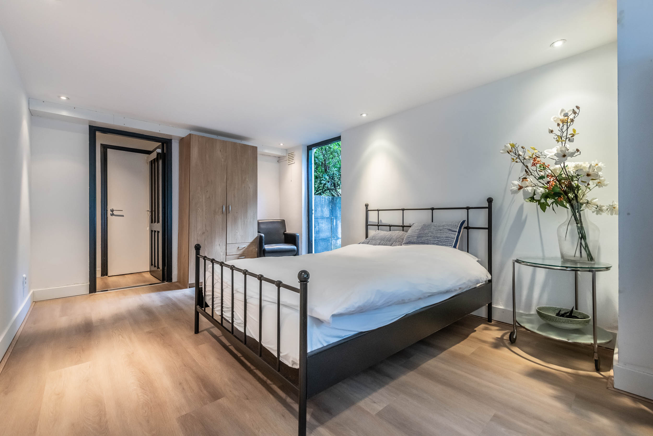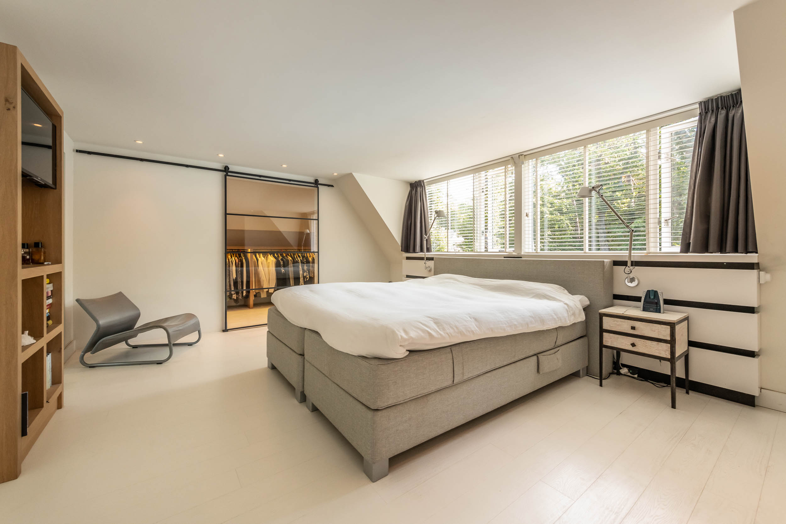 Landing, three bedrooms, including the spacious master bedroom (formerly two rooms) with walk-in wardrobes on both sides. Modern, tailor-made bathroom (’t Spant in Heemstede, 2022) with large dormer window, double washbasin unit, toilet, ample cupboard space, underfloor heating, freestanding bathtub, walk-in shower with Sunshower and hand shower.