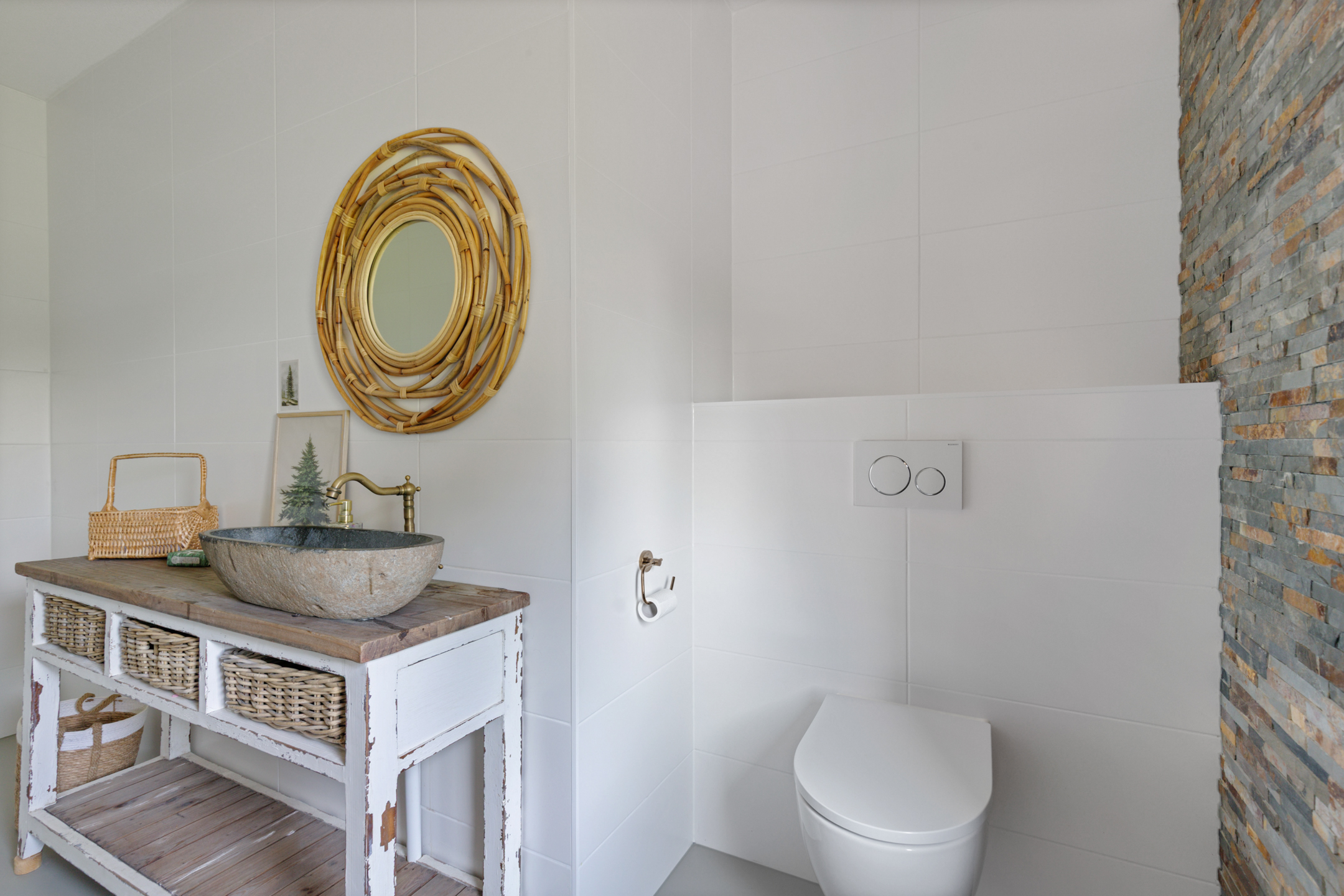 A fixed staircase leads to the fully insulated attic, with full standing height along the length of the house. Industrial steel trusses and rustic wooden beams lend this space character. Three Velux roof windows ensure ample light. Ideal as storage or for conversion into additional living or work areas.
