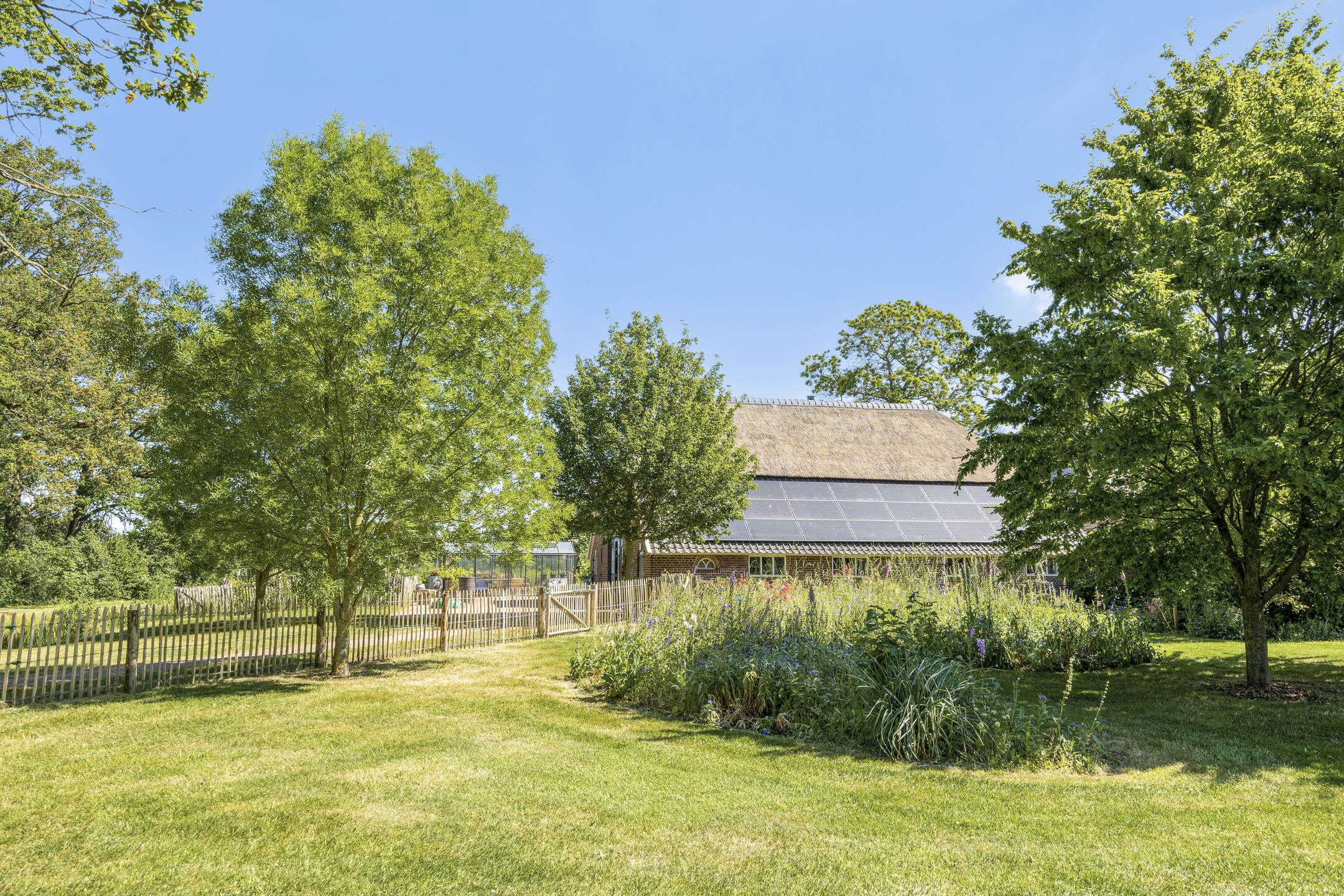 The estate’s adaptable barn can serve as a private studio, business atelier, or guest space, maintaining original rafters and reclaimed materials. Near the kitchen, a sun terrace overlooks orchards and meticulously landscaped borders, while an onsite greenhouse and vegetable garden facilitate self-sufficiency. Vehicle storage is provided by a classic hay barn, and on private grounds, ample parking ensures discretion and ease.