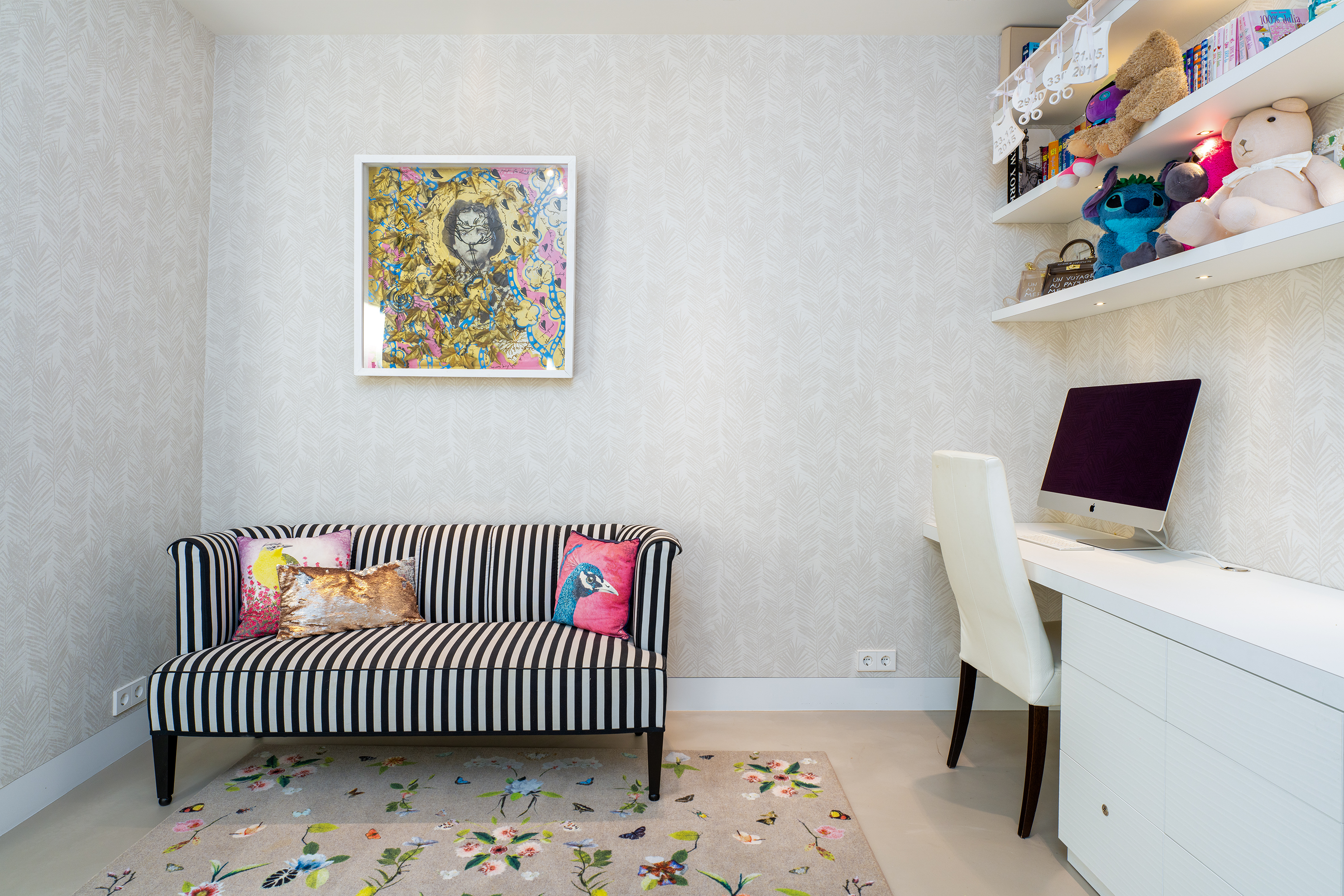 The apartment’s entrance is spacious and has a wonderful marble floor and built-in cupboards. Steel pivot doors open into a hall that gives access to all the rooms on this floor, including a separate toilet room.