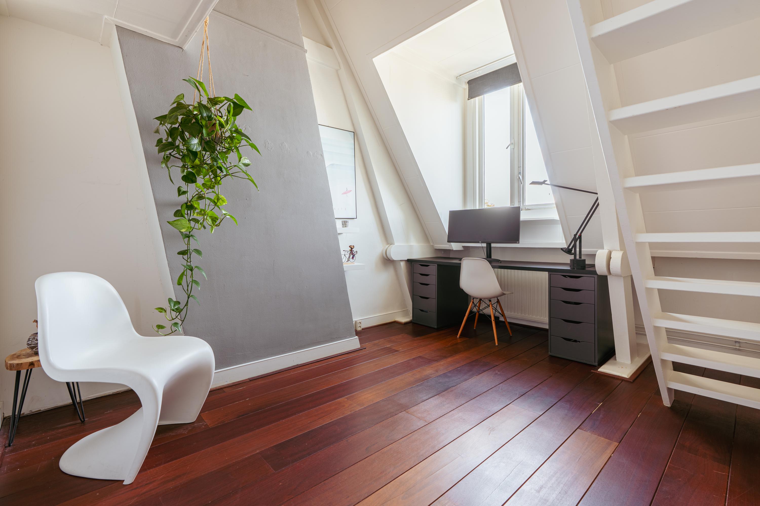This level features a spacious landing with original exposed wooden beams—perfect as a music room, workspace, or gaming area. The fourth bedroom and a convenient storage room are located at the front. There’s also an additional washbasin on this floor. A staircase leads to the roof, where you can enjoy views of Carré Theatre and even the Rijksmuseum. This characteristic building, designed by architect A.C. Boerma, is constructed of brick accented with limestone blocks and bands. The facade boasts three elegant wooden bay windows adorned with authentic ornaments and fantasy figures. Throughout the home, you’ll find beautiful hardwood flooring, high ornamental ceilings, and original stained-glass transom windows. We invite you, like the current residents, to fall in love with this truly exceptional and spacious home.