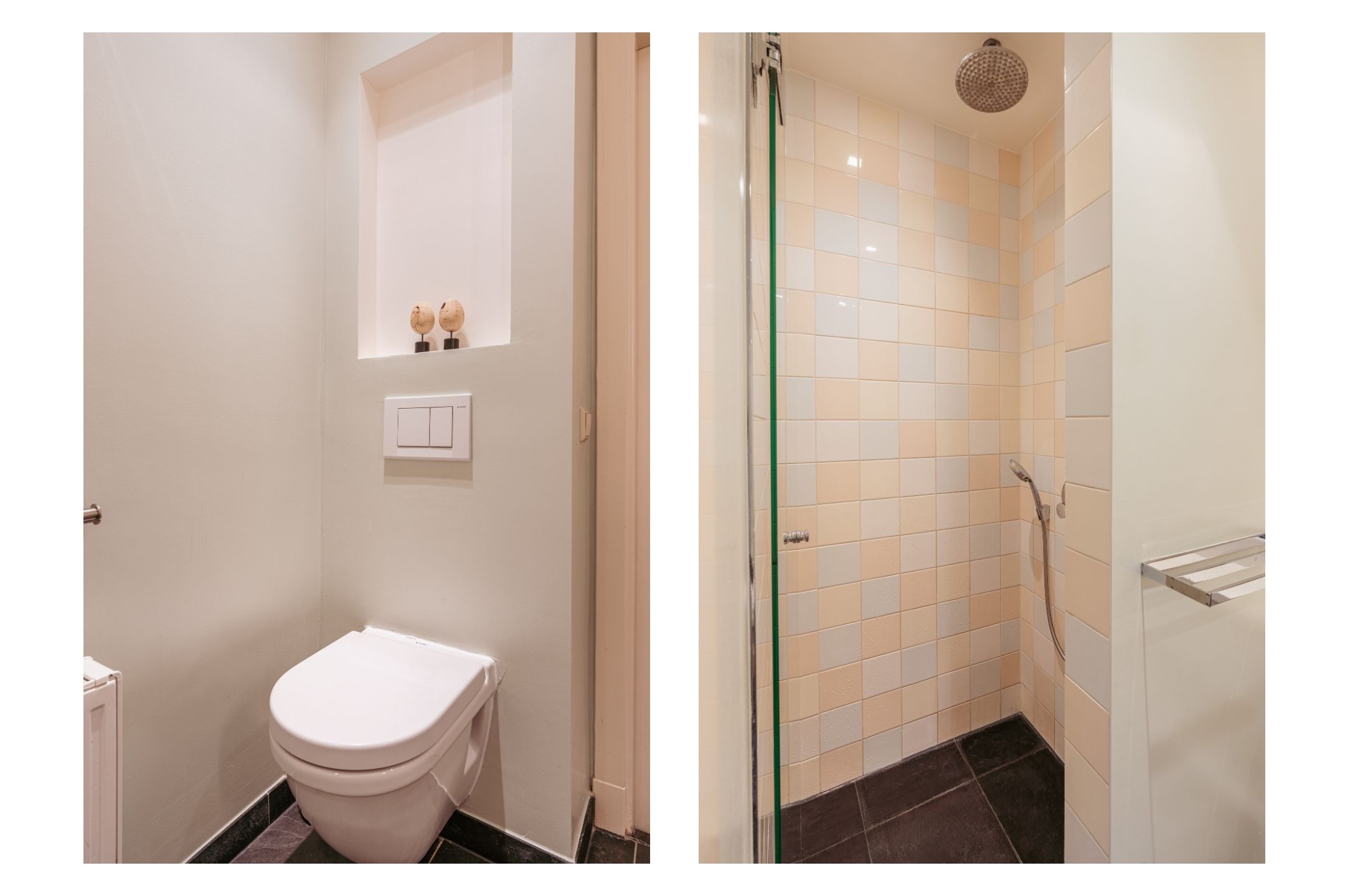 This floor also features a separate laundry room with connections for a washing machine and dryer, as well as additional storage space. The balcony is also accessible from this room. Centrally located is the bathroom, equipped with a triple washbasin with vanity unit and a walk-in shower. Additionally, there is a separate toilet with washbasin.