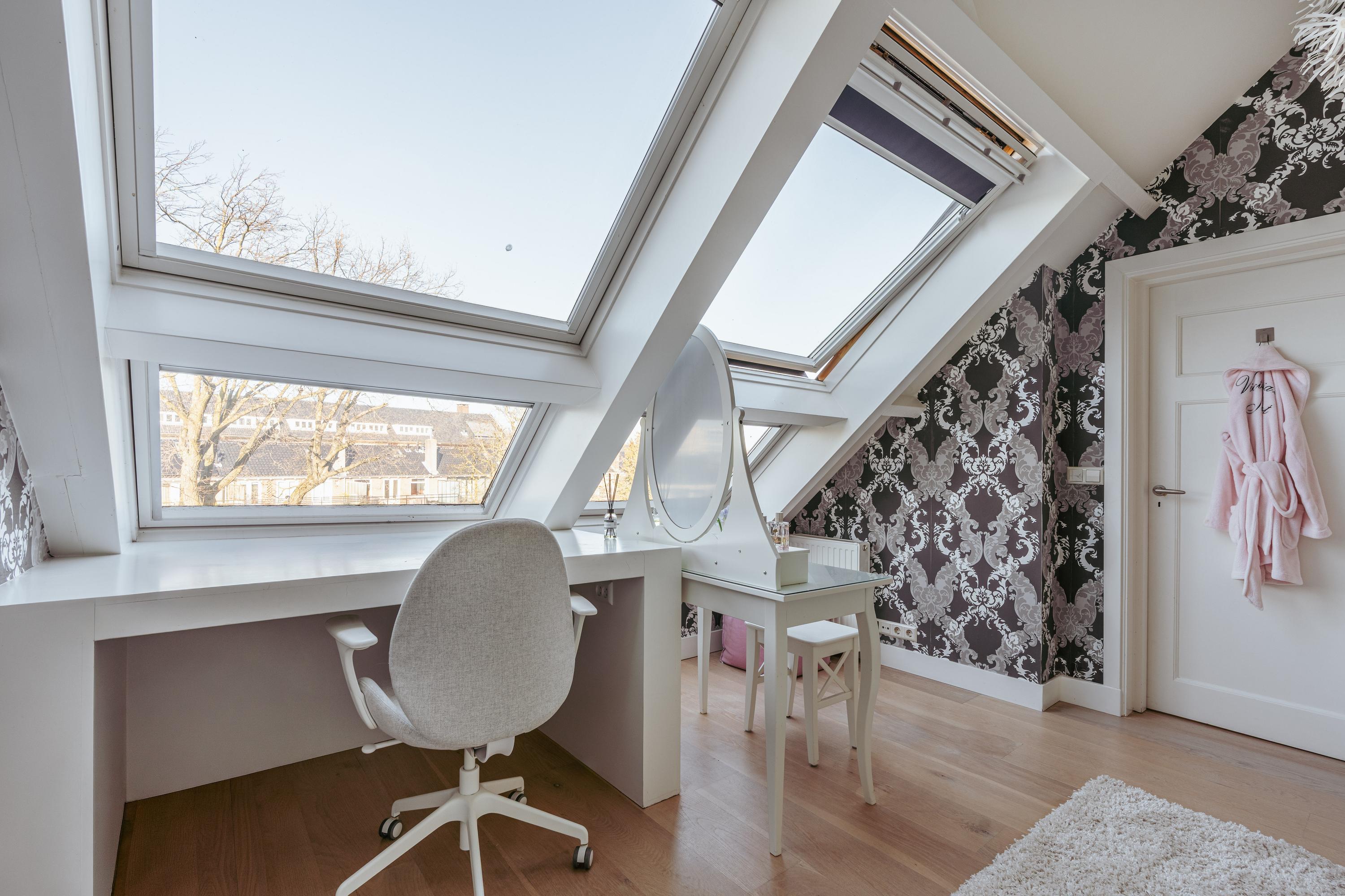Landing with access to the fifth bedroom of this family home. The top floor boasts an impressive ceiling height and multiple windows, creating a bright and spacious atmosphere. The en-suite bathroom is fitted with a walk-in shower, washbasin with vanity unit, and toilet. A practical storage room is also accessible from the landing. This floor is highly suitable as a home office, guest room, or studio.