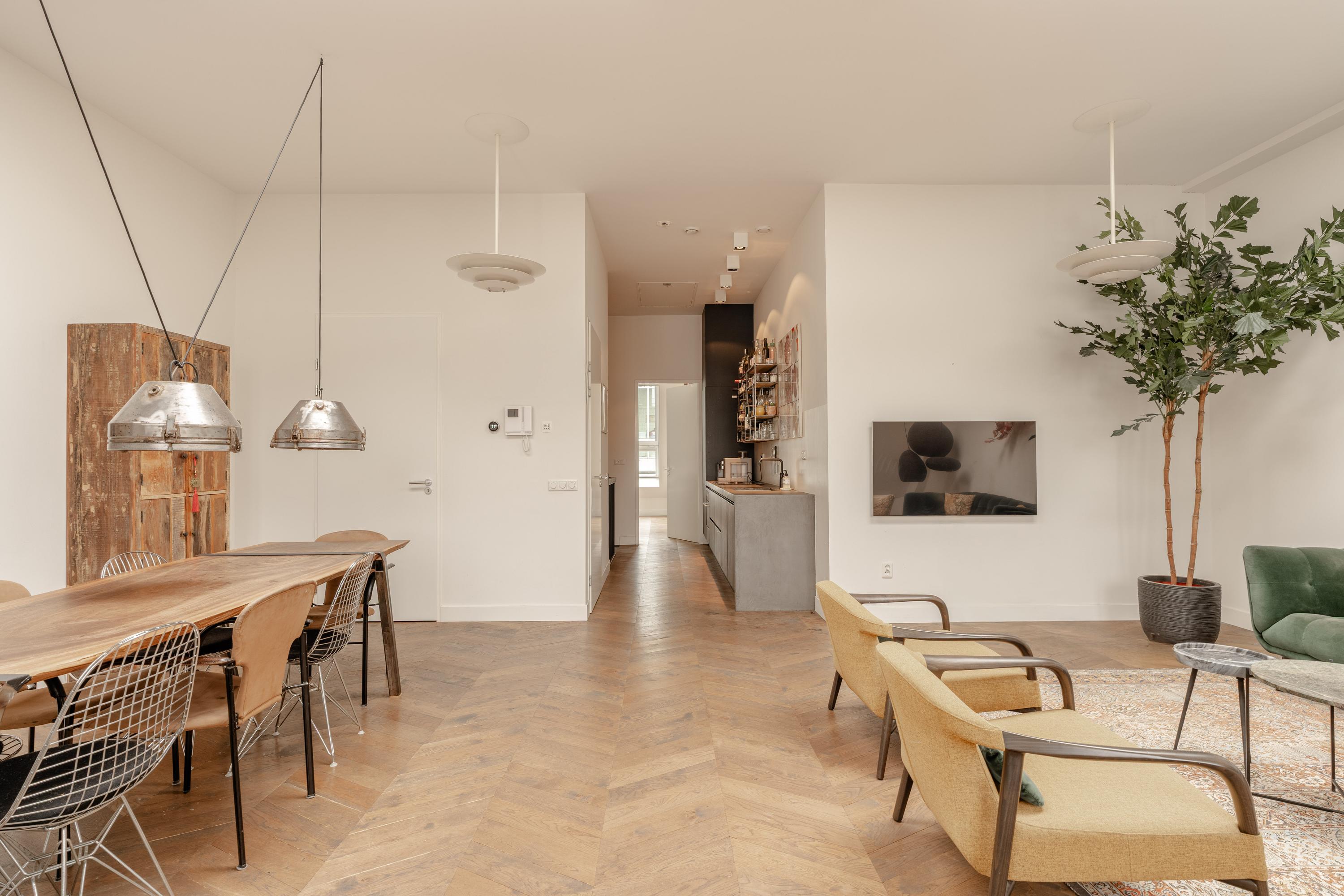In the heart of the highly sought-after Jordaan area, this bright duplex apartment of approximately 108 m² is located within the modern new-build complex “Elandshof”, completed in 2017. The apartment is spread over two floors and features, among other things, two bedrooms, two bathrooms, a spacious living floor with an open kitchen and a roof terrace with views over the rooftops of the Jordaan. Thanks to the high ceilings, skylights and large windows, the apartment benefits from excellent natural light and a wonderful sense of space.