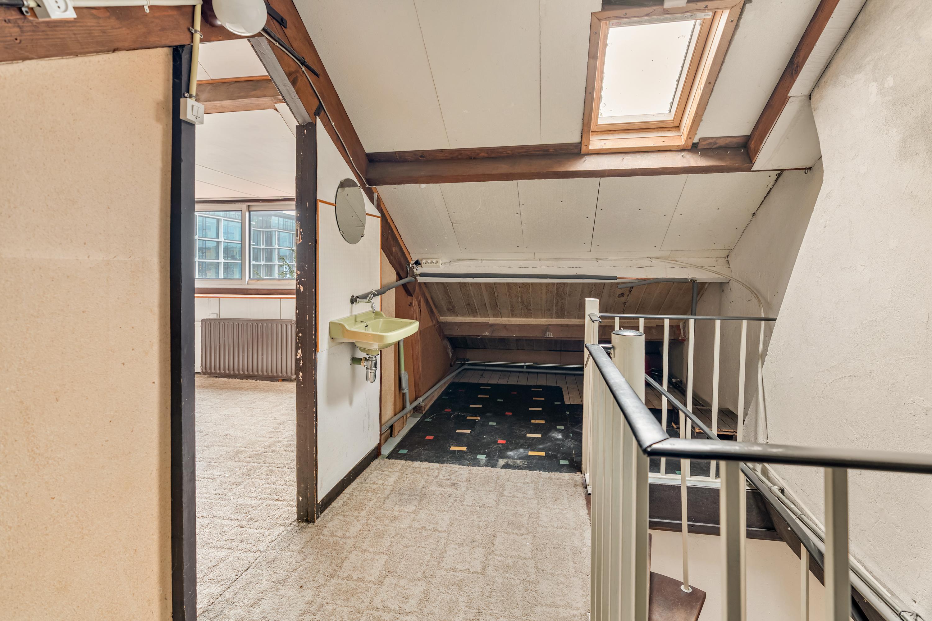 The second floor consists of a landing and an attic room. This floor features exposed wooden beams and a dormer window at the rear, providing ample daylight. On the landing there is a washbasin, washing machine connection and the central heating installation.
