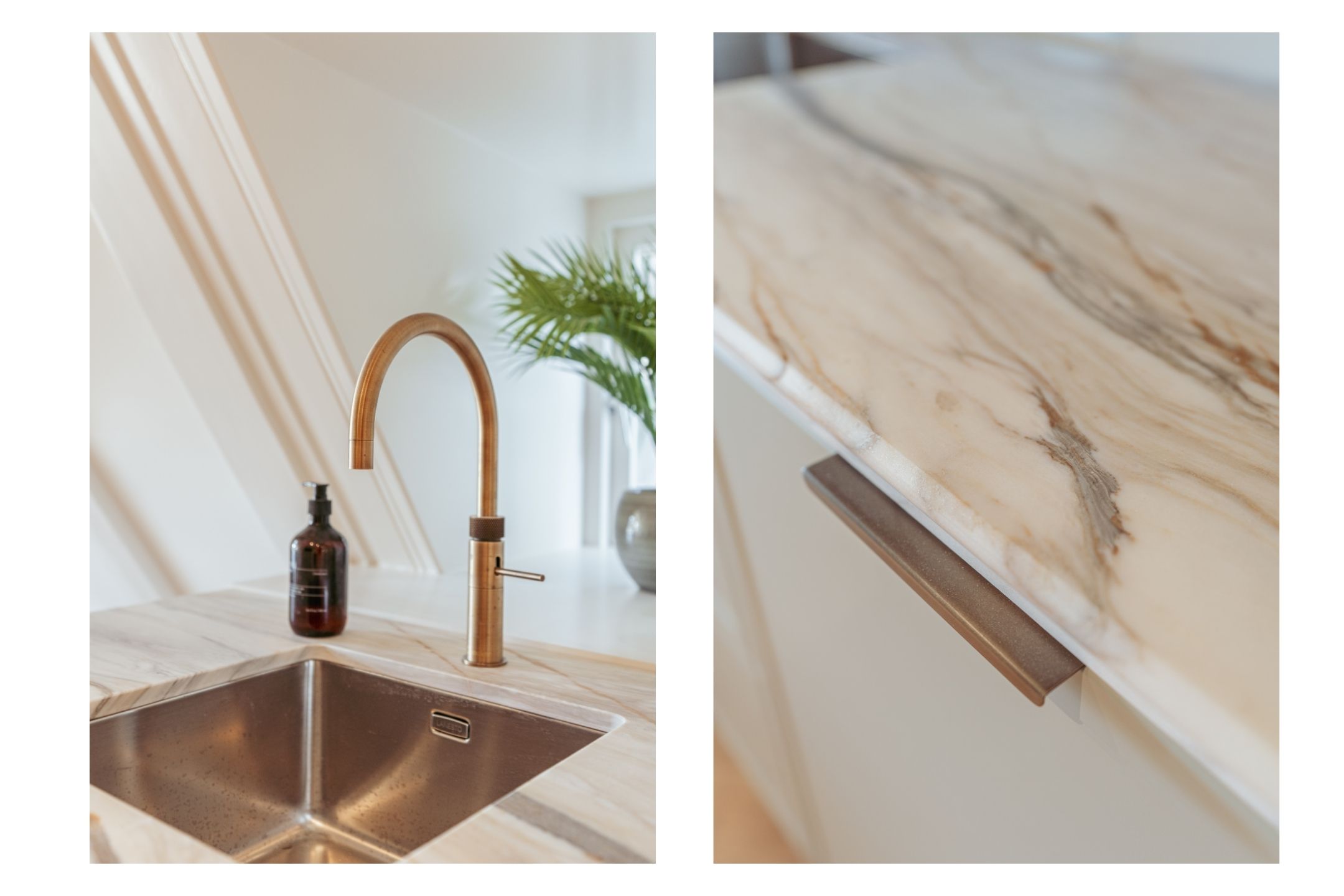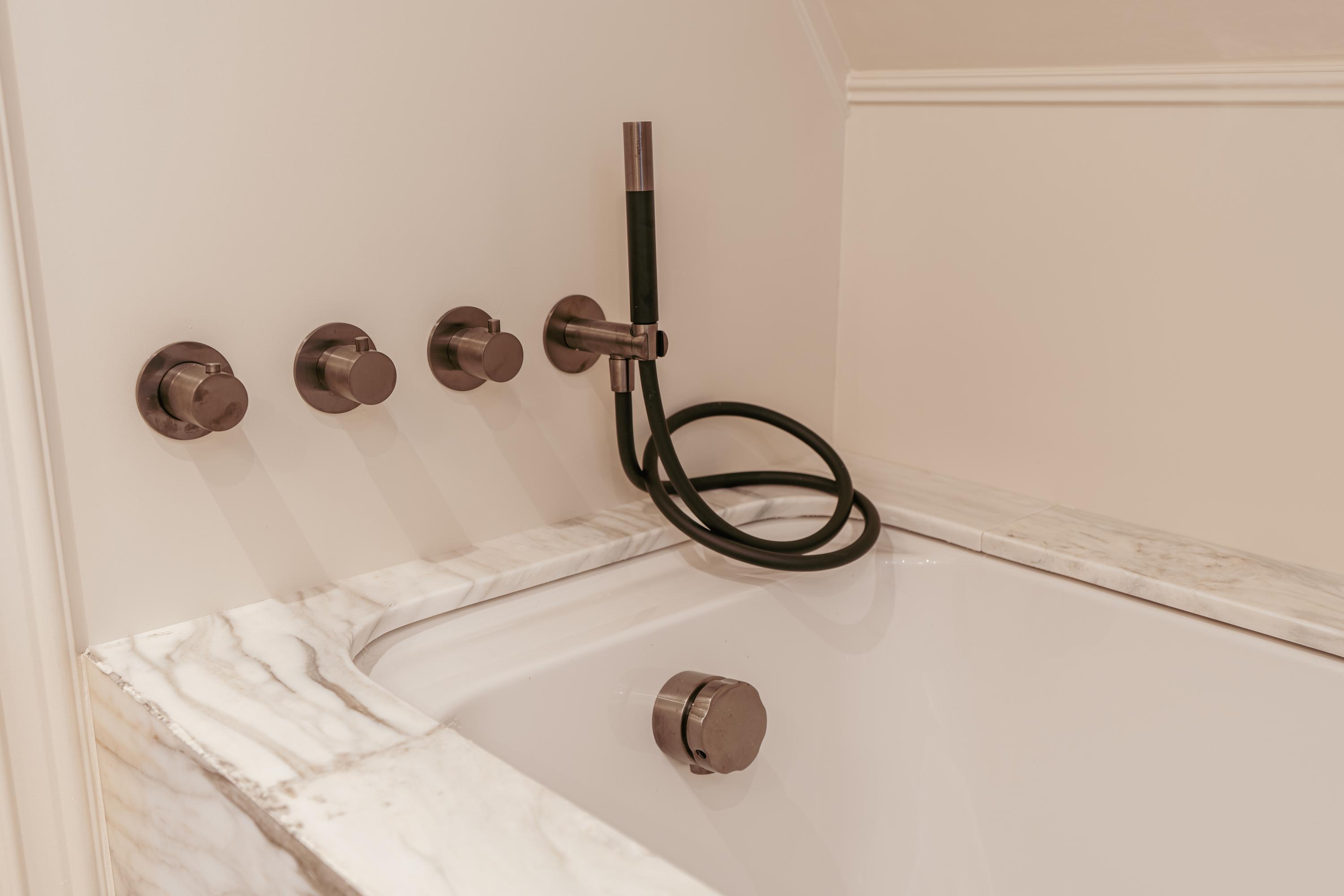 The main living space is situated on the third floor, framed by exposed beams and a gas fireplace, with light drawn in through French windows overlooking the water. Herringbone oak flooring extends throughout, complemented by underfloor heating and meticulous finishes. The luxury open kitchen is fitted with high-spec built-in appliances, including a Quooker tap, Bora induction hob with integrated extractor, and two Siemens Studioline ovens. A glass steel-framed door leads to the hall and a marble-appointed bathroom with double vanity, freestanding bath, and walk-in rain shower. Two bedrooms are oriented towards quiet green courtyard gardens, while a third bedroom with a mezzanine arrangement occupies the top floor.