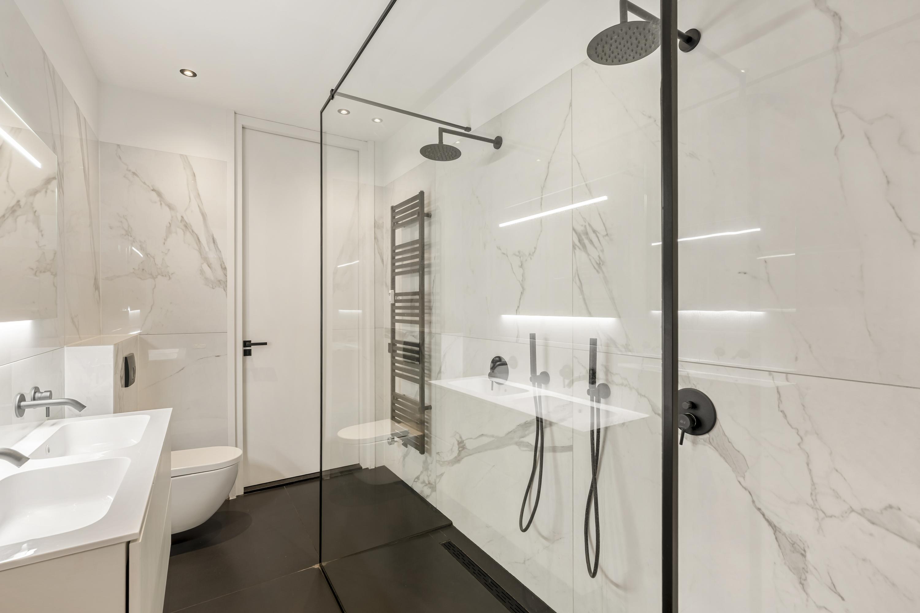 Private front door, with a draft porch leading to the spacious central hall. Exceptionally bright living room with a playful bay window at the front. At the rear is the open kitchen, equipped with all modern conveniences (fridge, freezer, dishwasher, oven, microwave), and access to the terrace, which borders a beautifully maintained communal garden. Both generously sized bedrooms are accessible from the hall. The master bedroom is located at the rear, includes access to a walk-in closet and a large bathroom (also accessible from the hall) with double rain shower, bathtub, double washbasin, and toilet. The guest toilet is separately accessible from the hall. From the hall, there is also access to the laundry closet and adjacent storage cupboard. In the basement of the building, the apartment comes with a spacious storage room.