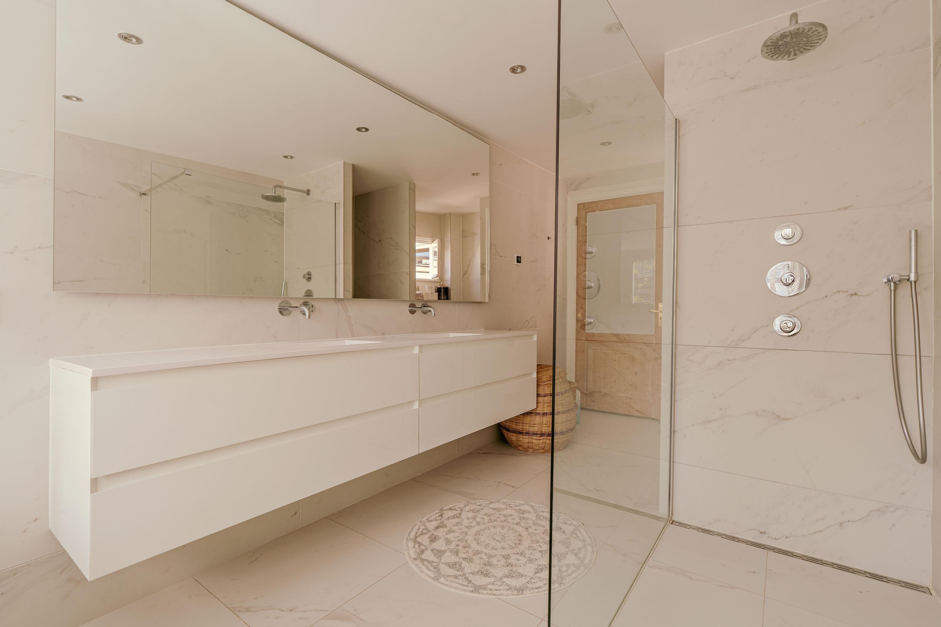 A staircase leads to the landing on the second floor. At the front, you’ll find the second generously sized bedroom, complete with practical built-in wardrobes and air conditioning. This room also offers access to the spacious walk-in wardrobe of approx. 9 m², also located at the front of the apartment and accessible from the central landing. At the rear lies the master bedroom with French doors leading to a delightful balcony, again facing south-east. From the landing, you can access the raised bathroom at the rear, which includes a large bathtub, walk-in shower, double washbasin with vanity unit, a toilet, urinal, and connections for a washing machine and dryer. Electric shutters are also present at the rear on this level. The two bedrooms on this floor are connected via a central landing with ample built-in cupboards. A second staircase leads you to the third and top floor of the apartment.