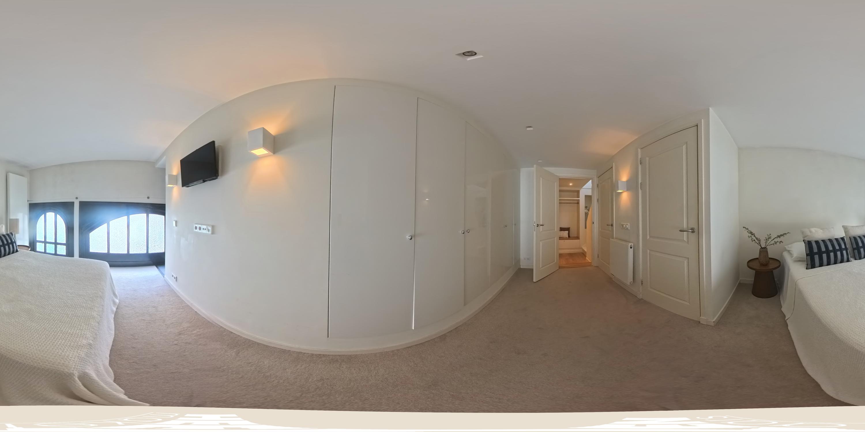 At the front is the large master bedroom, complete with built-in wardrobes, large windows, and an en-suite bathroom with a walk-in shower, washbasin, and WC. At the rear is the third, well-proportioned bedroom, featuring custom-made wardrobes and French doors opening onto the second balcony. Adjacent is the laundry room with a sink, which also provides access to the balcony.