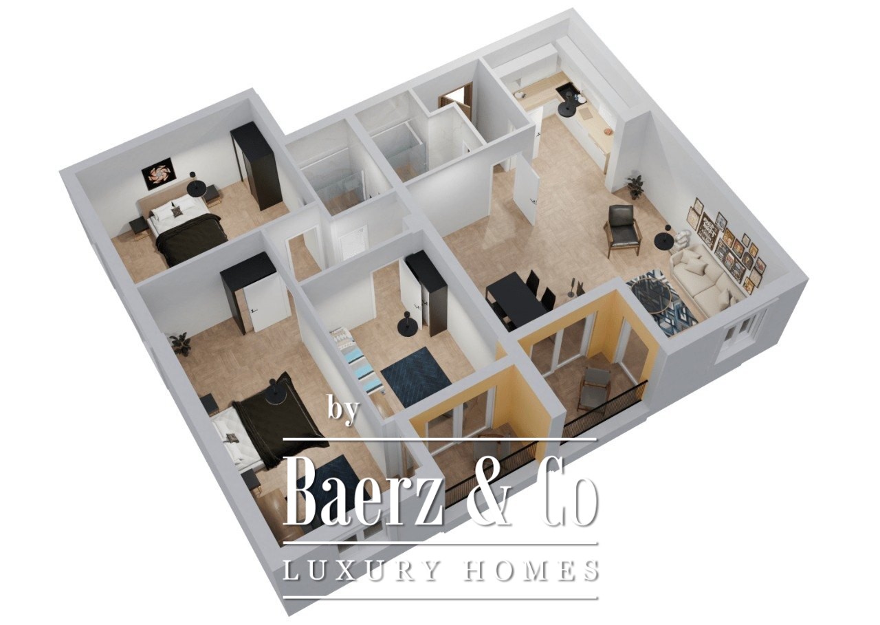 The apartment’s layout is refined and functional, featuring a living area with a kitchen and dining space, three bedrooms, two bathrooms, and two terraces. The interiors will be delivered complete, with finished floors, tiled surfaces, air conditioning, and fully equipped bathrooms. The elevated aspect ensures abundant light while framing the coast and rugged heights that define the setting.