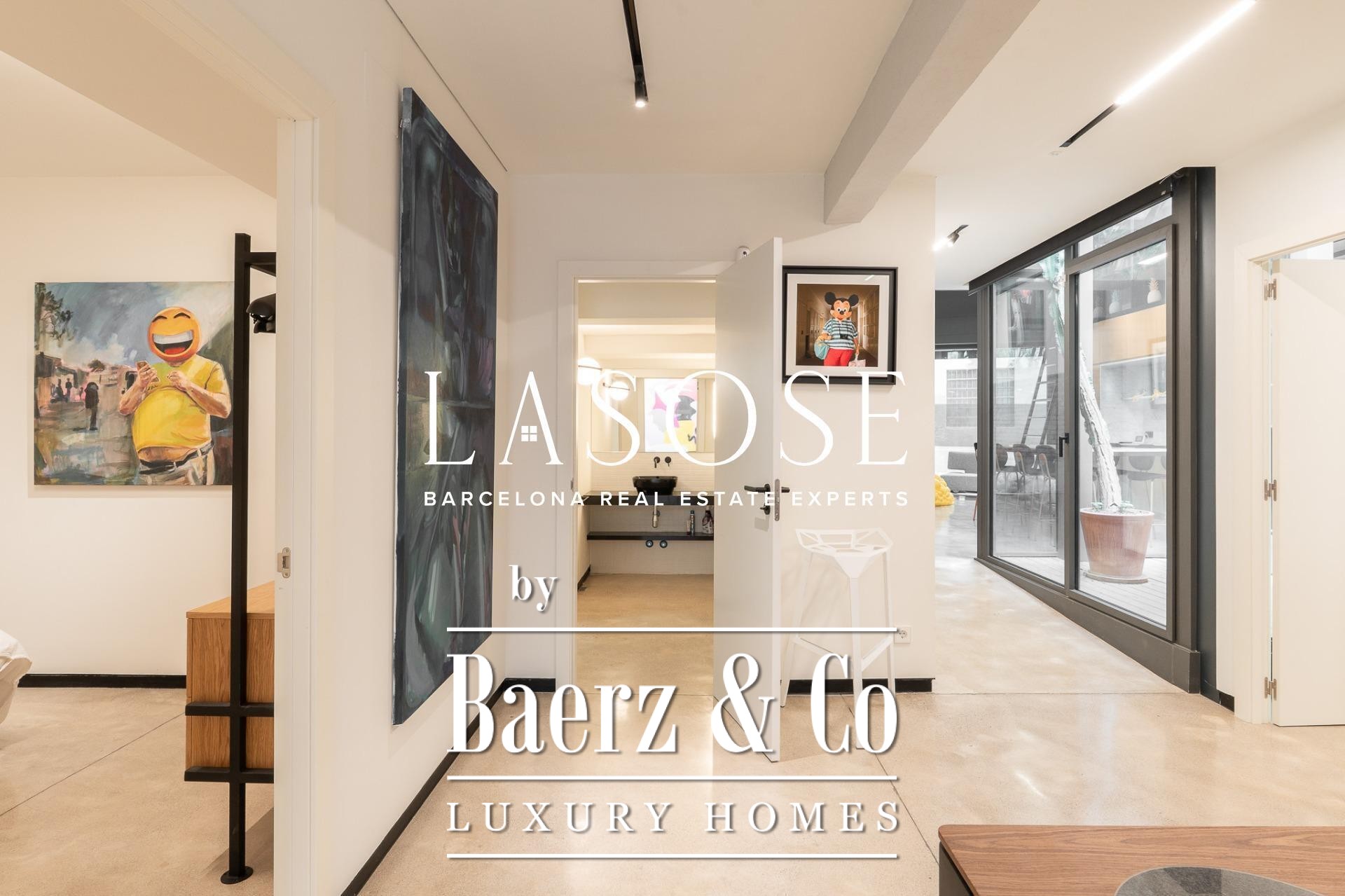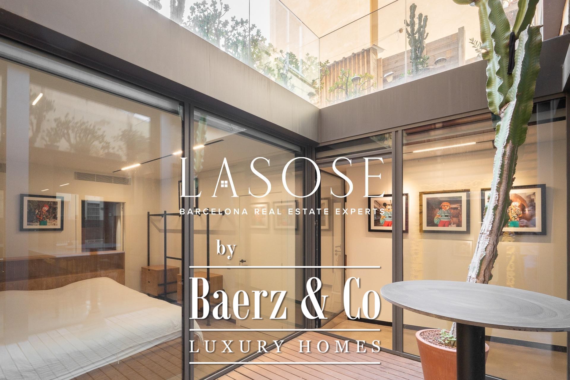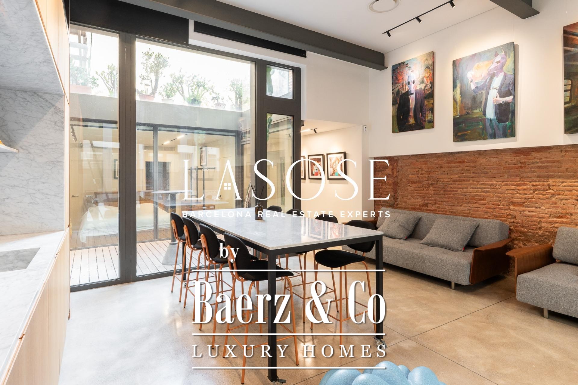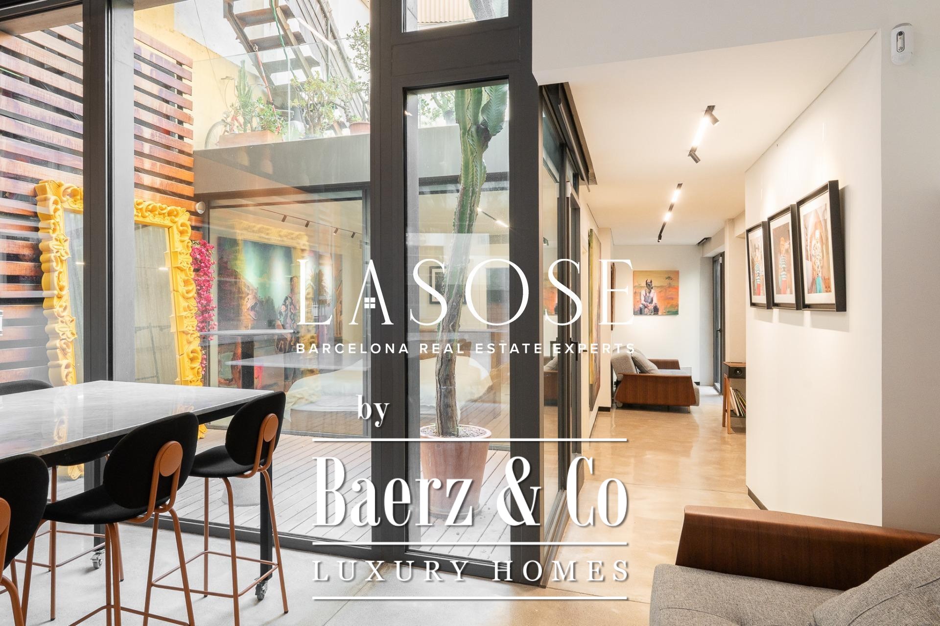 Apartment Barcelona offers a distinct spatial experience in the heart of the city. From the moment you enter, an immediate sense of calm and spaciousness unfolds, complemented by carefully articulated interior patios that draw midday sun deep into the living space. The property extends across 105 m², encompassing three bedrooms and two bathrooms, with polished concrete floors and anti-intrusion glazing establishing a refined yet secure atmosphere. Its open-plan footprint results from the transformative merger of four units into a singular living environment, now fully furnished with curated design pieces and appliances.