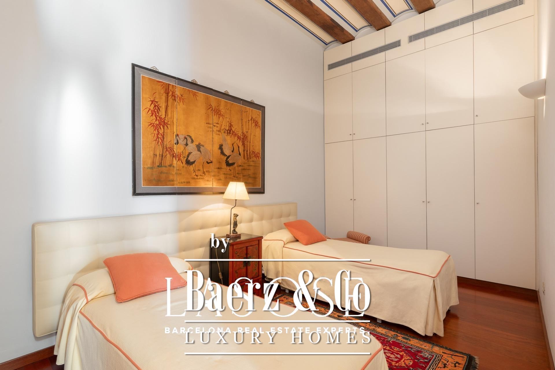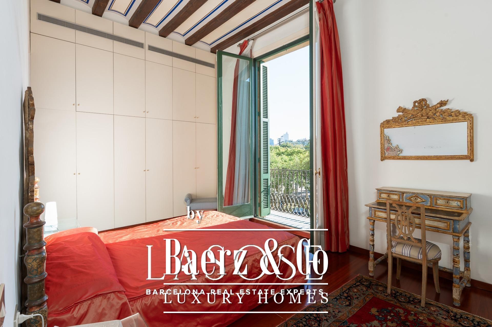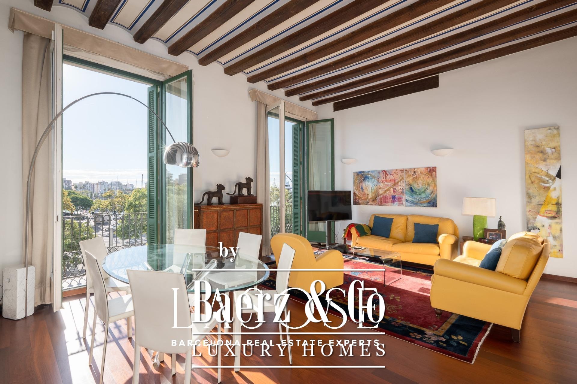 Apartment Barcelona sets its stage within a historic building overlooking the city’s marina. This apartment, spanning 122 m², occupies a distinguished address on Carrer Llauder and presents a rare interplay of heritage and contemporary living. Step inside to a volume defined by 3.8-meter ceilings, exposed wooden beams, and Catalan vaulted ceilings with hand-painted details. Wrought-iron balconies frame the open sea and the greenery of Las Ramblas de Mar, filling each room with Mediterranean light.