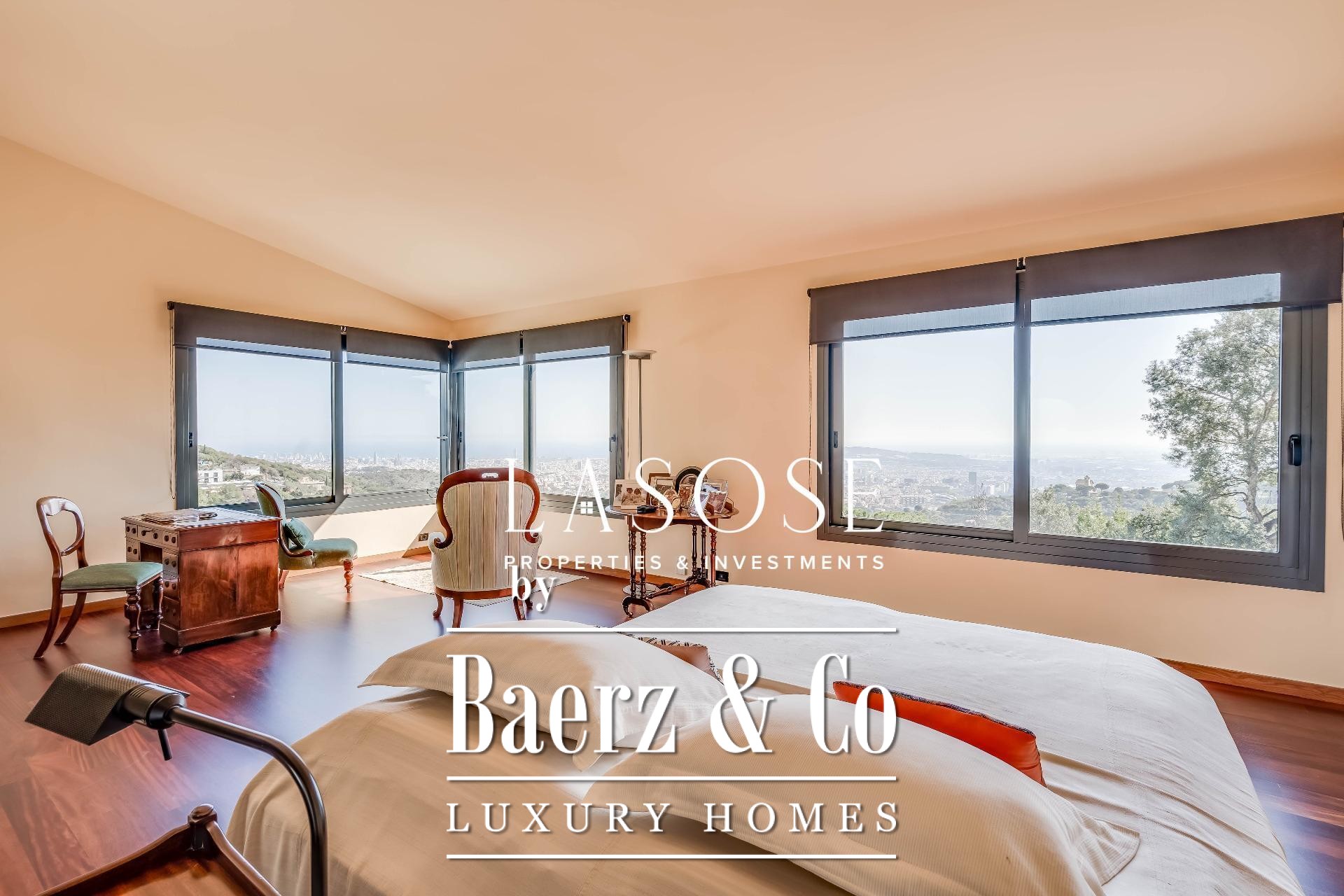 Entering the main floor, an expansive hall leads into an impressive living and dining area. This central space opens out to a 90 m² terrace, framing unobstructed vistas over Barcelona and Collserola Park. The independent kitchen is fully equipped and augmented by a pantry and laundry area with separate entrance, while an adjacent bedroom with bathroom serves flexibly as a guest suite or additional living area. Underfloor slate heating carries throughout the ground level, complemented by direct internal access to a two-car garage.