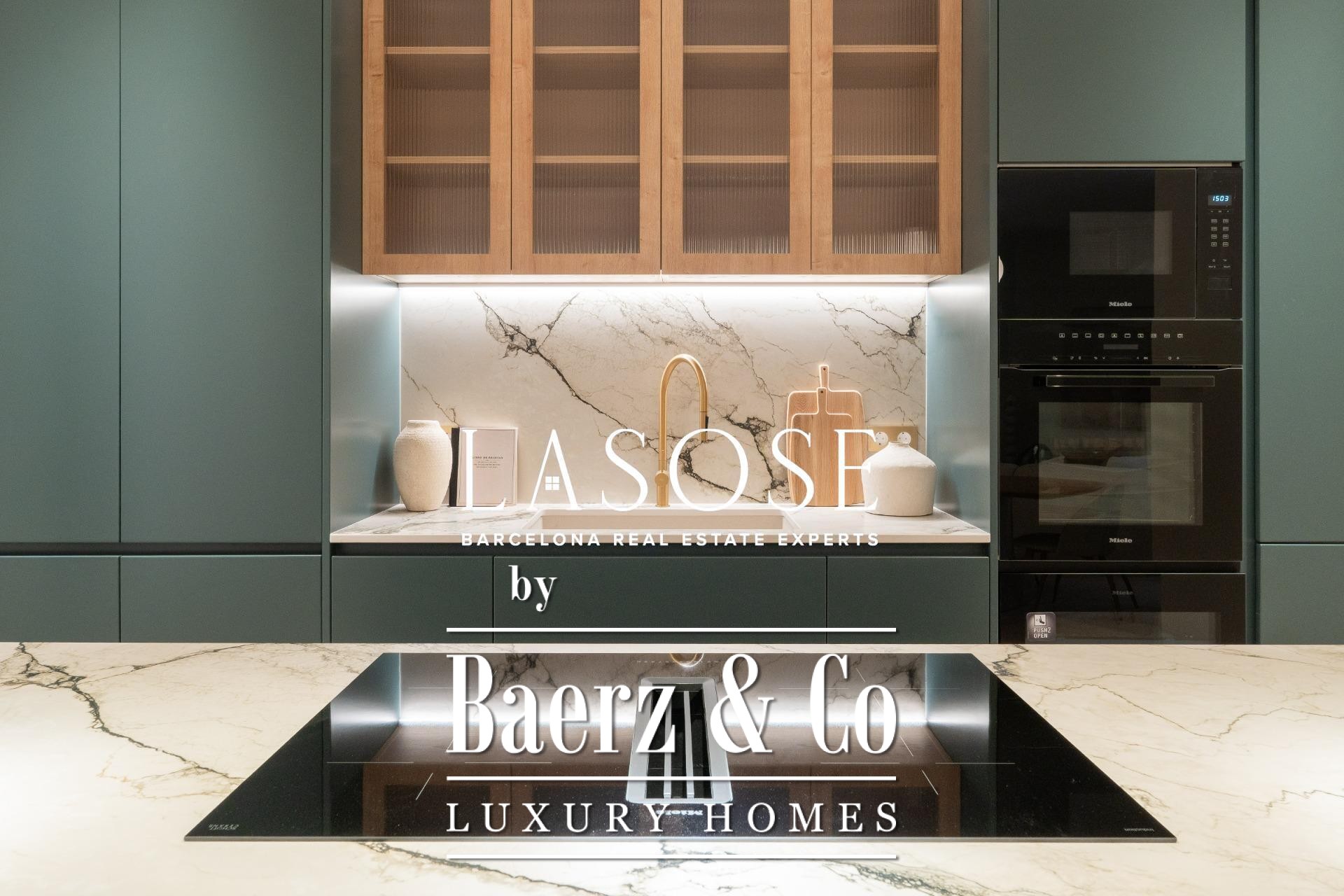 The penthouse has undergone a comprehensive renovation using high-end materials, yet preserves select original features such as hydraulic tile floors and wooden carpentry. The interior includes three double bedrooms, two of which are en-suite, and three full bathrooms. The spacious living-dining area is anchored by an open-plan designer kitchen with a central island, Miele and Liebherr appliances, Neolith countertops, and lacquered cabinetry. Balconies, a storage room, and a dedicated laundry area enhance daily living. The building itself offers an elevator and concierge service, underscoring the commitment to comfort and security.