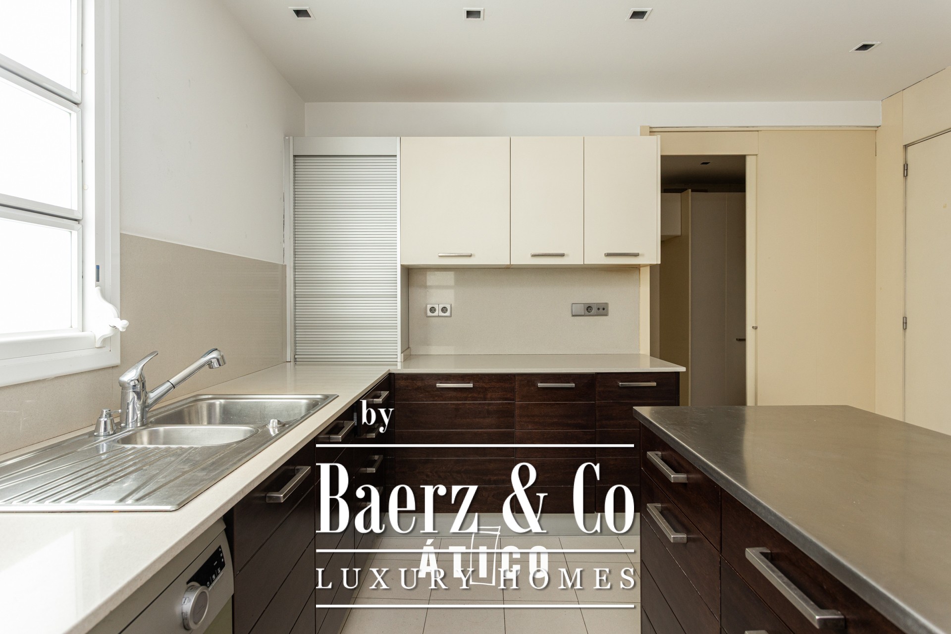 At the heart of the penthouse are two expansive terraces: one facing east framing panoramic views of the coastline, the other westward towards Tibidabo mountain, capturing the essence of Barcelona’s landscape. The kitchen, featuring a breakfast area, awaits personalisation and includes a dishwasher for convenience. Parquet floors run throughout, adding warmth underfoot, while practical amenities such as concierge service and two elevators reflect refined urban living.