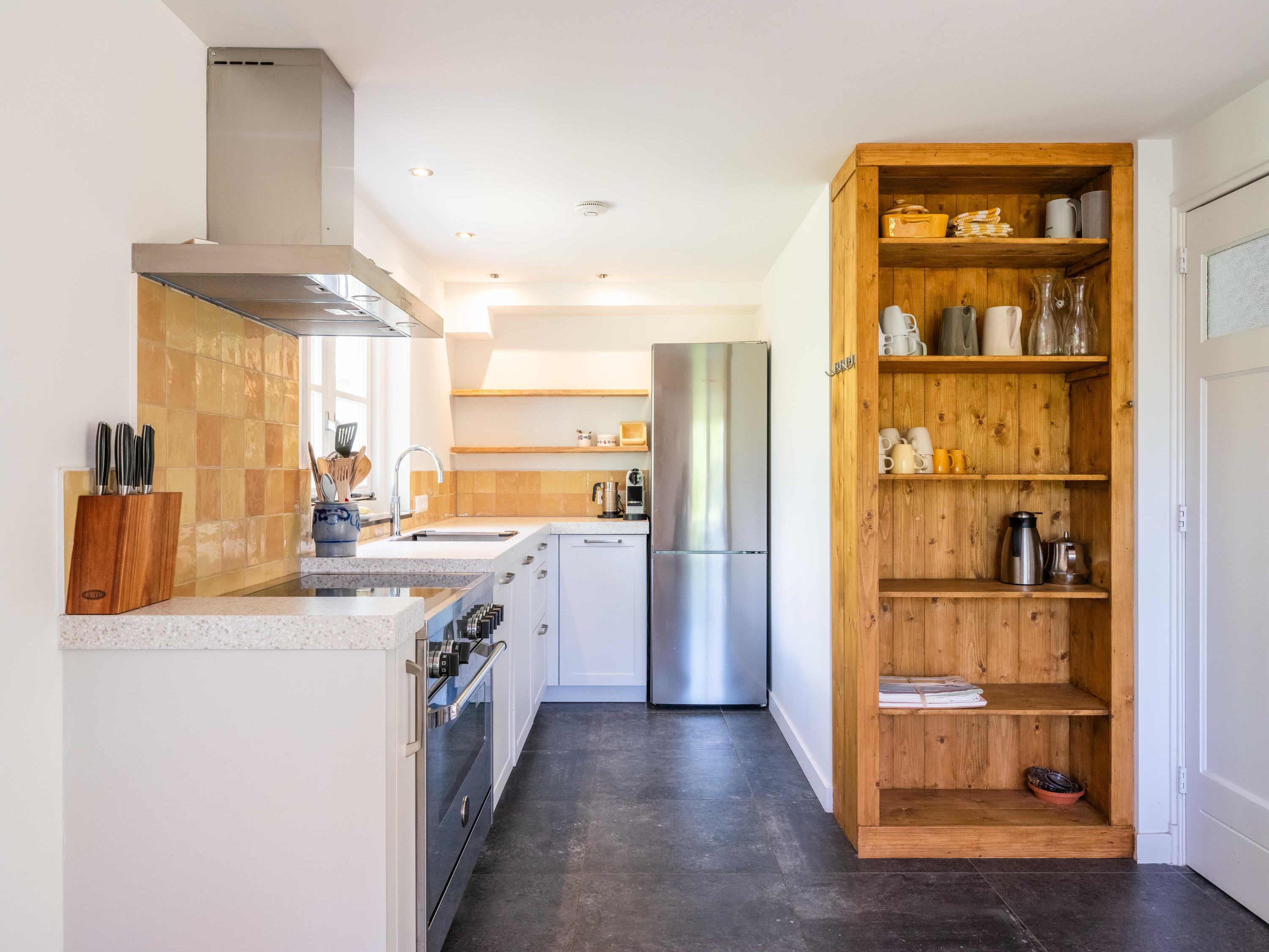 The kitchen is a pleasant place for the whole family, equipped with all conveniences: a Quooker, dishwasher, extractor hood, large oven with induction hob and a separate fridge-freezer. The kitchen also provides access to the meter cupboard.