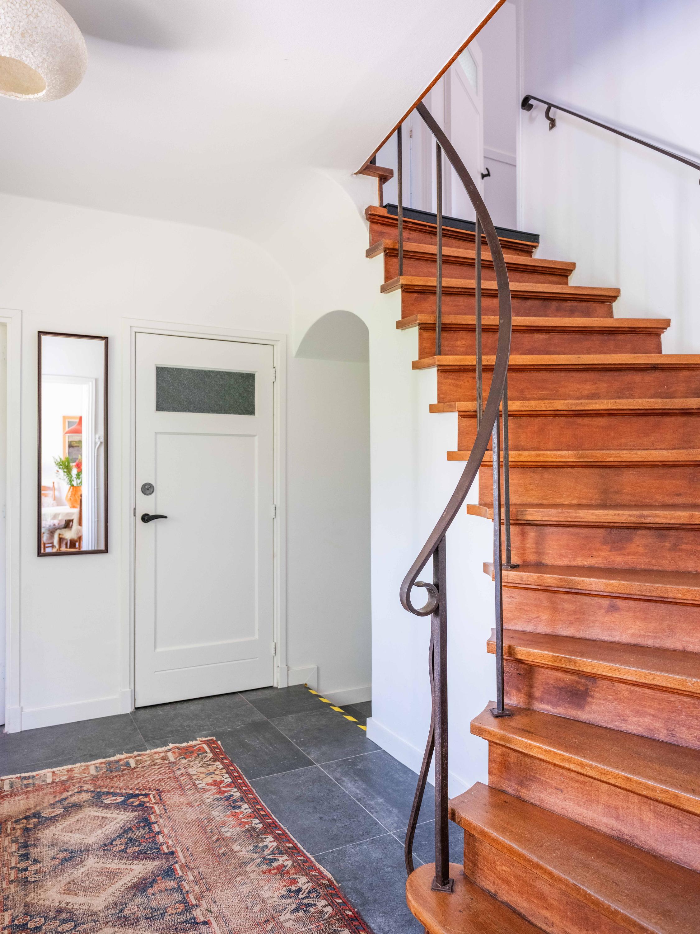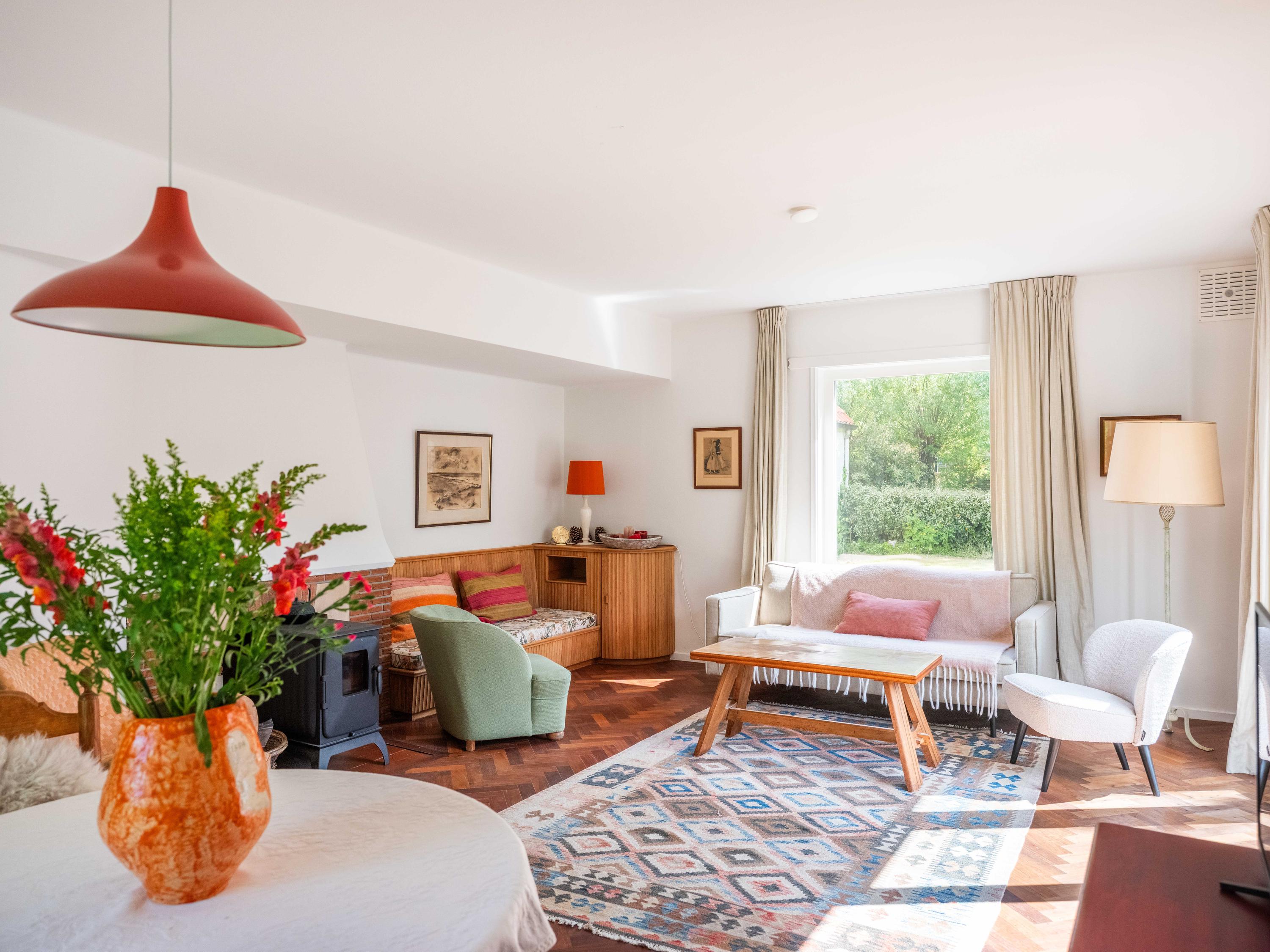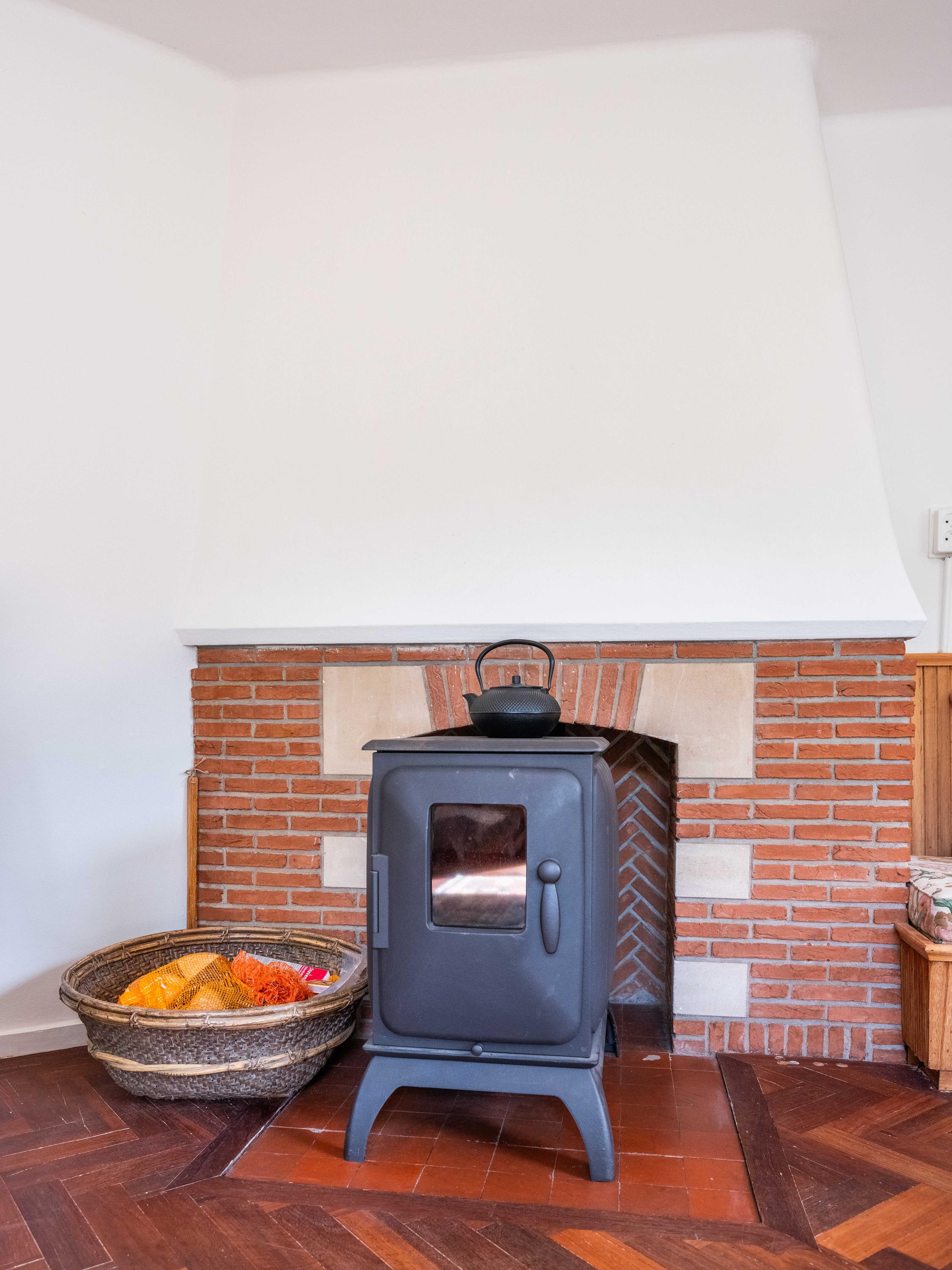 Let us take you inside. Upon entering, you will immediately notice the beautiful entrance hall with a stylish staircase with wrought iron banister, a modern toilet and a handy basement cupboard. The living room is light and cosy with original wooden parquet flooring, a wood-burning stove and French doors opening onto the green garden. Built-in custom wooden cupboards add extra charm and storage space.