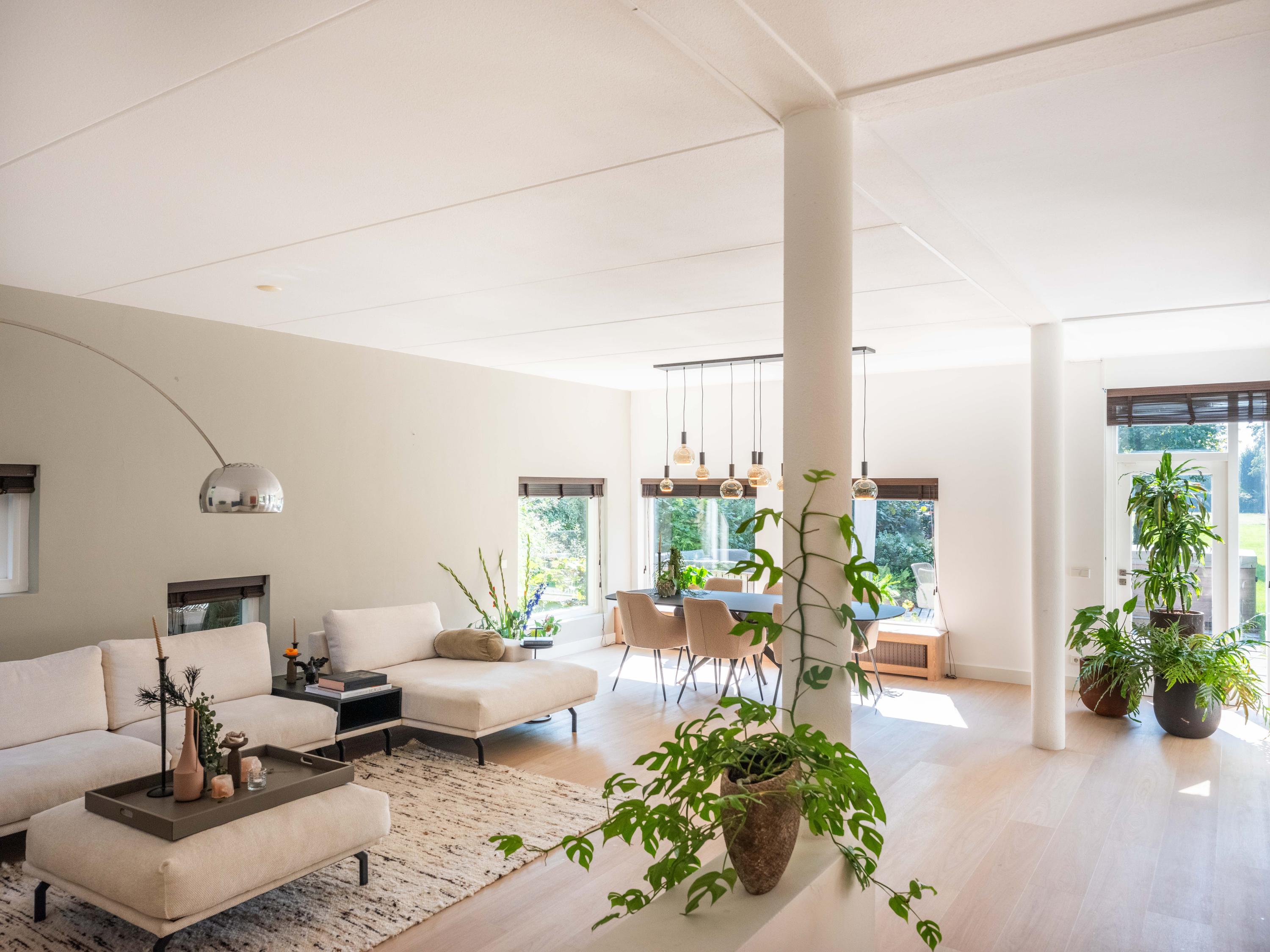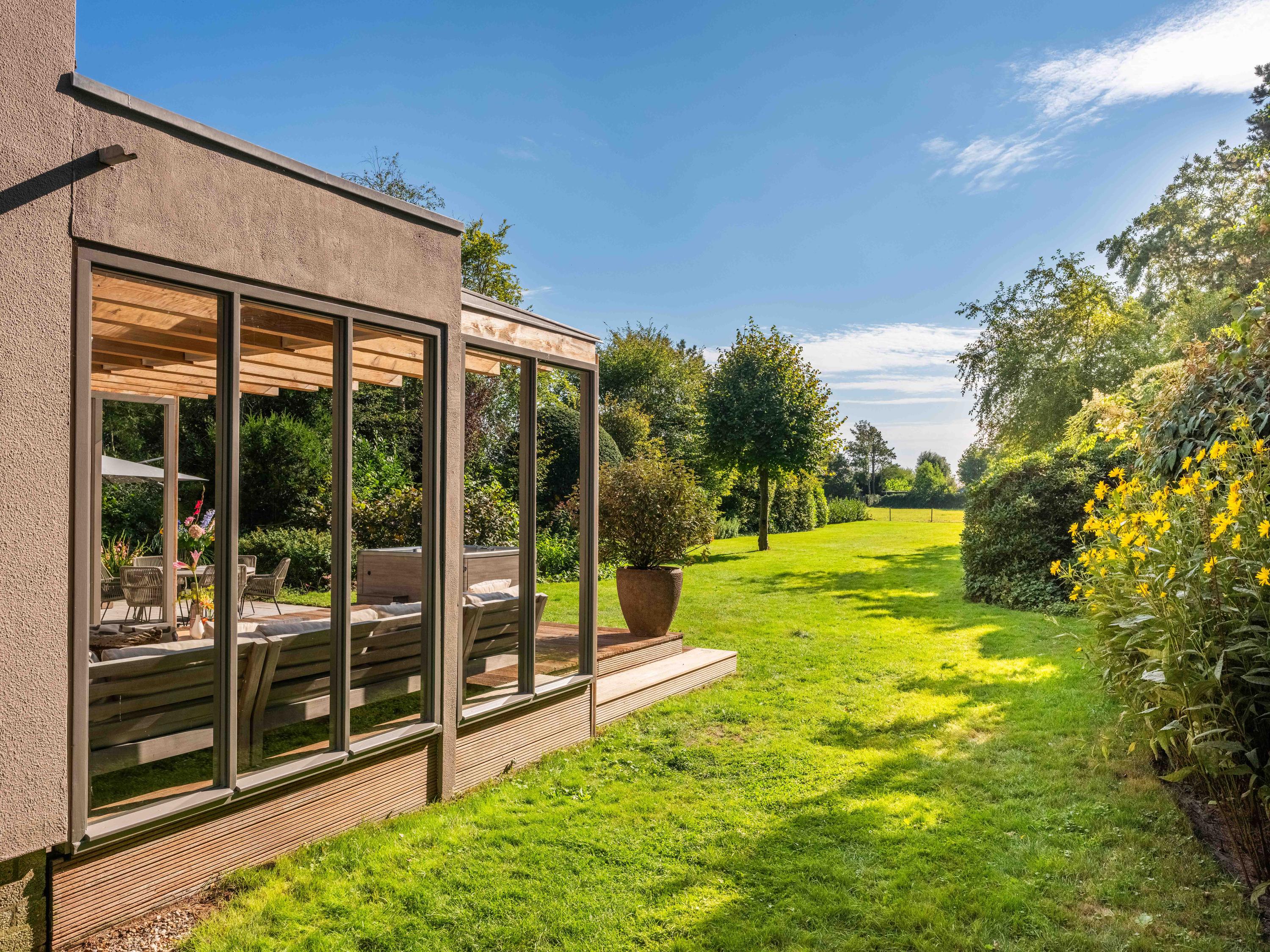 Main residence is a 344 m² architect-designed villa completed in 1984, exuding a calm, contemporary energy throughout. The generous living room captures daylight and open meadow prospect, complemented by a fireplace for evening warmth. In the kitchen, an island connects family gatherings with views of green, while French doors and a covered, heated terrace blur boundaries between indoors and out. Appliances include a quooker, professional stove with teppanyaki and deep fryer, steam oven, wine cooler, and more. Adjacent utility spaces offer further practicality.