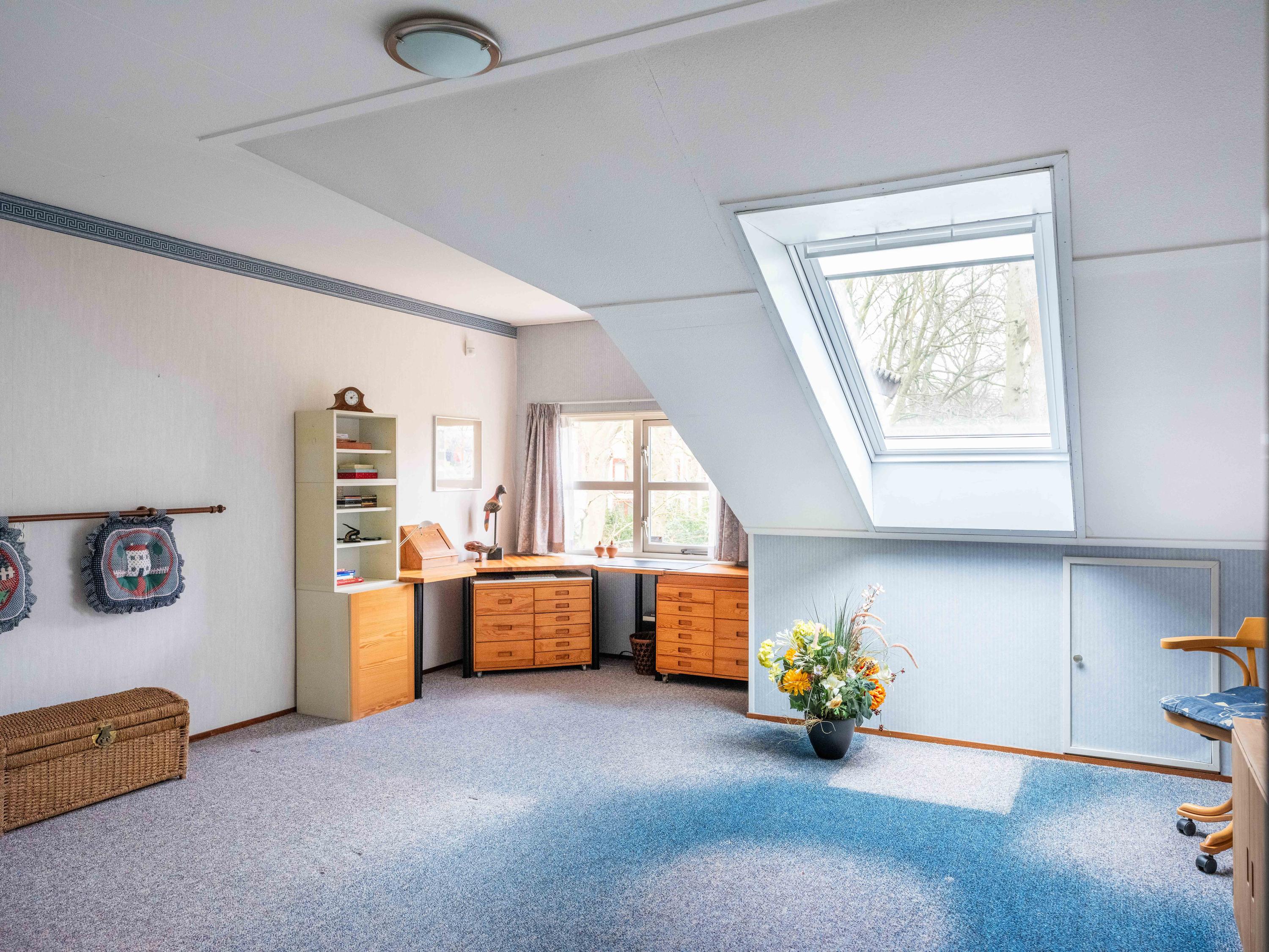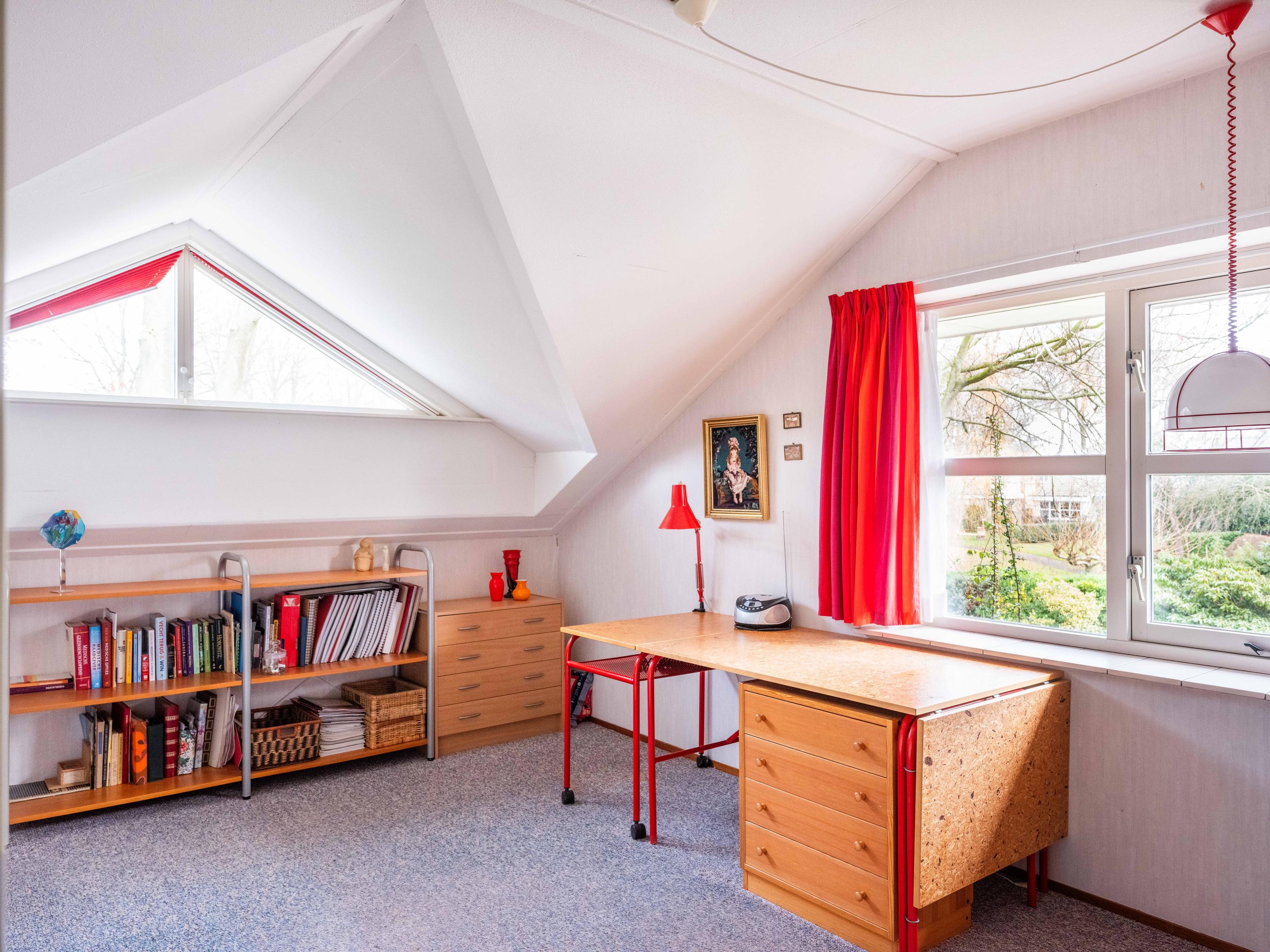 On the ground floor, you will also find a spacious room on the garden side, which can be used as an office, but is also ideal as a bedroom. The bathroom on the ground floor has a bathtub with shower, double sink, and toilet.