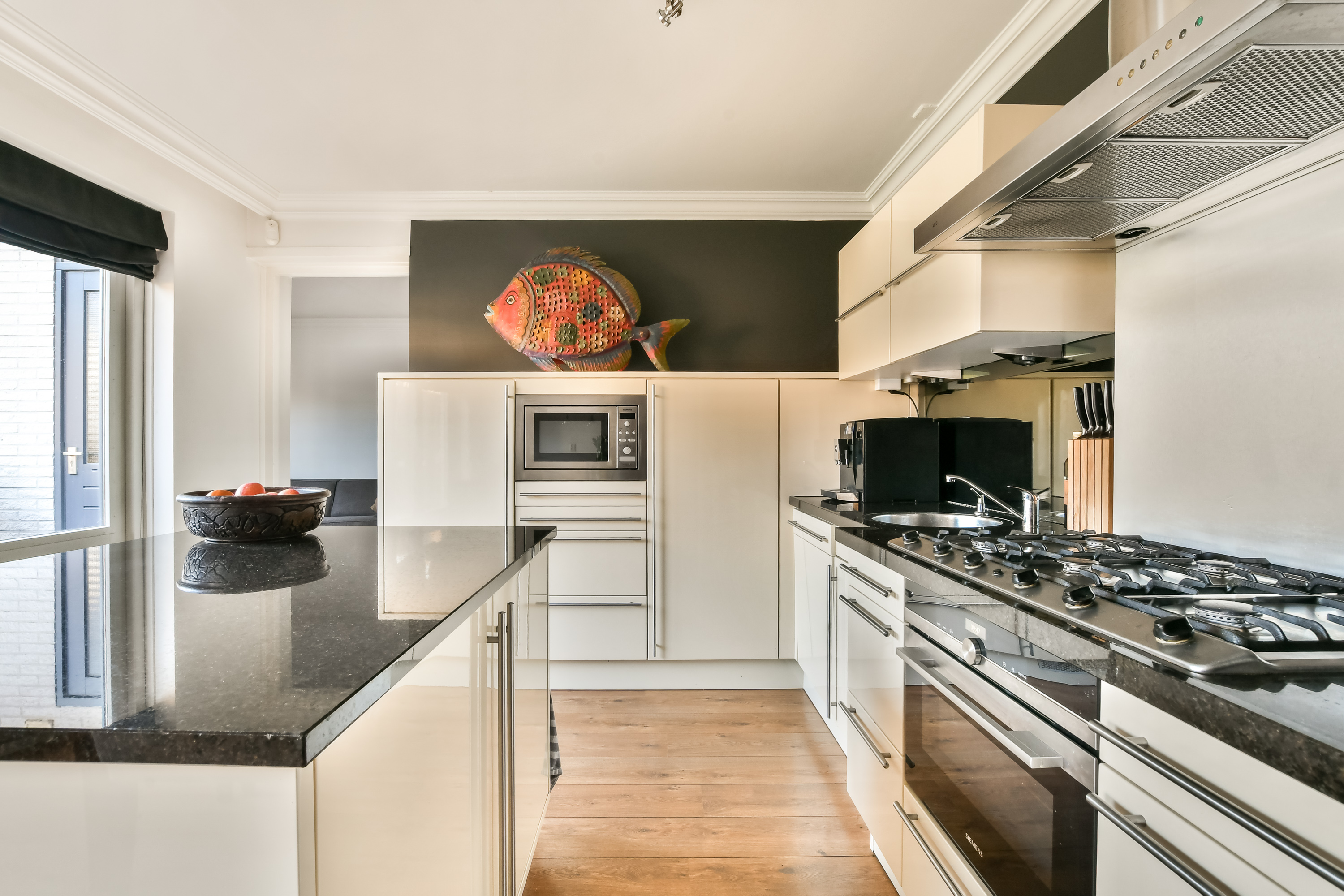 De open leefkeuken bevindt zich aan de achterzijde en is uitgerust met diverse inbouwapparatuur, waaronder een gasfornuis, afzuigkap, magnetron, oven, vaatwasser en koelkast.