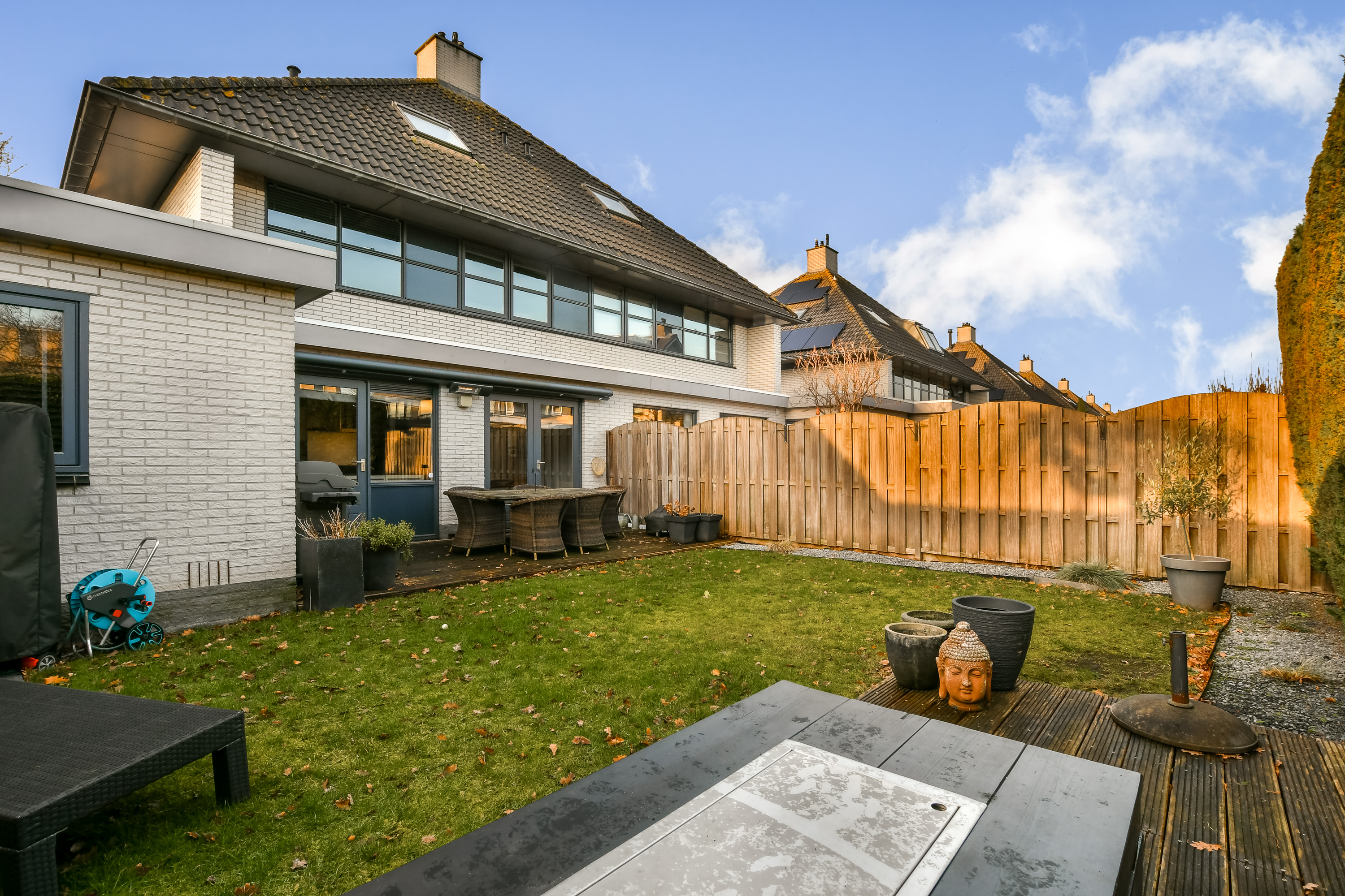 De fraai aangelegde achtertuin is gelegen op het noordoosten. Dankzij de slimme plaatsing van de terrassen kun je hier de hele dag van de zon genieten. De tuin is bereikbaar vanuit zowel de woonkamer als de multifunctionele ruimte en is voorzien van een elektrisch zonnescherm en een heater.