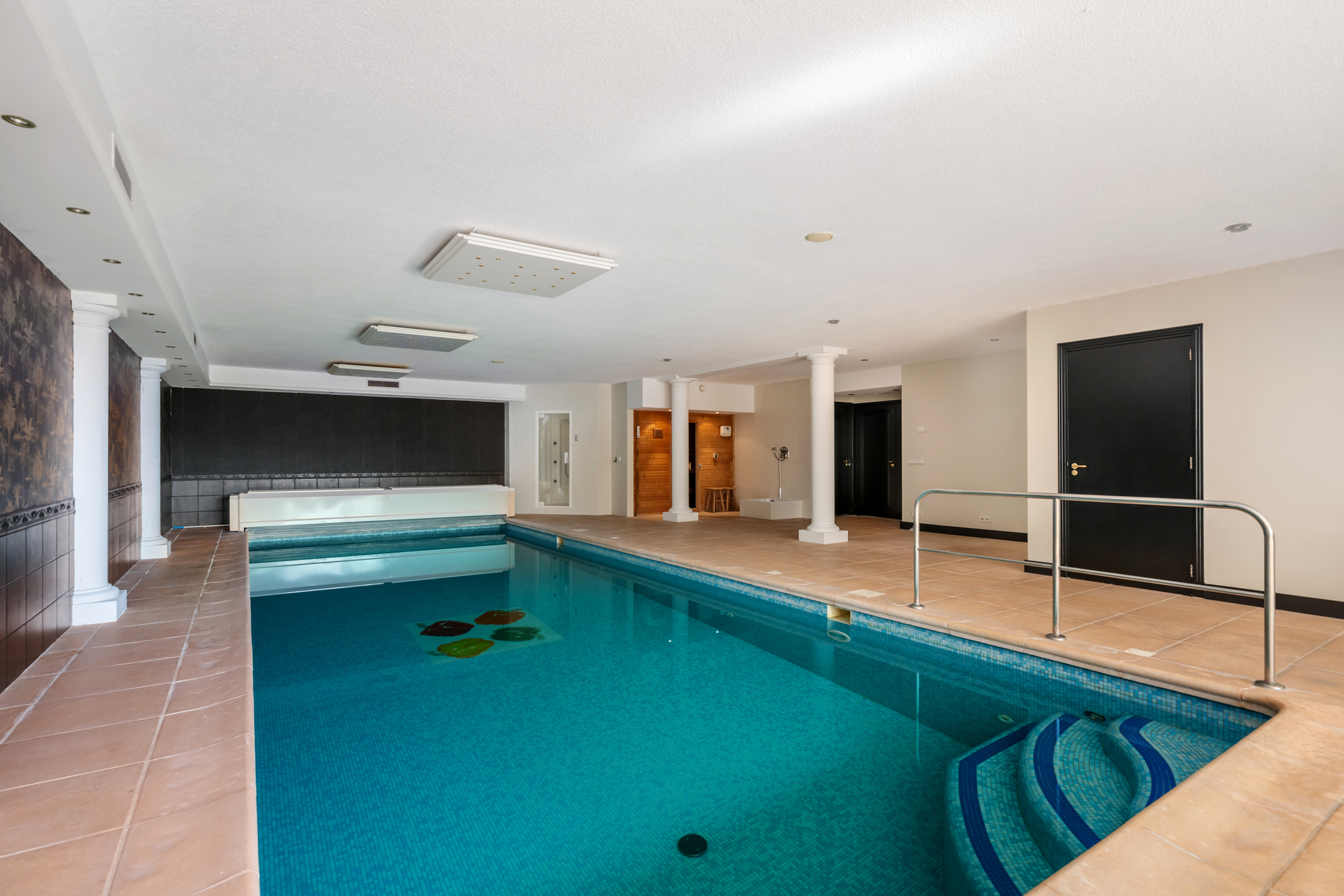 Through French doors, you enter the wellness area, which includes a technical room, pantry, sauna, toilet, and a luxurious indoor swimming pool. Sliding doors from the wellness area lead to the rear garden and the detached garage, which has a hobby greenhouse attached to the back.
