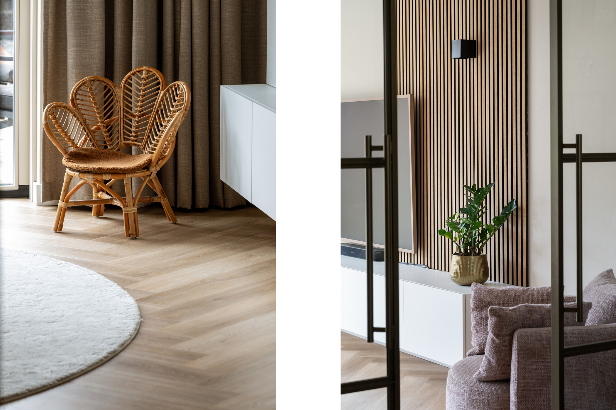 This room is particularly remarkable for the extensive built-in storage that reaches up to the high ceiling. This custom solution provides ample storage space, beautifully integrated yet always within reach. Additionally, extra storage is cleverly incorporated in a raised niche—perfect for suitcases and seasonal items.