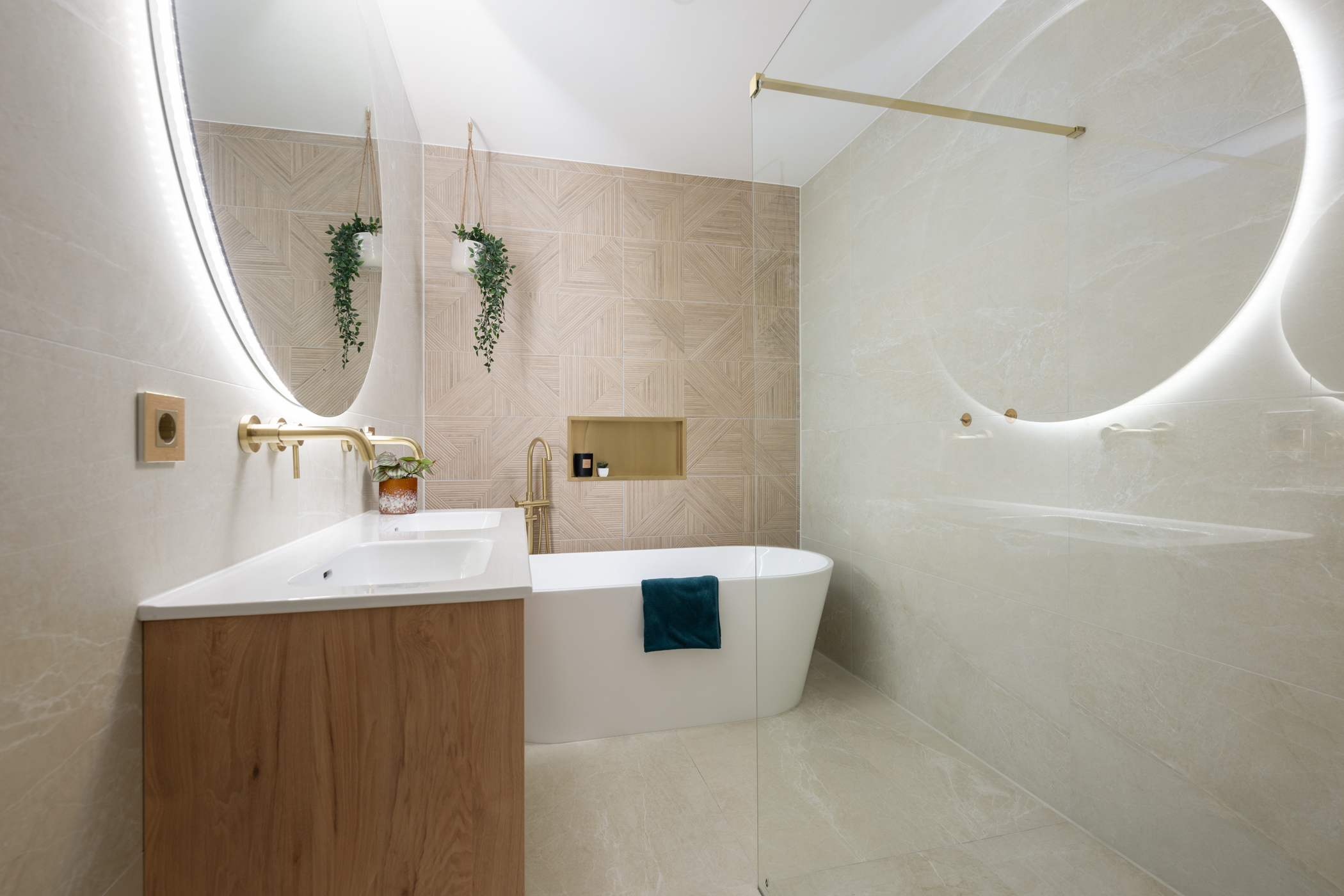 The modern bathroom is a relaxing retreat, featuring a luxurious bathtub, a spacious walk-in shower, and a double sink. Every detail has been carefully finished, allowing you to start or end your day in complete comfort.