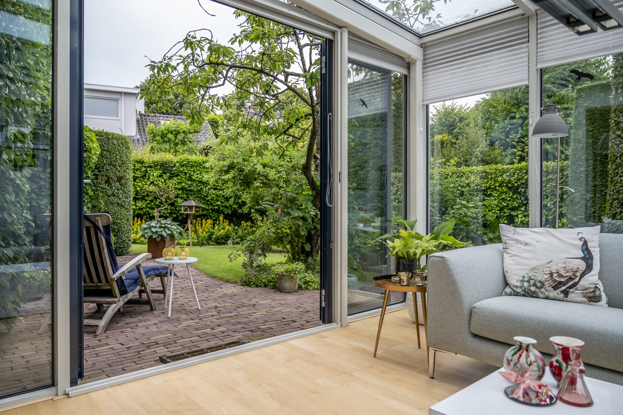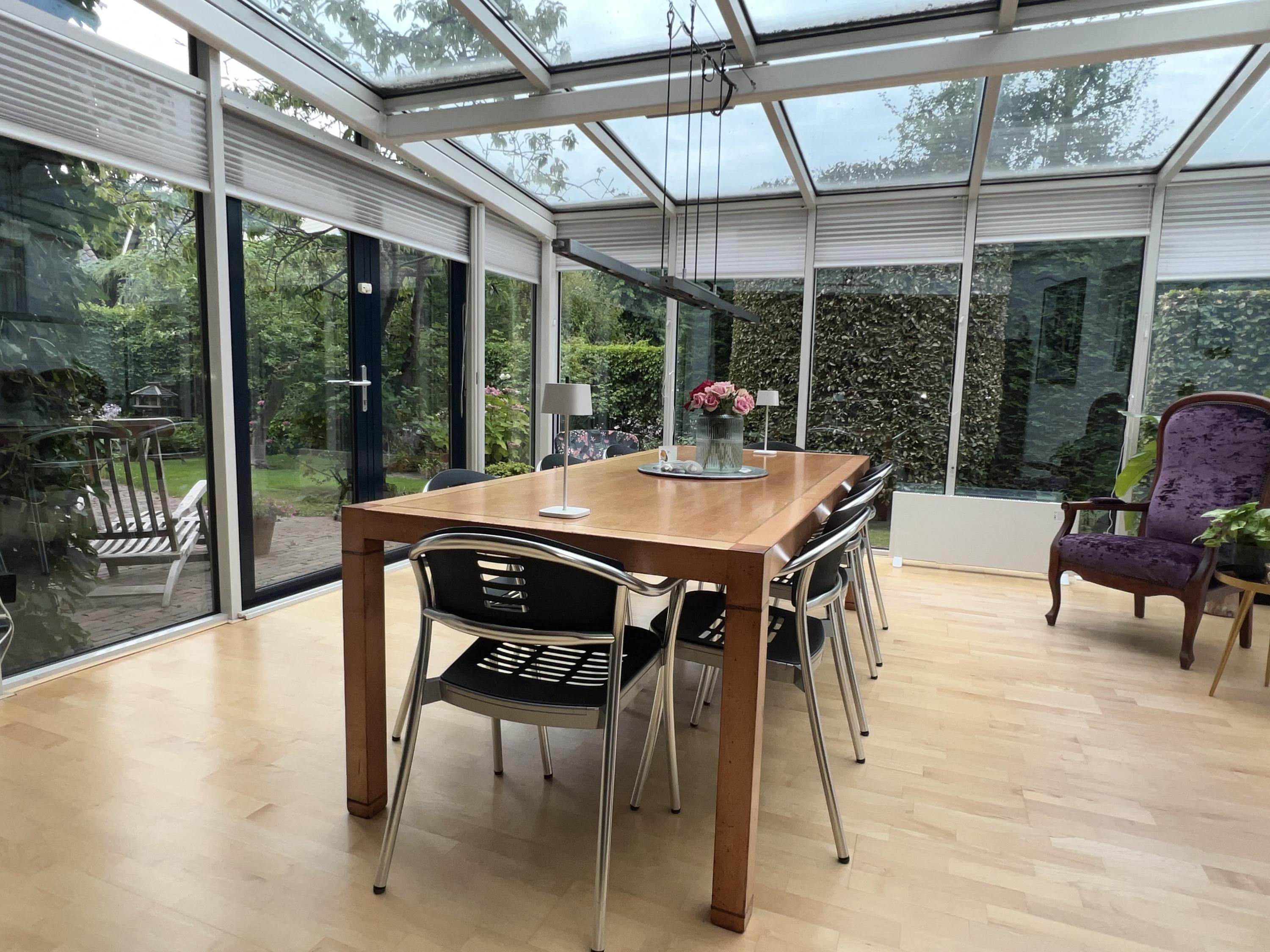 The conservatory is located on the side of the house – a wonderfully bright spot to enjoy the morning sun and relax with a view of the stunning garden.