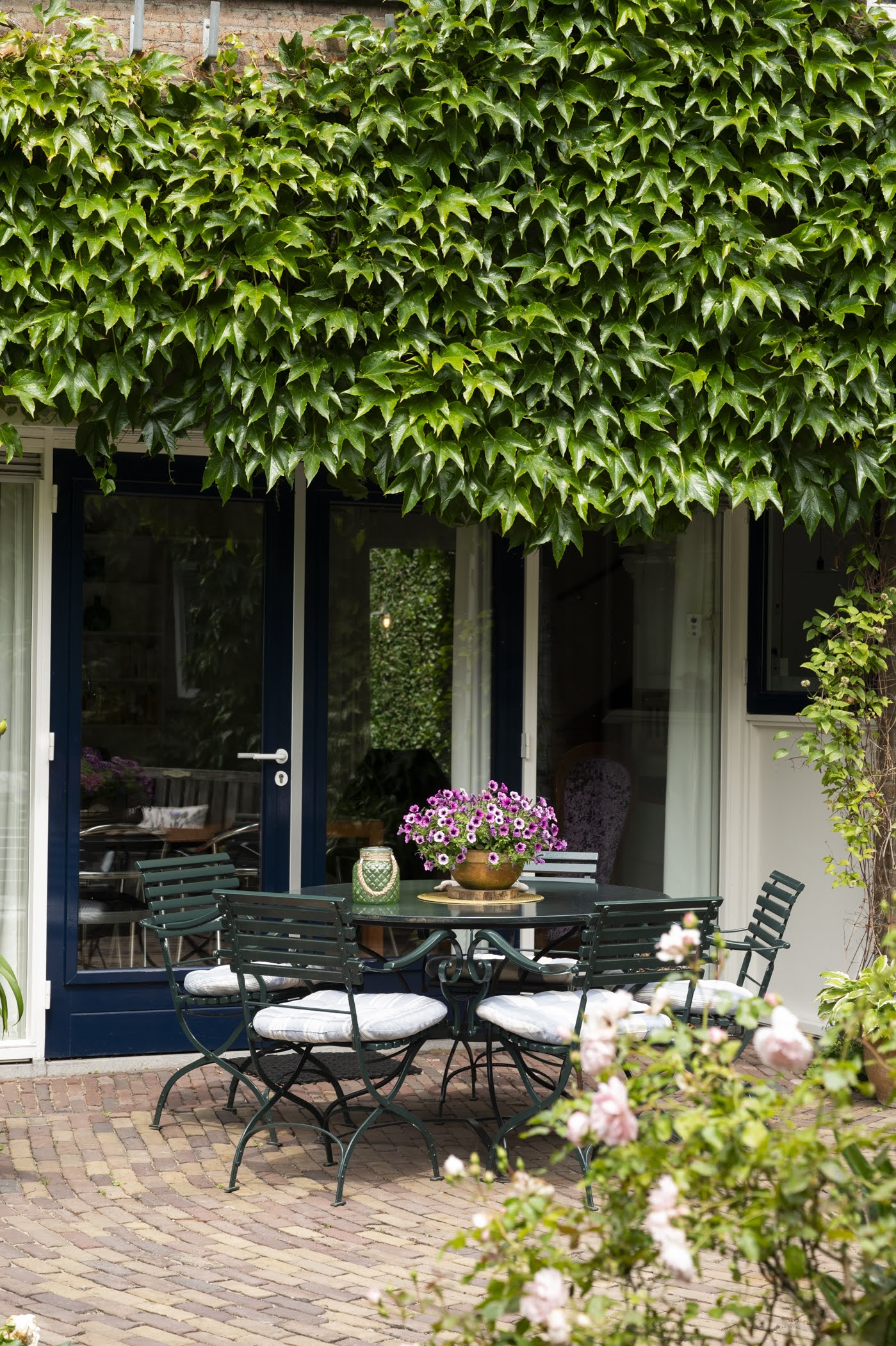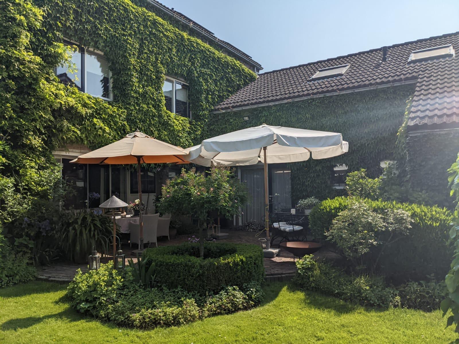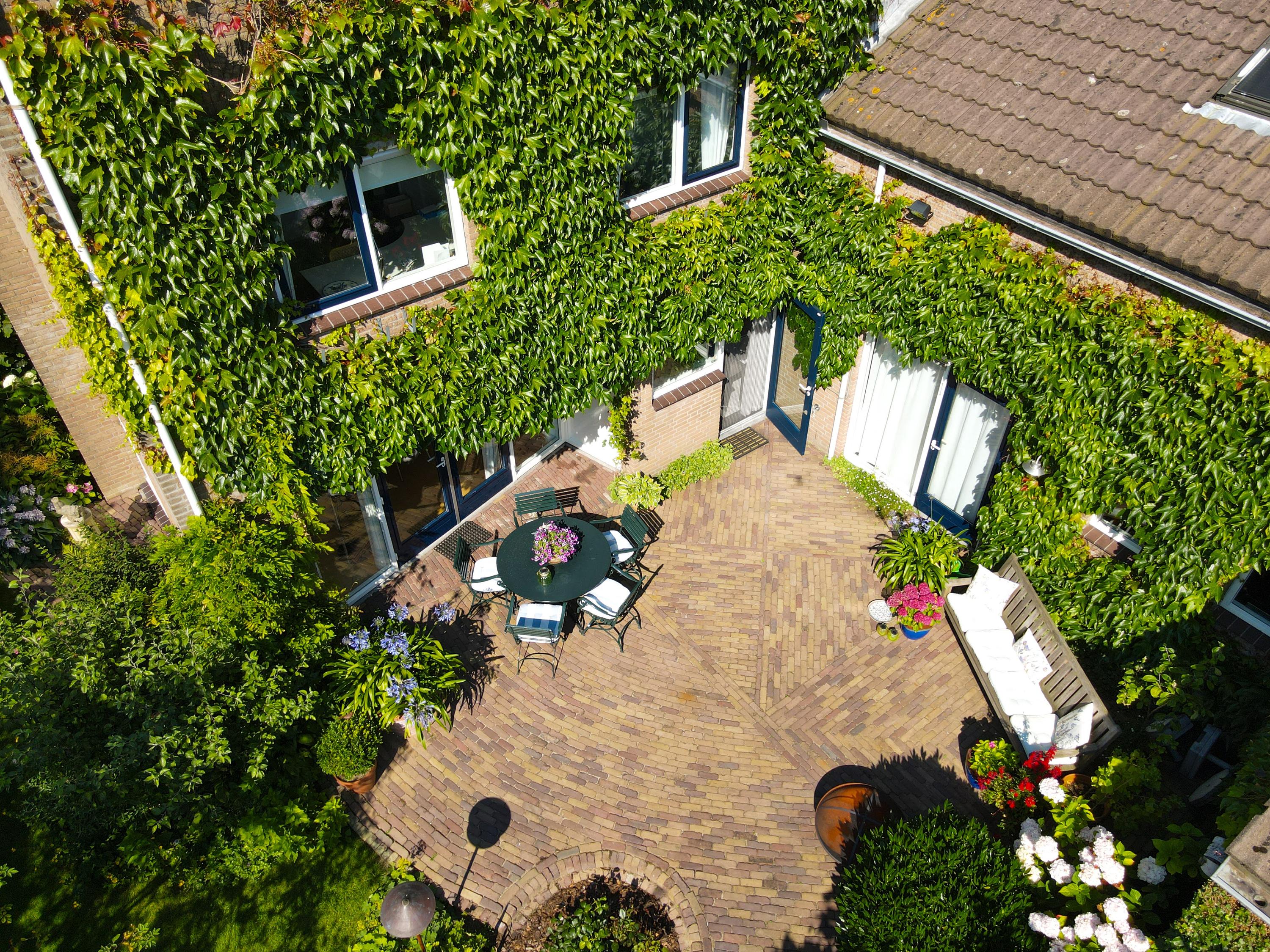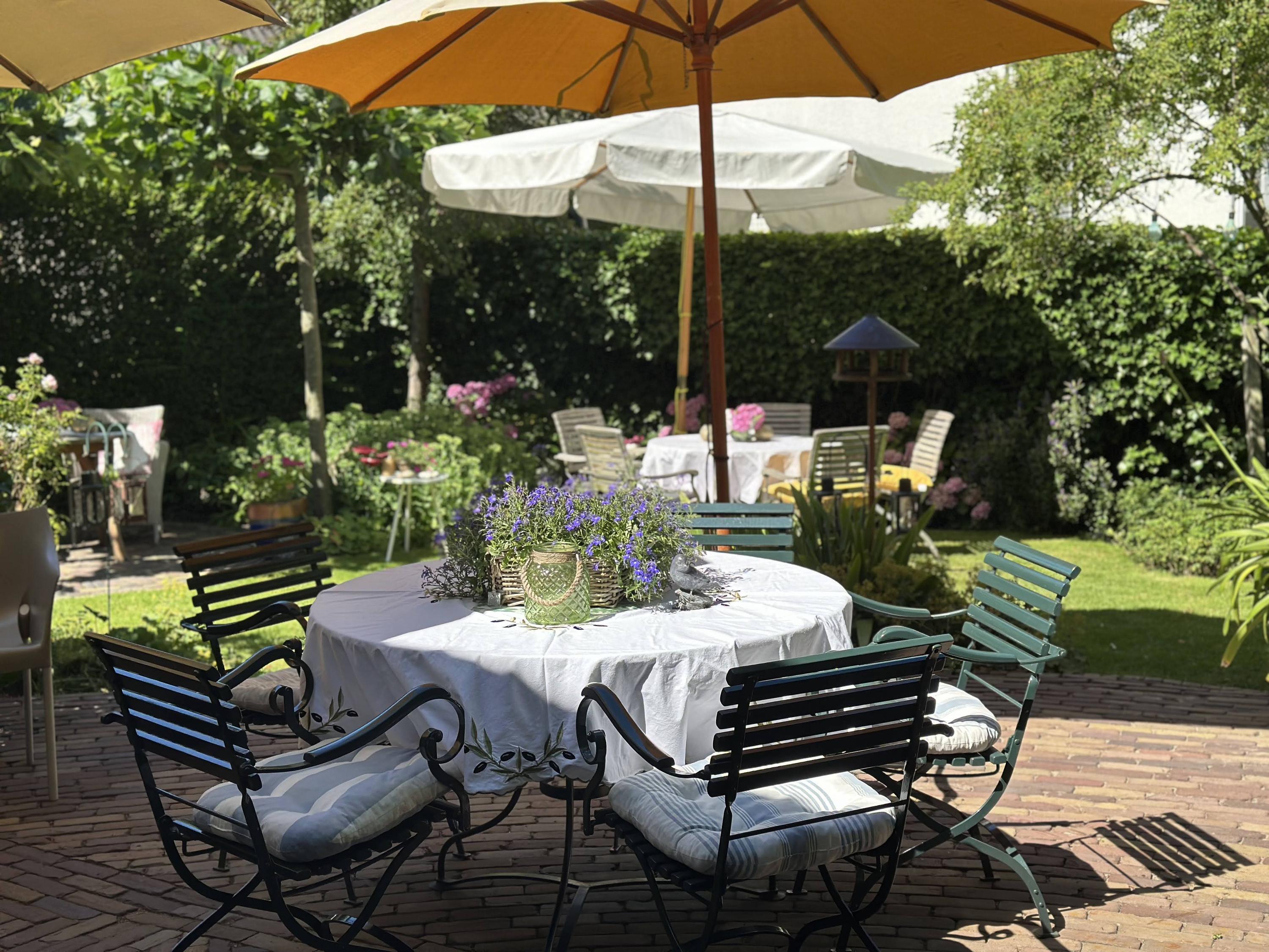 Beautifully landscaped all around, with the largest section facing southwest. Sunny, romantic, and full of flowers. Thanks to the various seating areas, there’s always a perfect spot to relax.