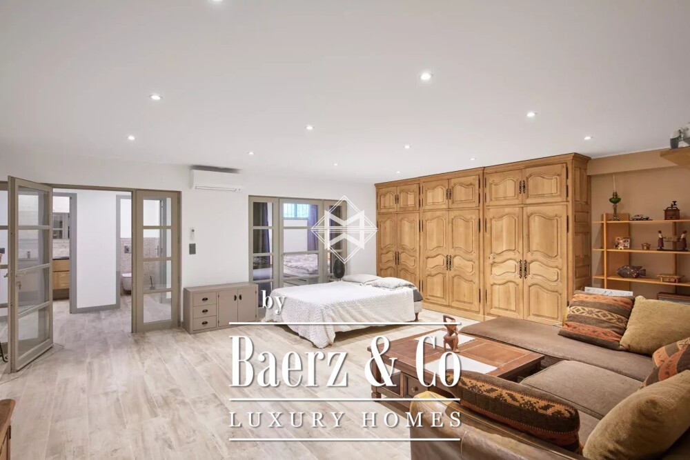 Five ensuite bedrooms assure privacy, including a notably generous parental suite. The main living, dining, and kitchen area offers a spacious rhythm for gatherings, complemented by a luminous office. Two contemporary rooftop terraces—one accessed from the suite, the other from the office—feature sun loungers and a jacuzzi, allowing for serene views of the sea and hills.