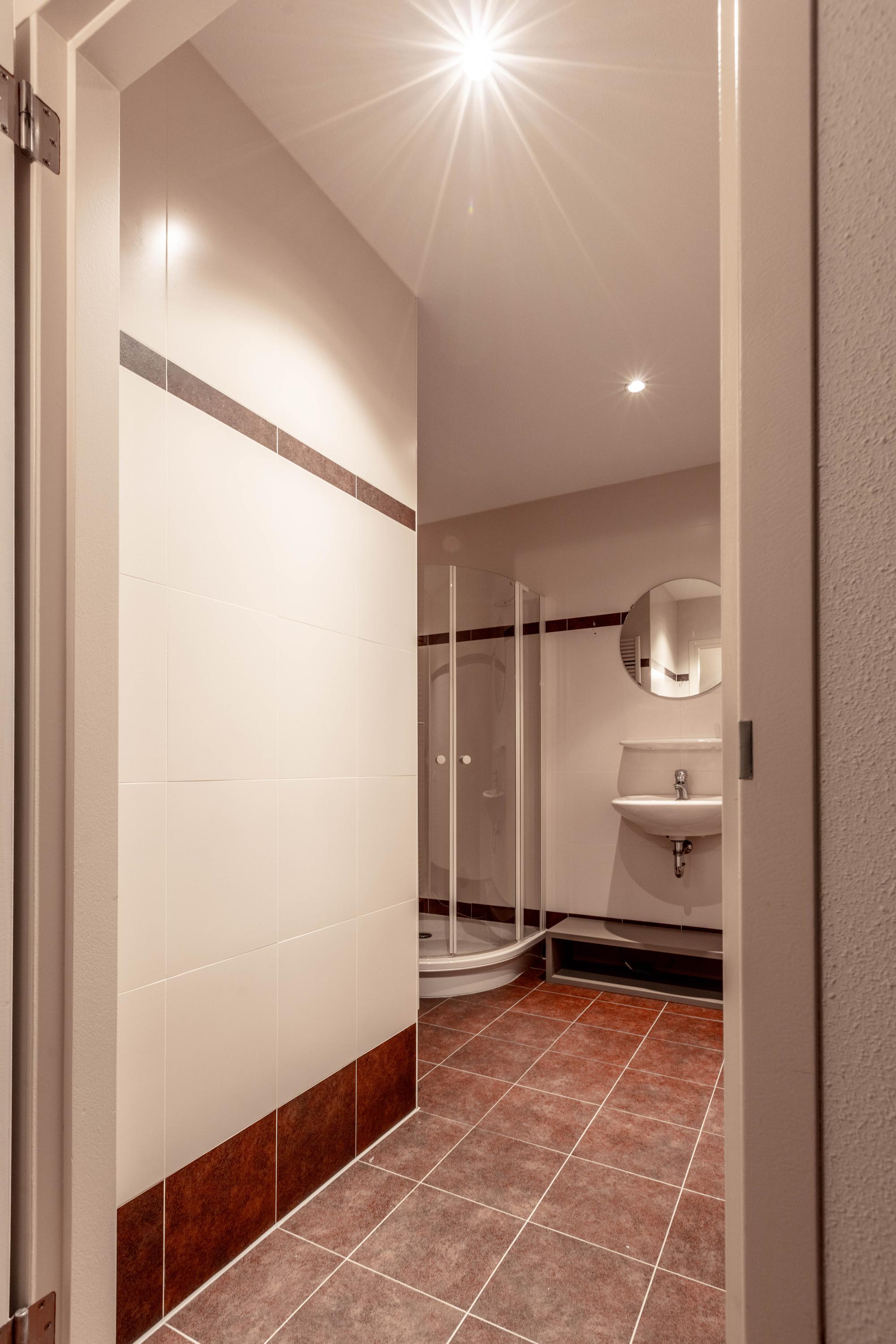 De tweede slaapkamer is ook voorzien van dakvensters en heeft eveneens een eigen badkamer met douche en wastafel.