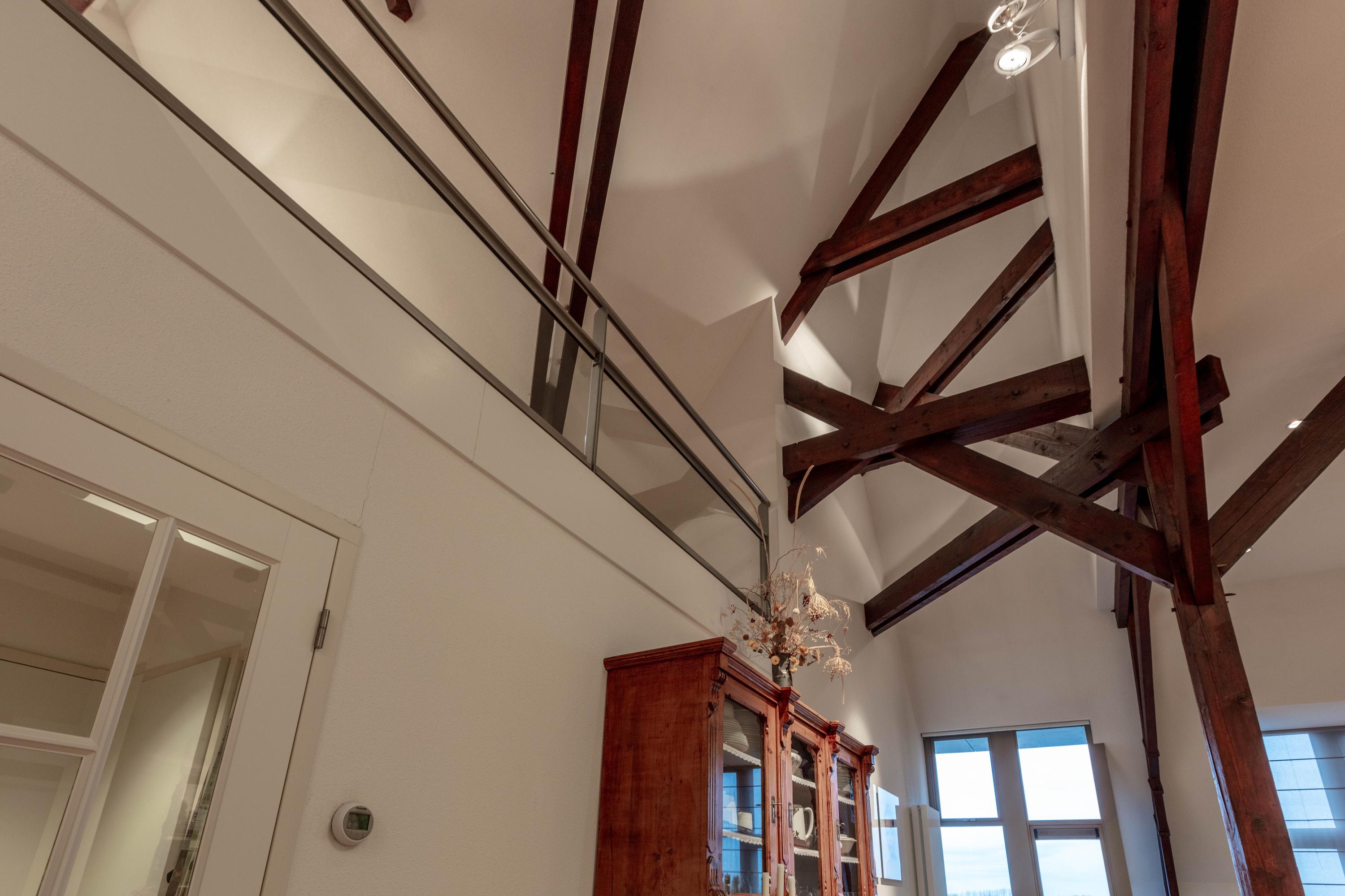 De bijzonder sfeervolle woonkamer is indrukwekkend door de unieke hoogte en fraaie zichtbare kapconstructie. De open keuken bevindt zich aan de achterzijde en beschikt over een kookeiland, volop kastruimte en diverse inbouwapparatuur. Vanuit de keuken is er prettig zicht op de woonkamer met een gezellig zitgedeelte en een apart eetgedeelte.