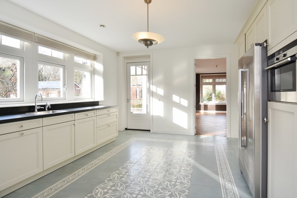 Entrance with wardrobe and meter cupboard. Spacious hallway with access to the study (3.80 x 3.40 m). Guest toilet. Living room with elegant herringbone parquet flooring and fireplace. Multiple French doors provide access to the surrounding garden. Large open-plan Siematic kitchen (4.18 x 5.30 m) equipped with an American-style fridge/freezer, 6-burner gas hob with oven, extractor hood, dishwasher, and a separate combi microwave/oven. Utility room with washing machine and dryer connections. Sunny, generous terrace (6.05 x 6.22 m).